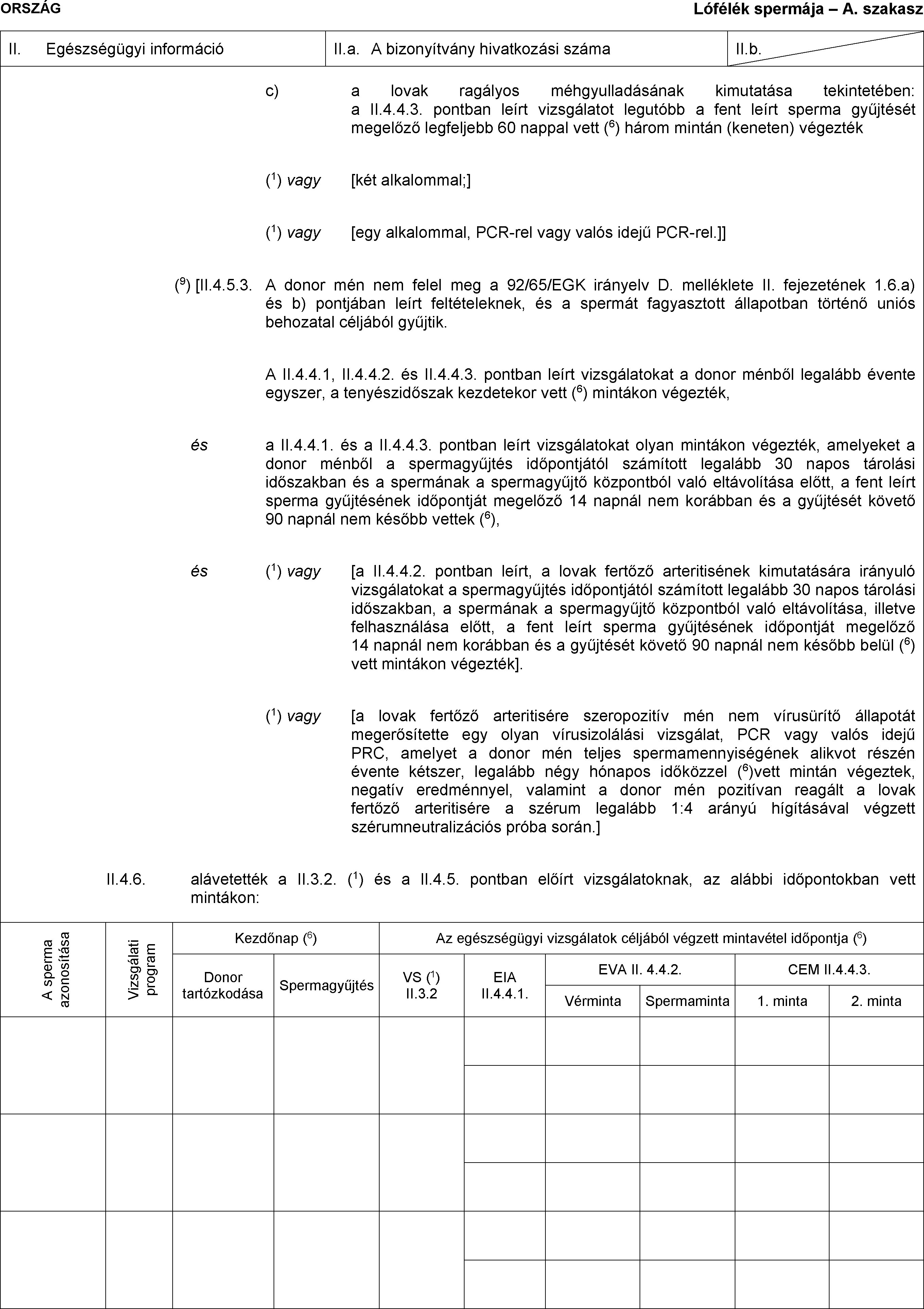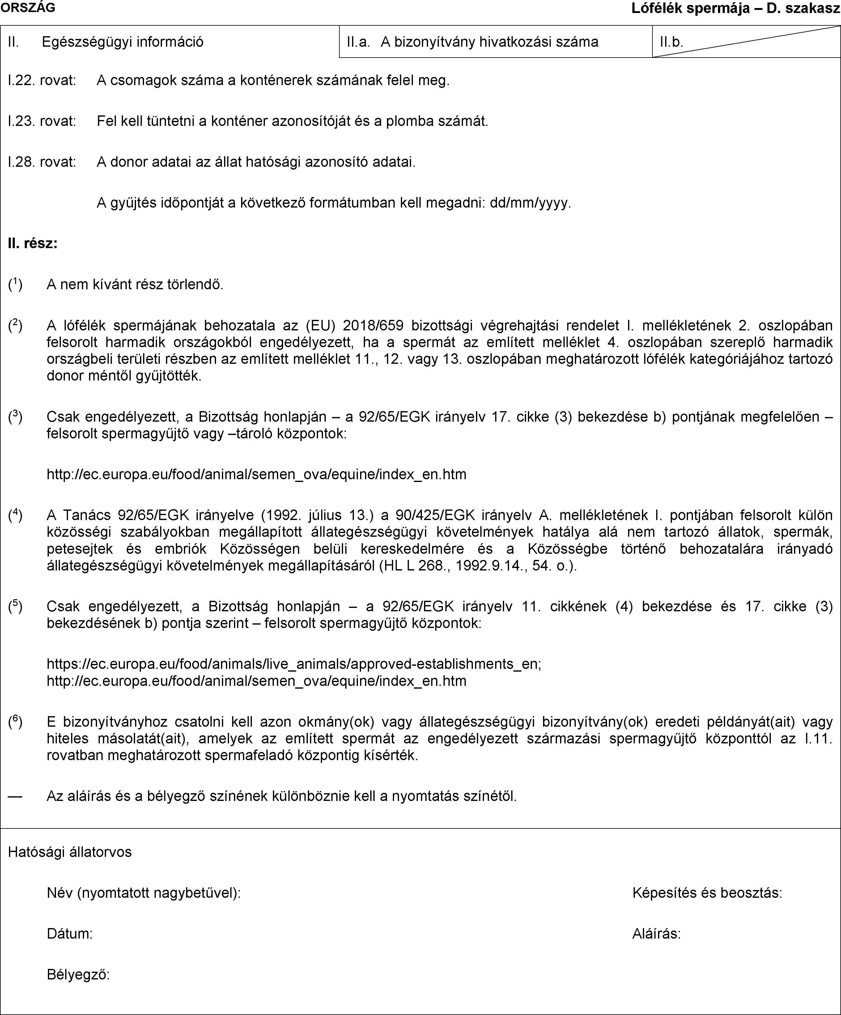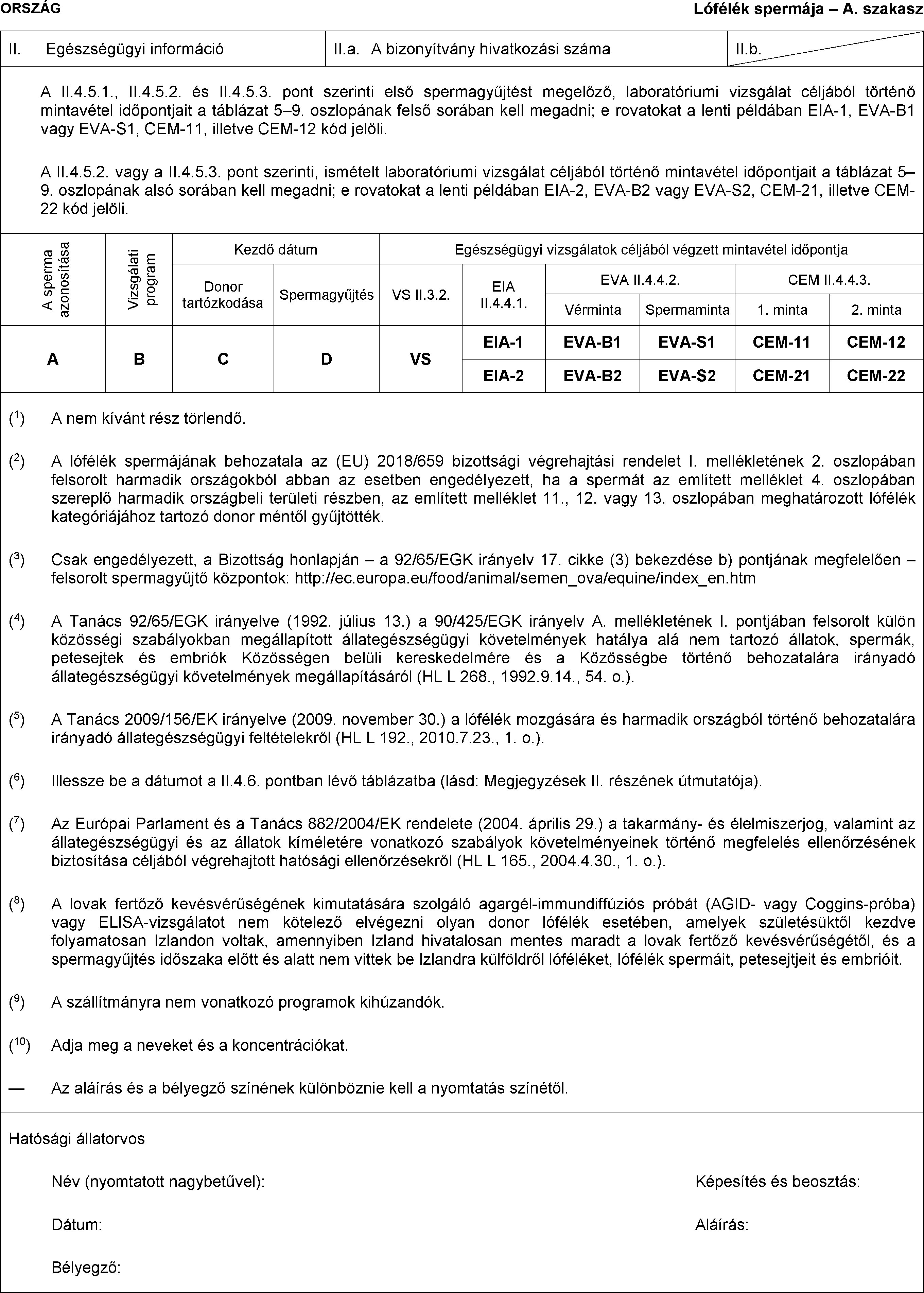 4. MINTA - Állategészségügyi bizonyítványminta a lófélék2014. szeptember 30. után a 92/65/EGK irányelvnek megfelelően gyűjtött, feldolgozott és tárolt, engedélyezett spermatároló központból feladott spermáját tartalmazó szállítmányok, valamint a lófélék 2010. augusztus 31. után és 2014. október 1. előtt vagy 2010. szeptember 1. előtt a 92/65/EGK tanácsi irányelvnek megfelelően gyűjtött, feldolgozott és tárolt, engedélyezett spermatároló központból 2010. augusztus 31. után feladott spermakészletei szállítmányainak behozatalához