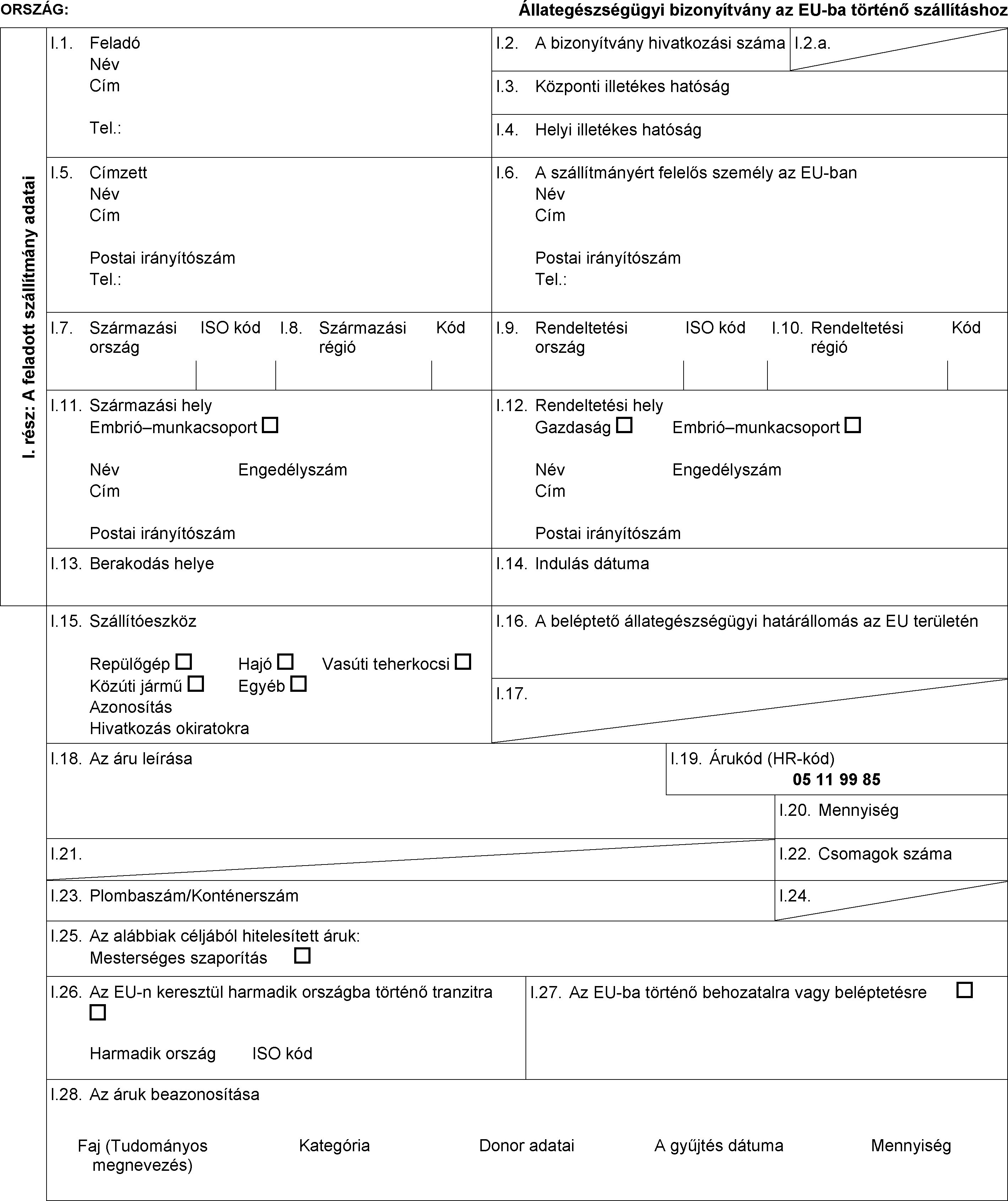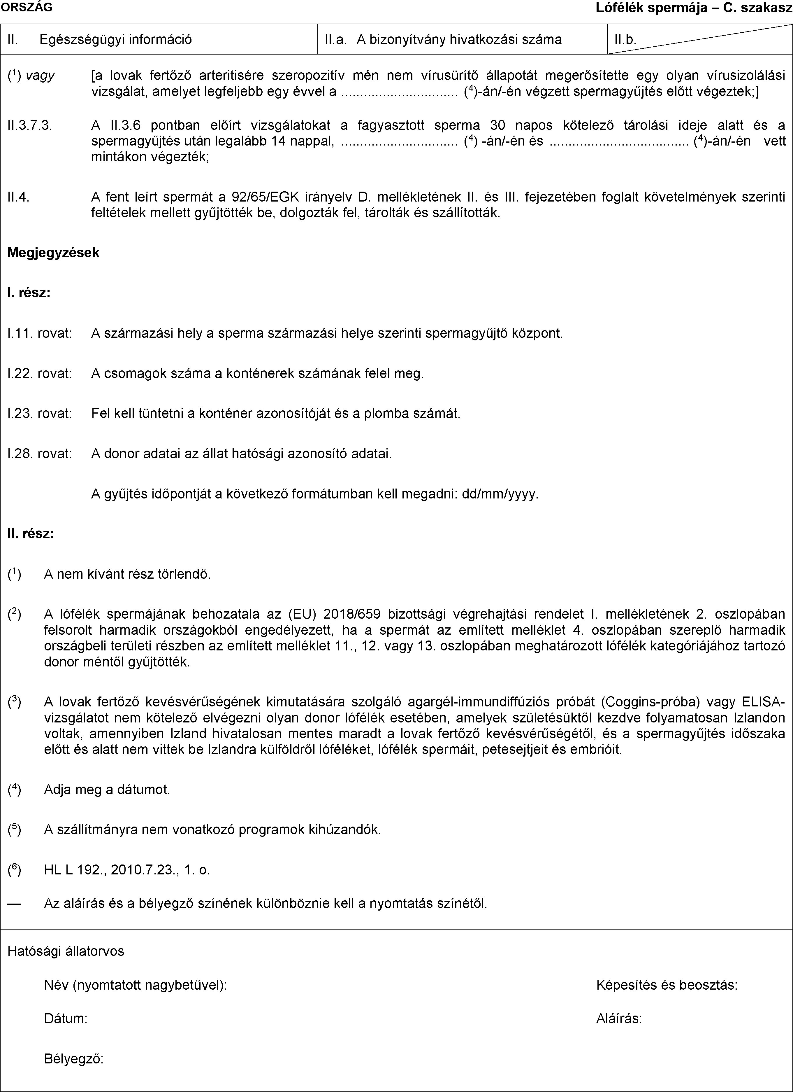 ÁLLATEGÉSZSÉGÜGYI BIZONYÍTVÁNYMINTÁK A LÓFÉLÉK SPERMÁJÁNAK, PETESEJTJEINEK ÉS EMBRIÓINAK AZ UNIÓBA TÖRTÉNŐ BELÉPÉSÉHEZ