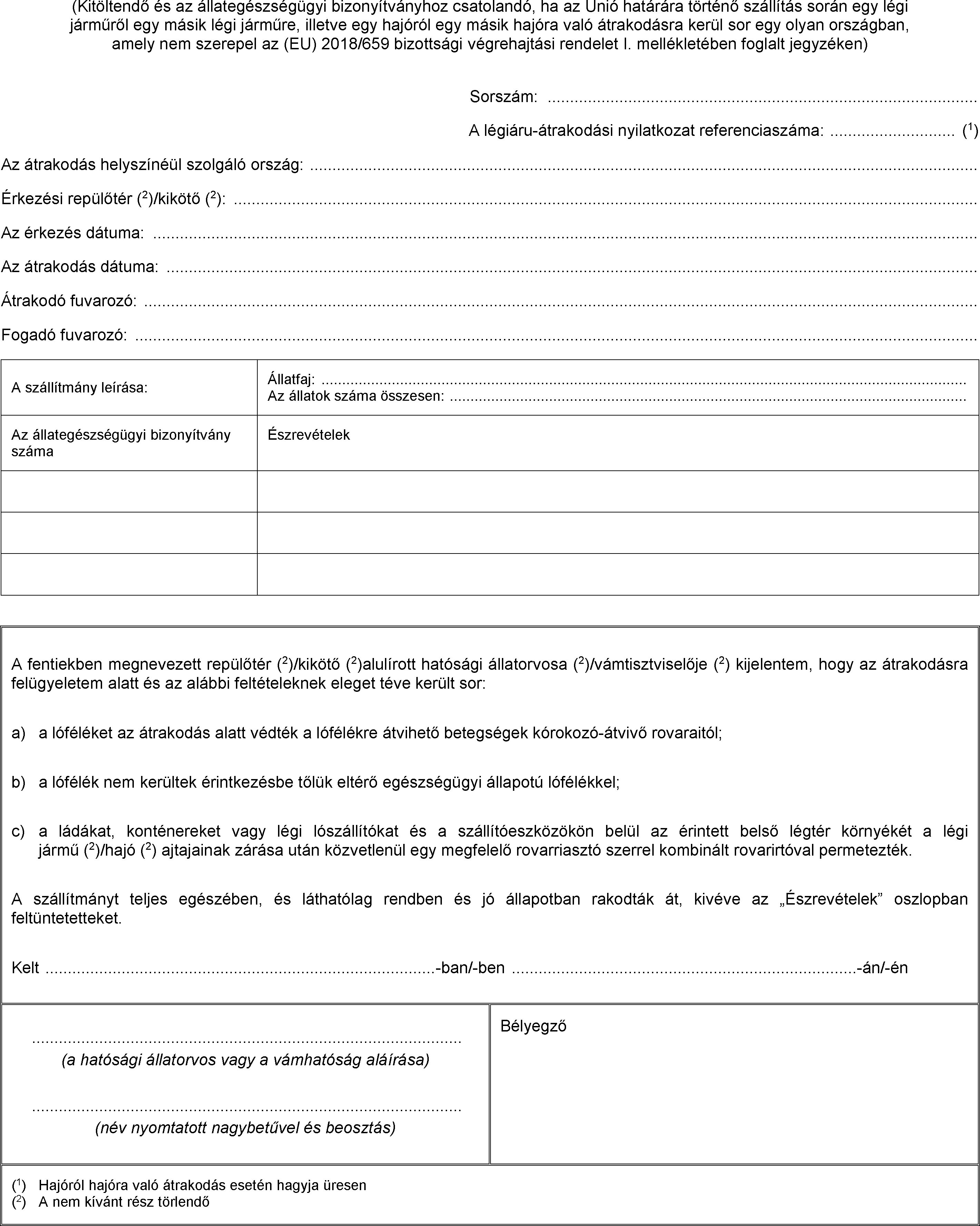 e) az (1) bekezdés a) pontjában és az e bekezdés a), b) és c) pontjában foglalt feltételeknek való megfelelést a hatósági állatorvos vagy a felelős vámtisztviselő az V. melléklet 3. részében szereplő mintának megfelelően kiállított átrakodási nyilatkozatban igazolja.