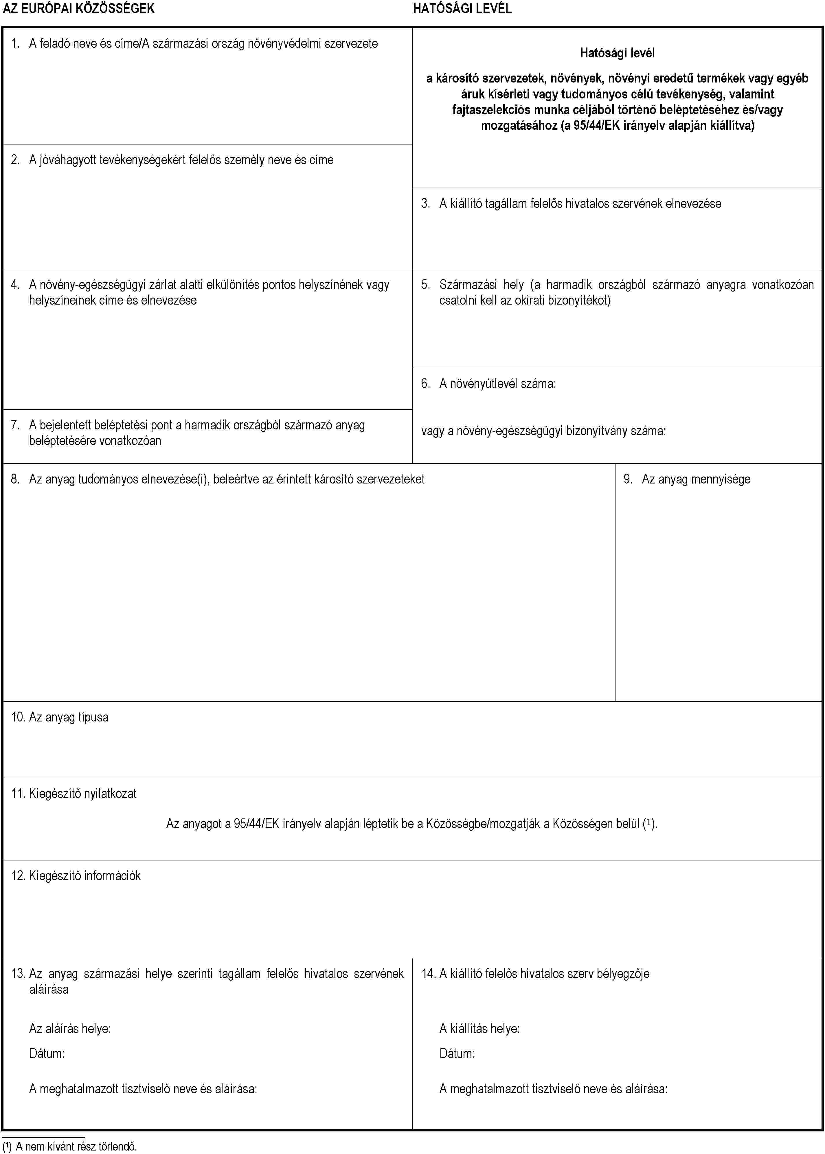 A növény-egészségügyi bizonyítvány "Kiegészítő nyilatkozat" rovatának tartalmaznia kell a következő jelölést: "Az anyag behozatala a 95/44/EK irányelv alapján történik". Adott esetben a vonatkozó károsító szervezetet vagy szervezeteket is meg kell határozni.