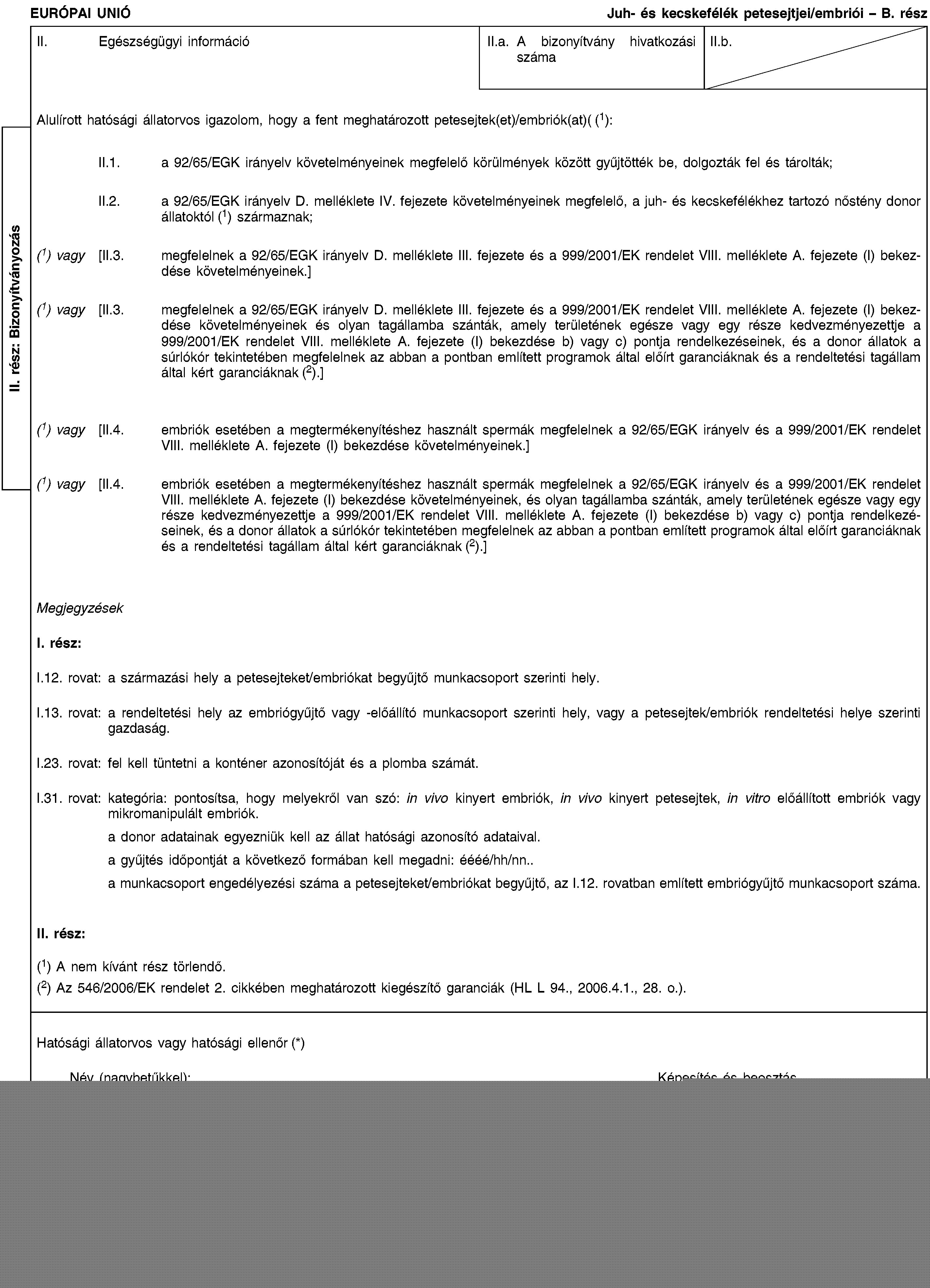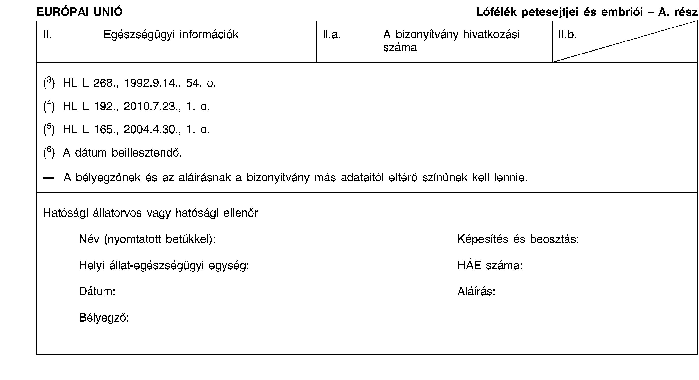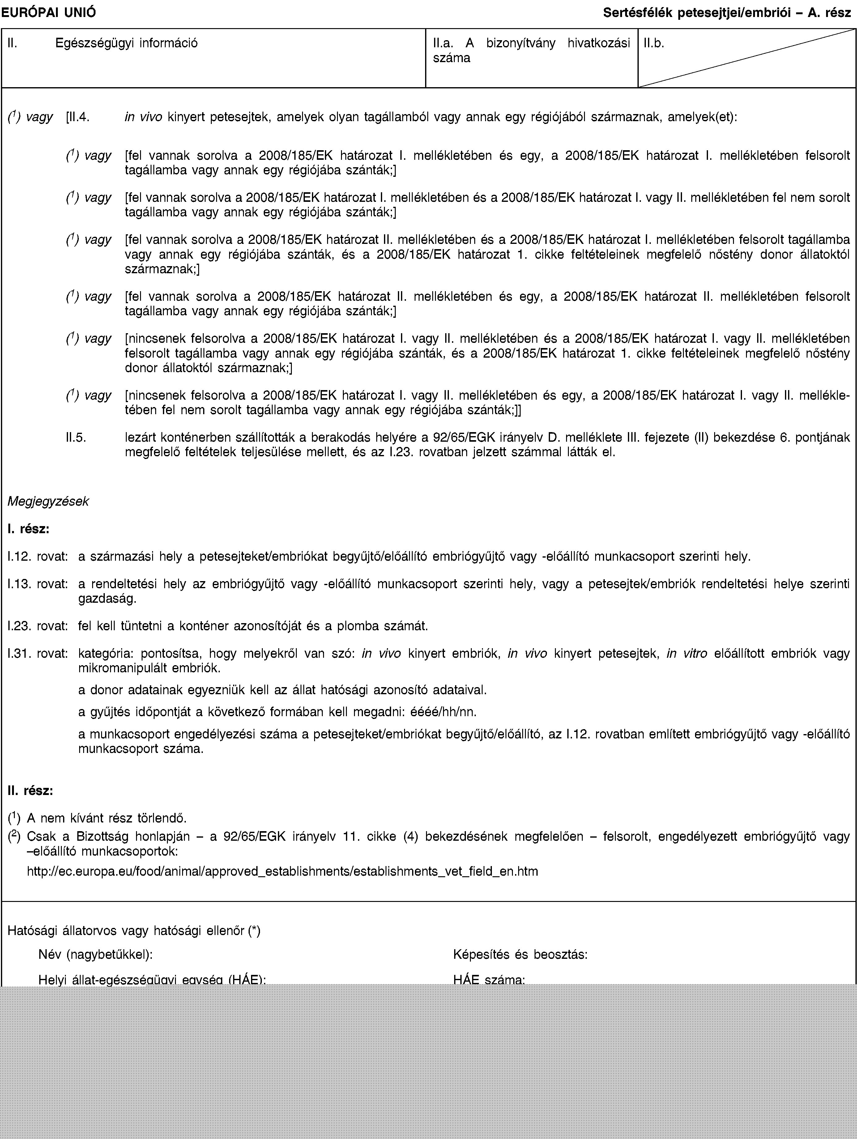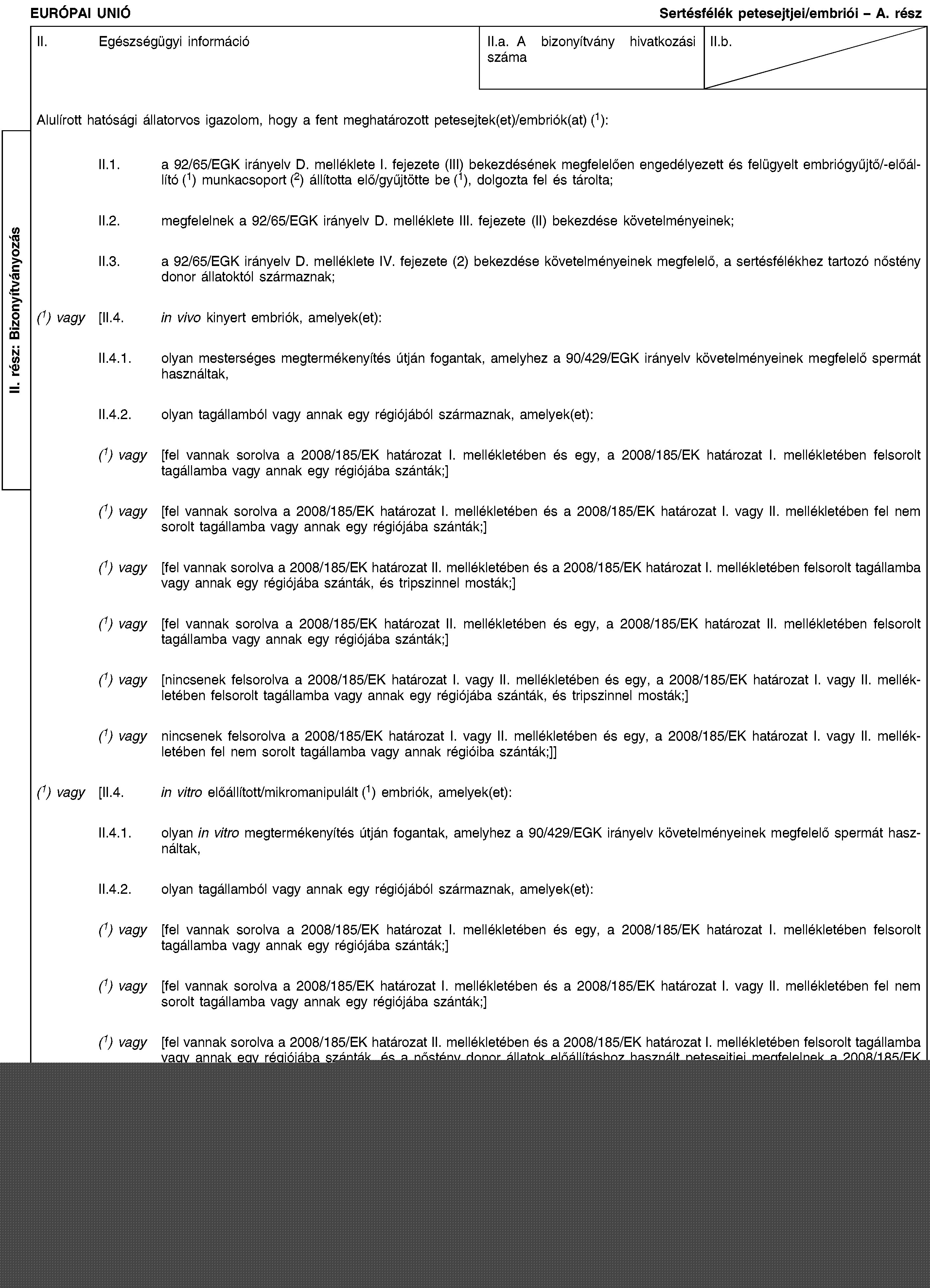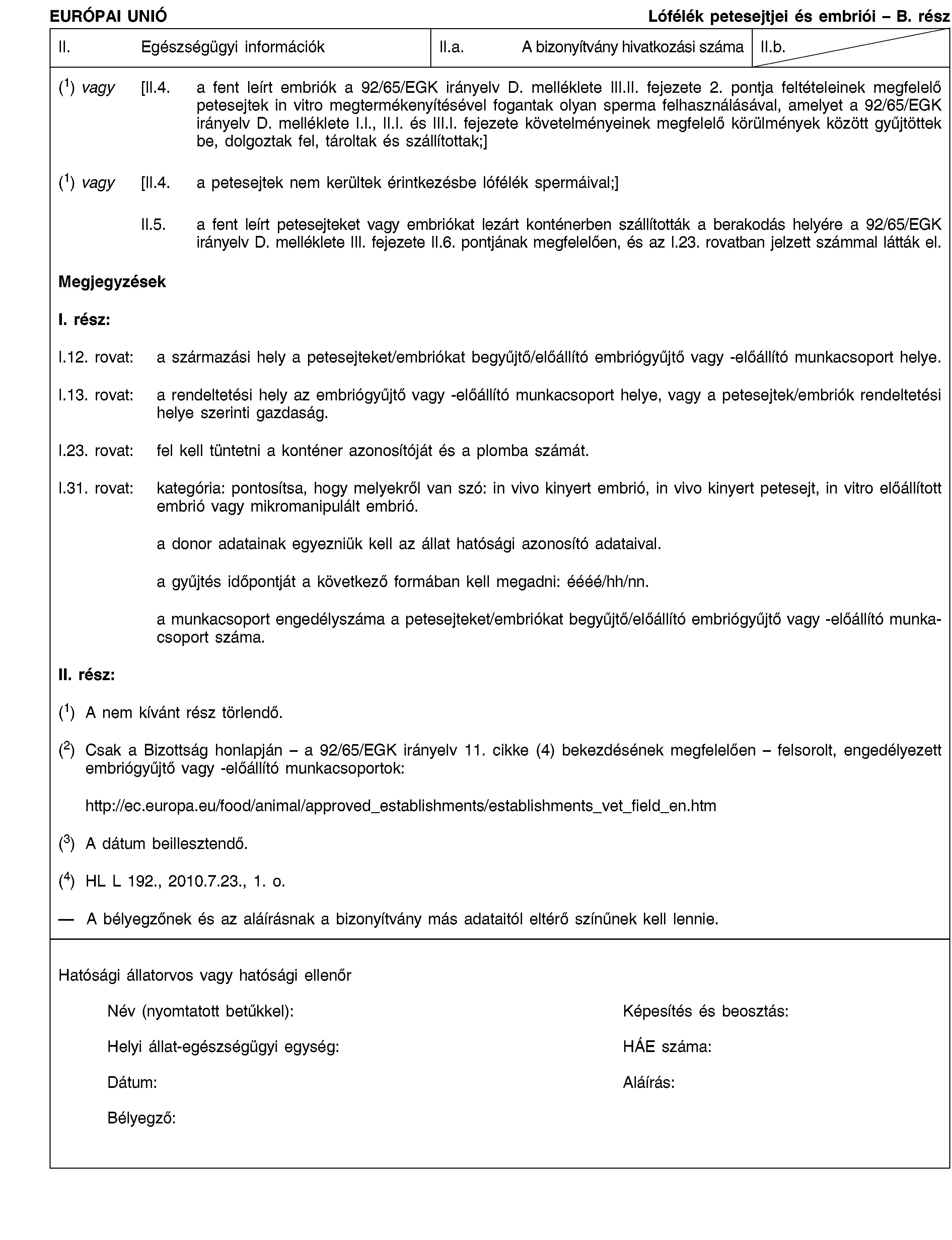IIB. állat-egészségügyi bizonyítványminta a lófélékhez tartozó állatok 2010. augusztus 31. után és 2014. október 1. előtt a 92/65/EGK irányelvnek megfelelően gyűjtött, feldolgozott és tárolt, és a petesejtek, illetve embriók származási helye szerinti, engedélyezett embriógyűjtő vagy -előállító munkacsoport által 2010. augusztus 31. után feladott petesejt- és embriókészletei szállítmányainak Unión belüli kereskedelméhez