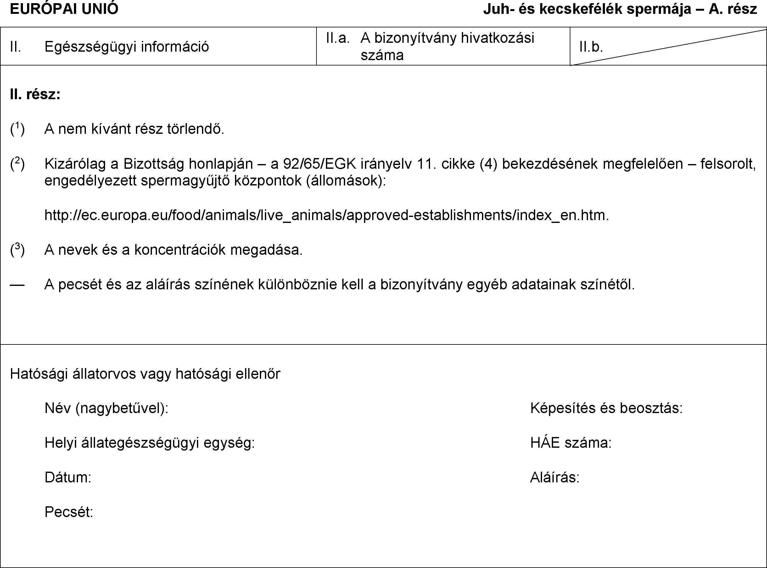 IIIA. állategészségügyi bizonyítványminta a juh- és kecskefélékhez tartozó állatok 2010. augusztus 31-ét követően a 92/65/EGK tanácsi irányelvnek megfelelően gyűjtött és a sperma származási helye szerinti, engedélyezett spermagyűjtő központból (állomásról) feladott spermáit tartalmazó szállítmányok Unión belüli kereskedelméhez