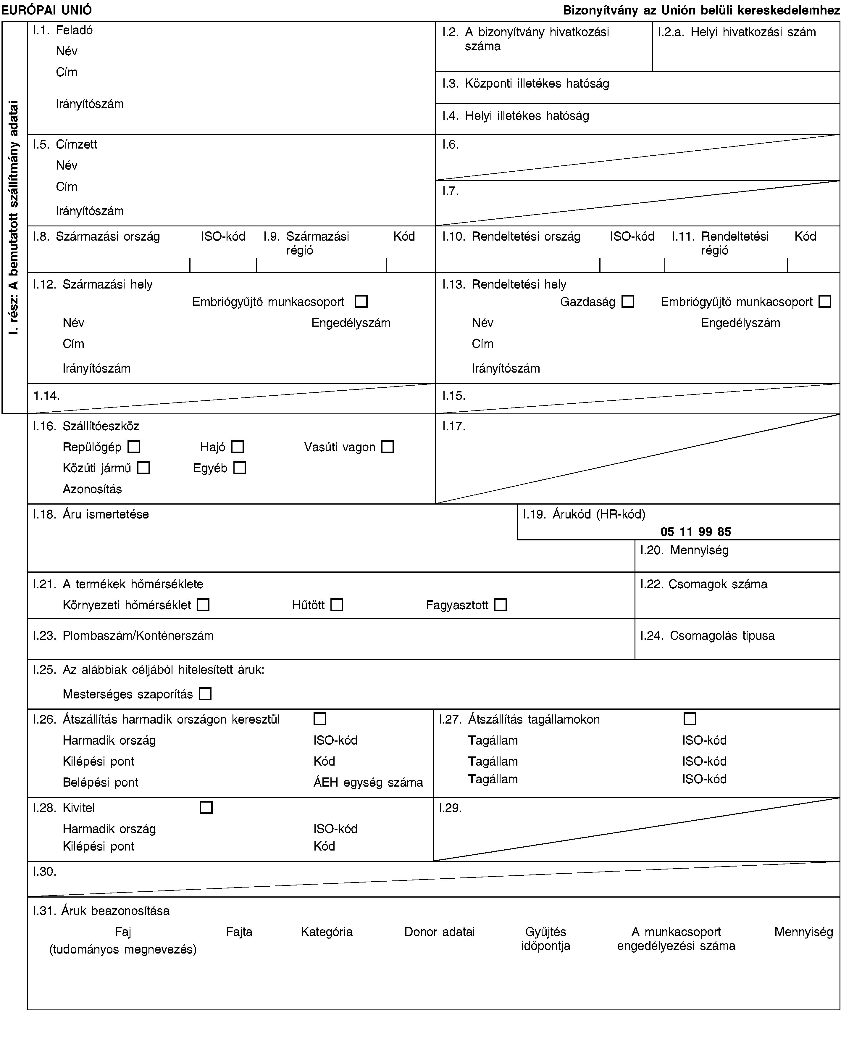 A lófélékhez tartozó állatok spermaszállítmányait az egyik tagállamból egy másikba történő szállítás során az I. mellékletben meghatározott alábbi állat-egészségügyi bizonyítványminták egyikének kell kísérnie: