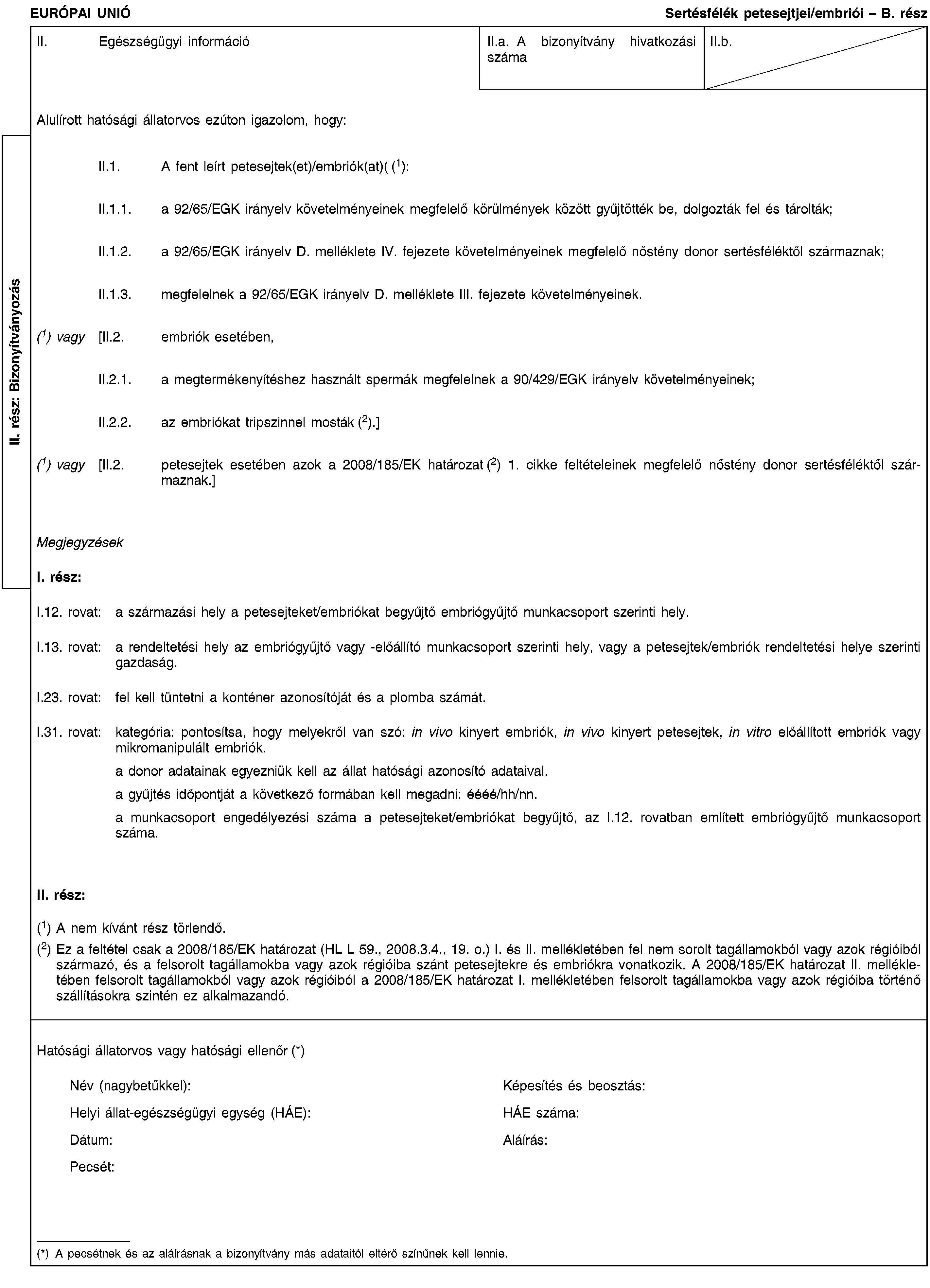 b) IIB. állat-egészségügyi bizonyítványminta a lófélékhez tartozó állatok 2010. augusztus 31. után és 2014. október 1. előtt a 92/65/EGK irányelvnek megfelelően gyűjtött, feldolgozott és tárolt és a petesejtek, illetve embriók származási helye szerinti, engedélyezett embriógyűjtő vagy -előállító munkacsoport által 2010. október 31. után feladott petesejt- és embriókészletei szállítmányainak Unión belüli kereskedelméhez;