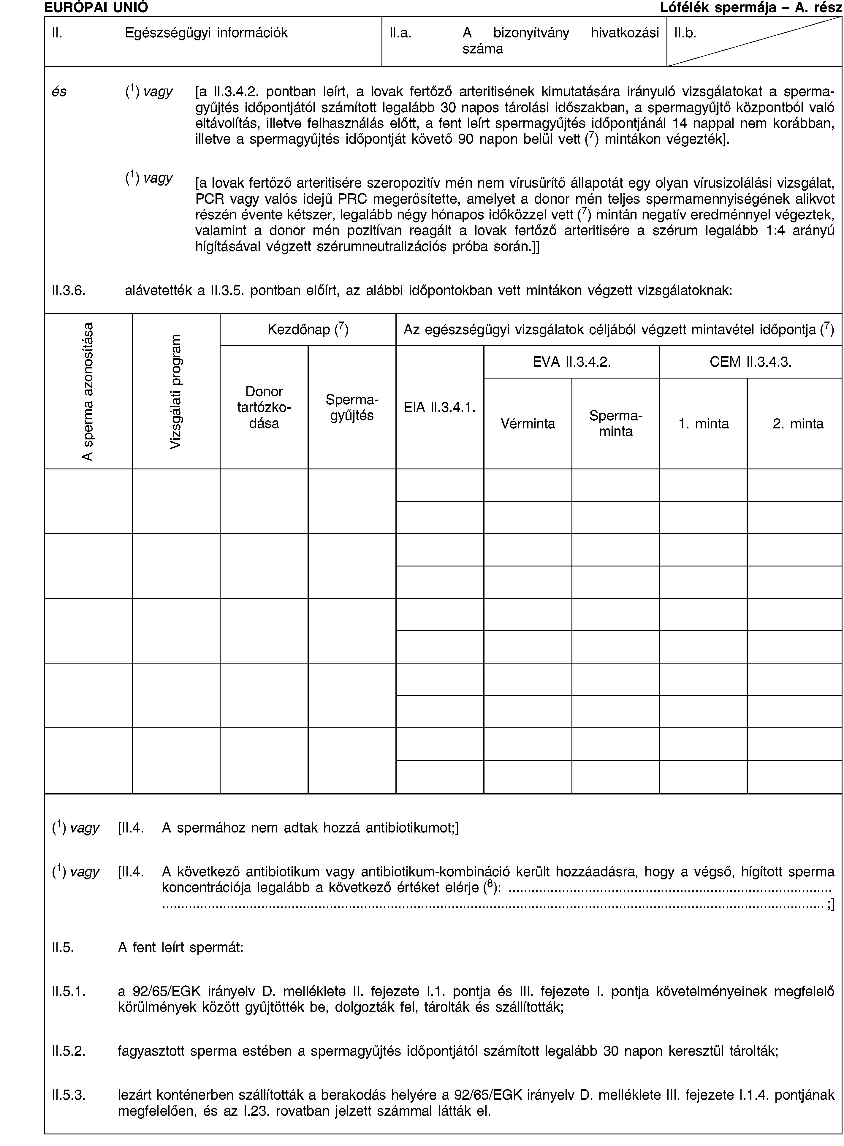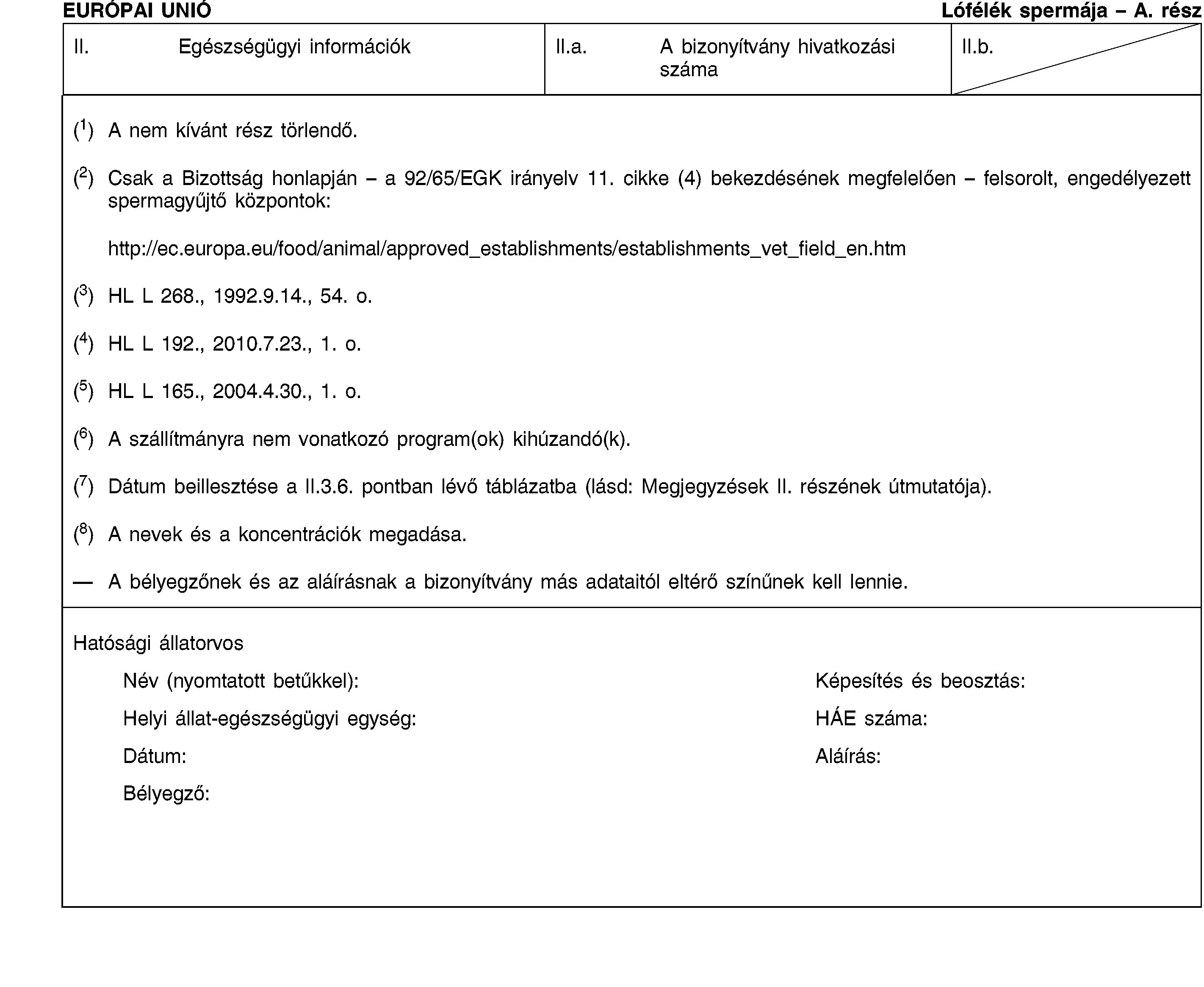 ID. állat-egészségügyi bizonyítványminta a lófélékhez tartozó állatok 2014. szeptember 30. után a 92/65/EGK irányelvnek megfelelően gyűjtött, feldolgozott és tárolt, és engedélyezett spermatároló központból feladott spermája, valamint a 2010. augusztus 31. után és 2014. október 1. előtt vagy 2010. szeptember 1. előtt a 92/65/EGK tanácsi irányelvnek megfelelően gyűjtött, feldolgozott és tárolt, és engedélyezett spermatároló központból 2010. augusztus 31. után feladott spermakészletei szállítmányainak Unión belüli kereskedelméhez