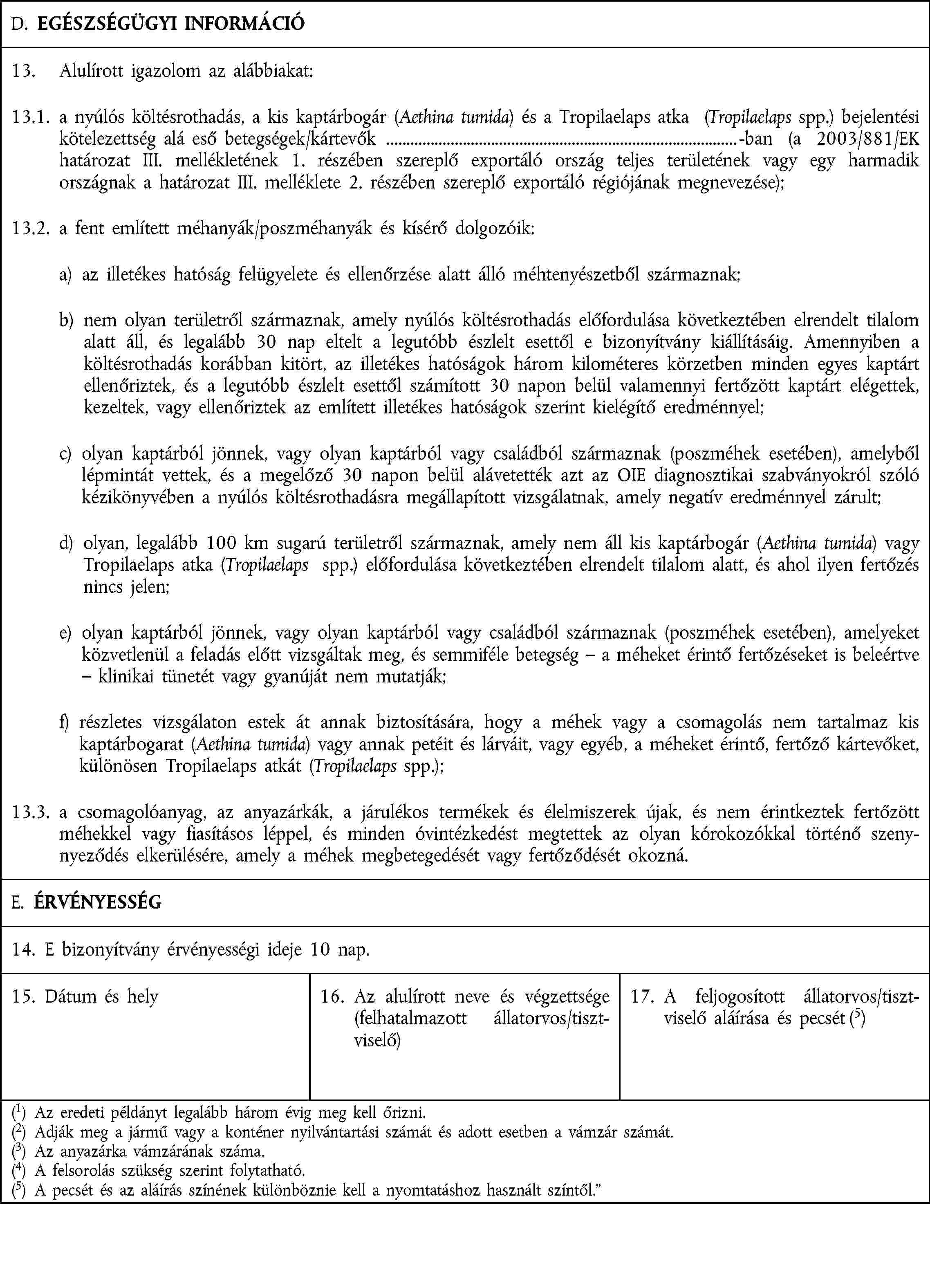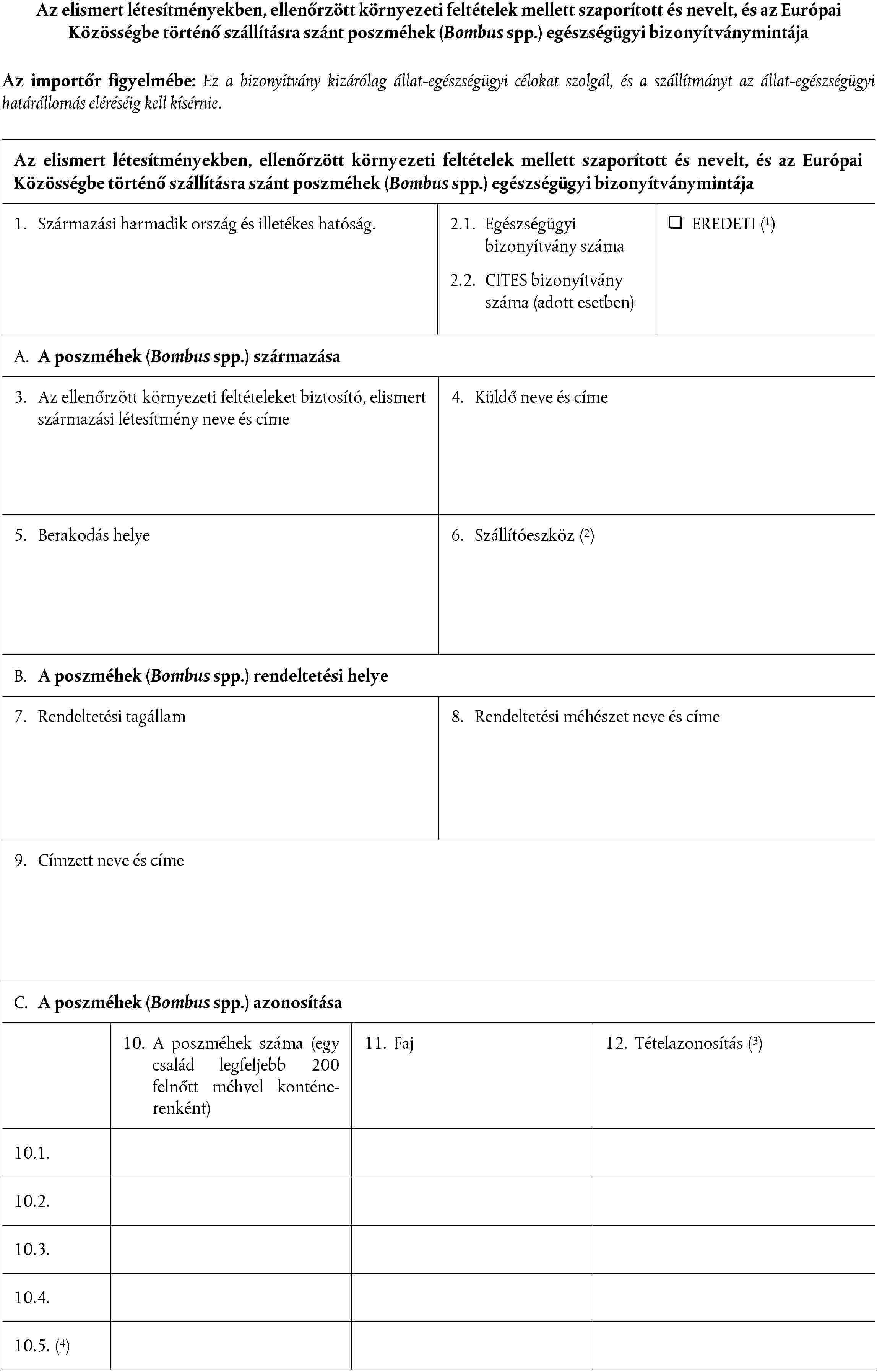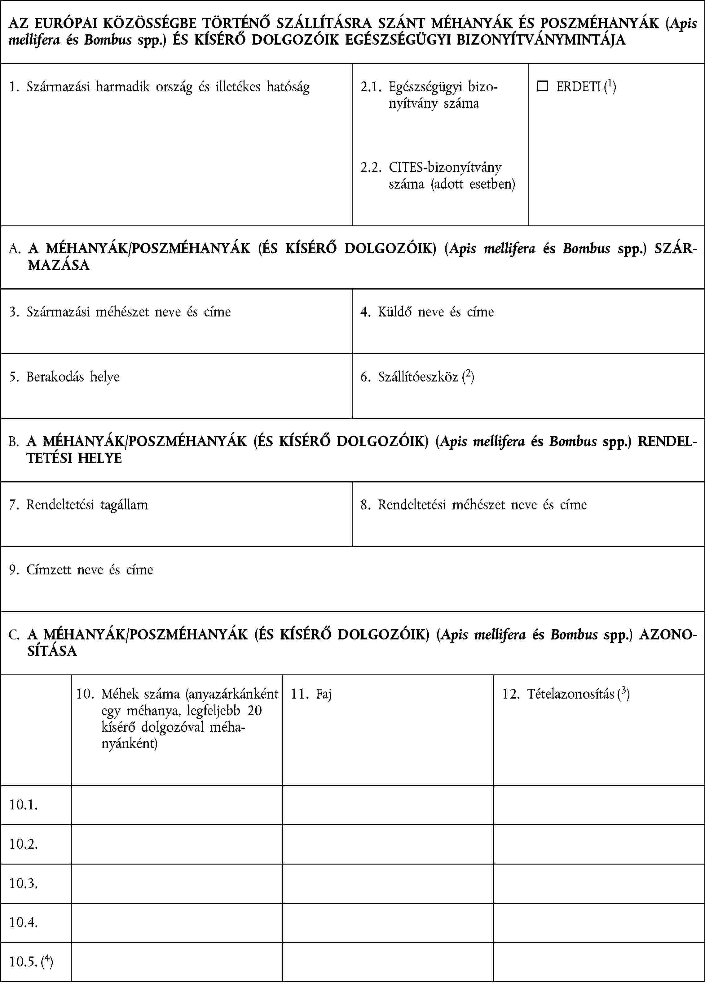 az Európai Közösségbe történő szállításra szánt méhanyák és poszméhanyák (Apis mellifera és Bombus spp.) és kísérő dolgozóik egészségügyi bizonyítványmintája