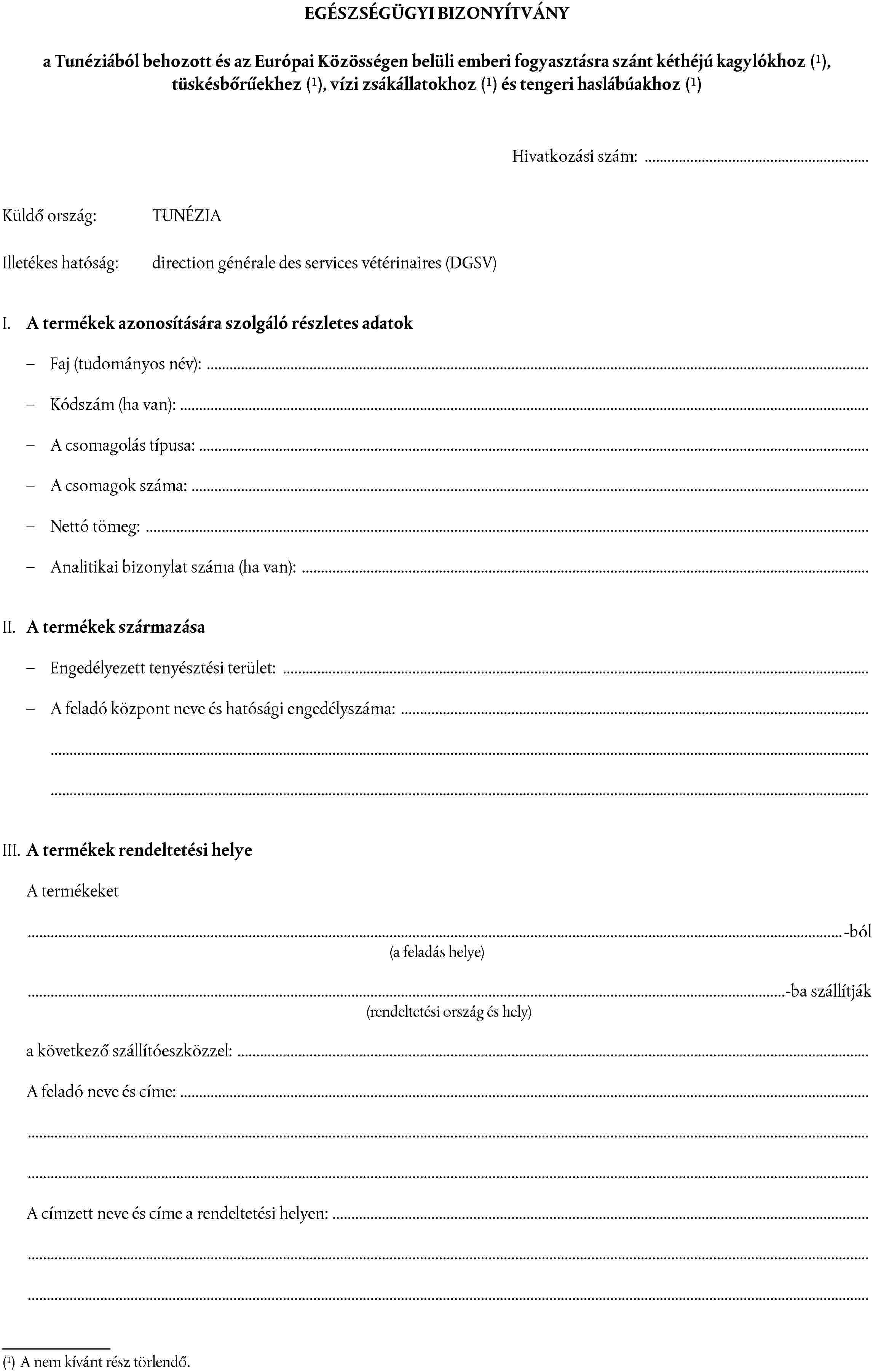 Tunéziában a "Direction générale des services vétérinaires (DGSV)" lesz az az illetékes hatóság, amelyik ellenőrzi és igazolja az élő kéthéjú kagylóknak, tüskésbőrűeknek, vízi zsákállatoknak és tengeri haslábúaknak a 91/493/EGK irányelv követelményeinek történő megfelelését.