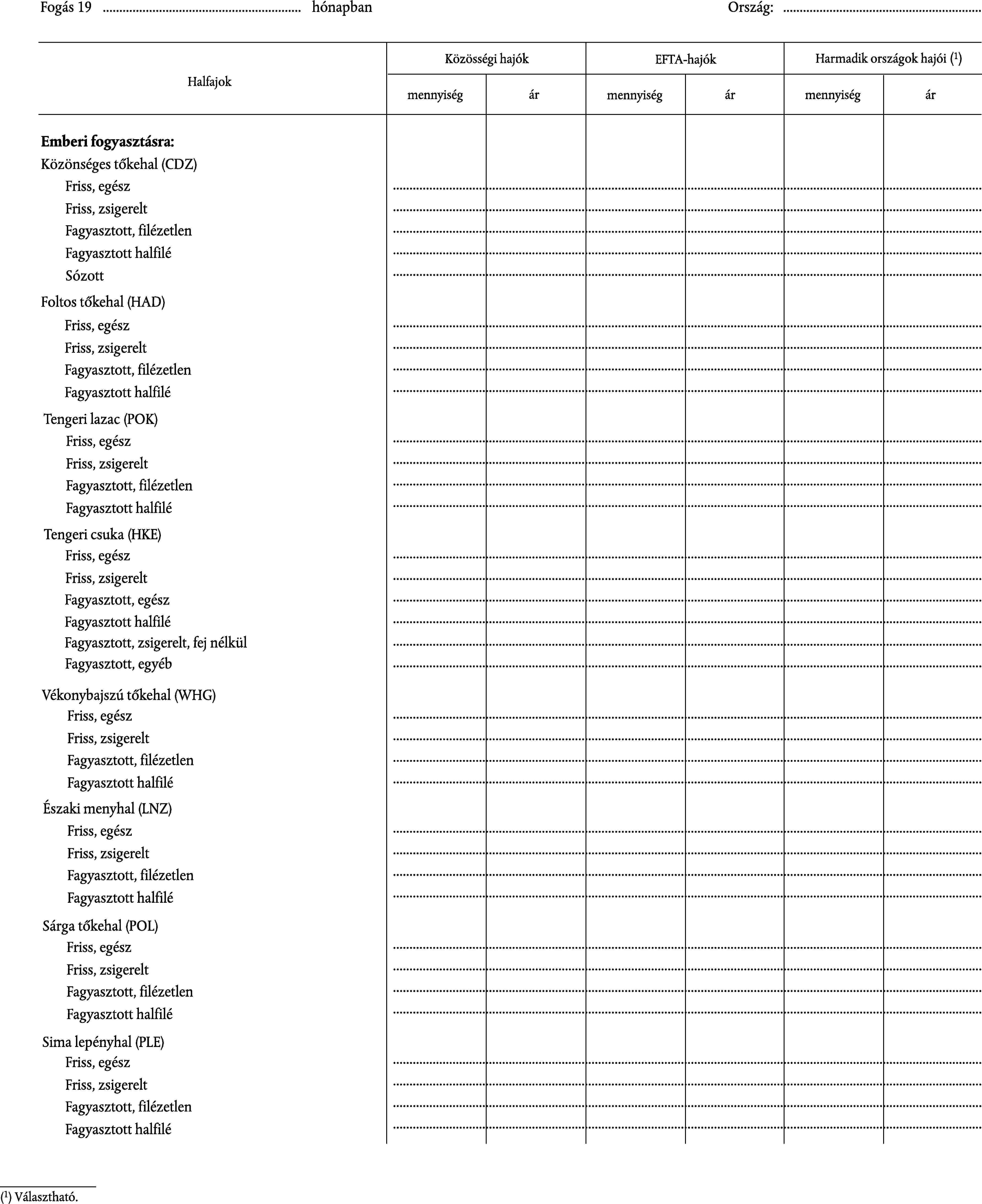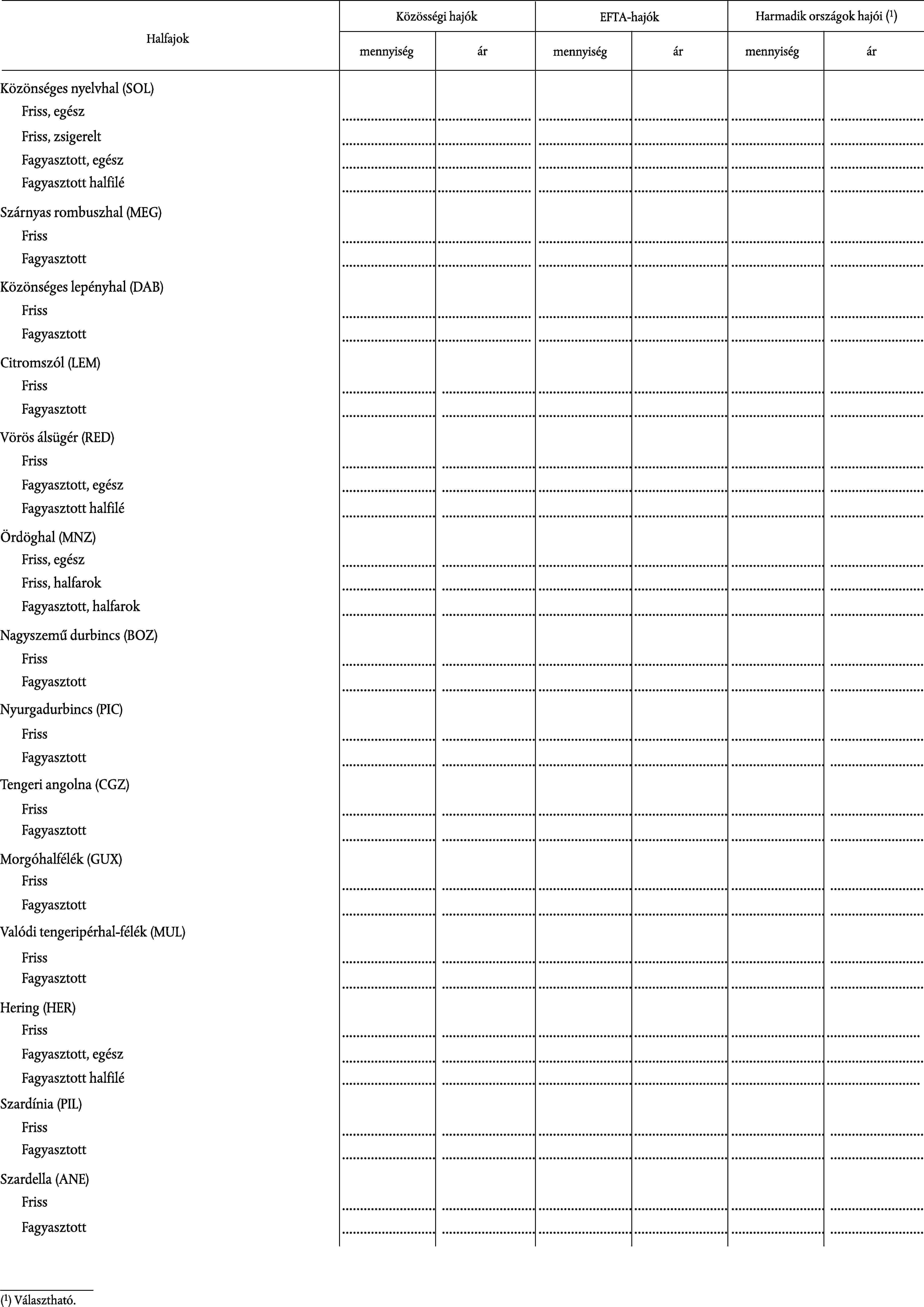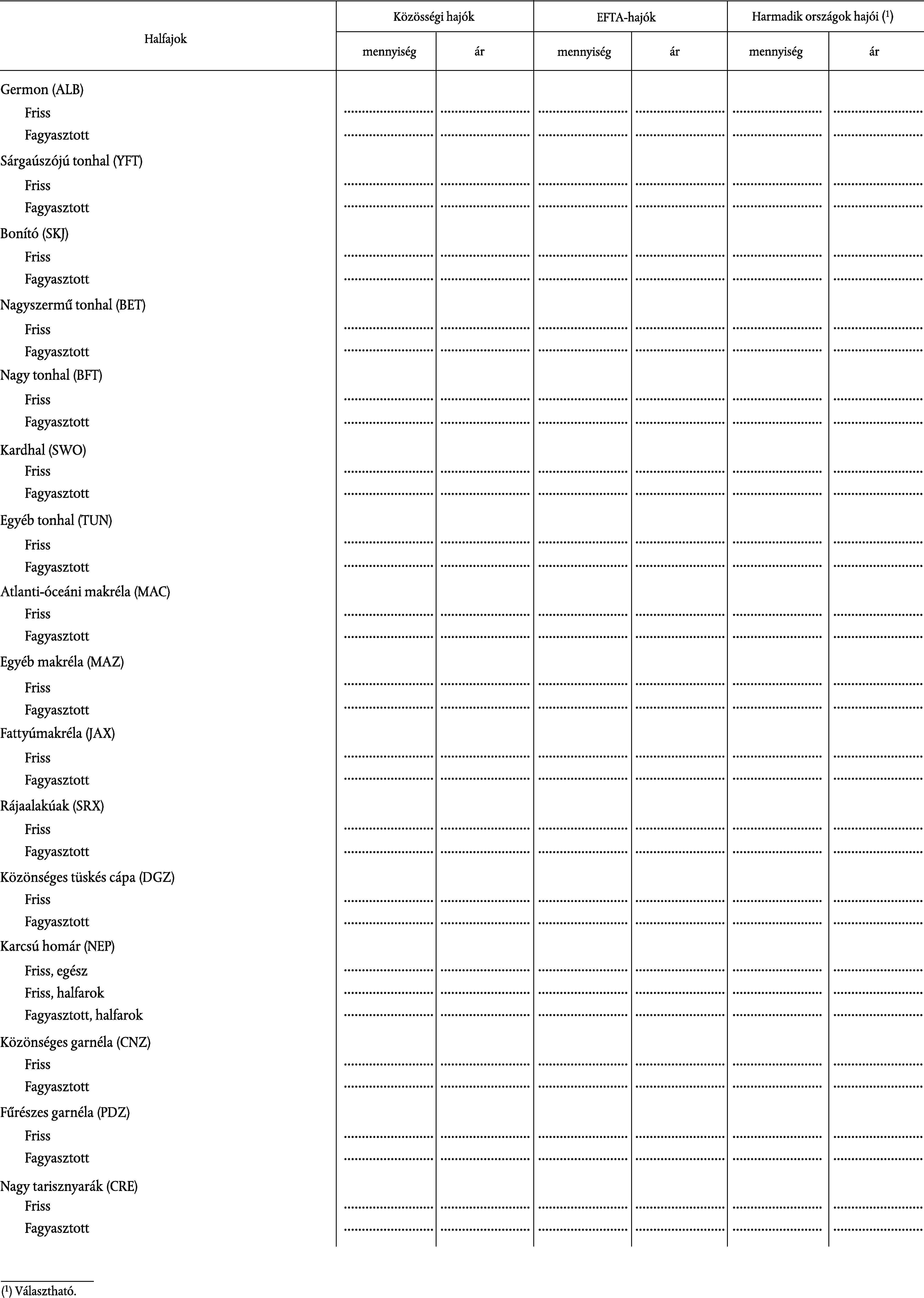 9–11 | Fajok | 3 karakterből álló betűkód (pl.: CDZ = atlanti-óceáni tőkehal) |
