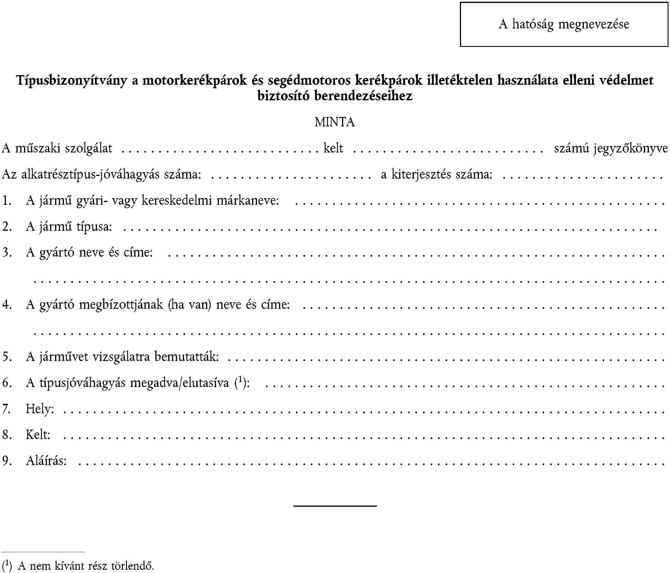 Adatközlő lap a motorkerékpárok és segédmotoros kerékpárok illetéktelen használata elleni védelmet biztosítóberendezéseihez
