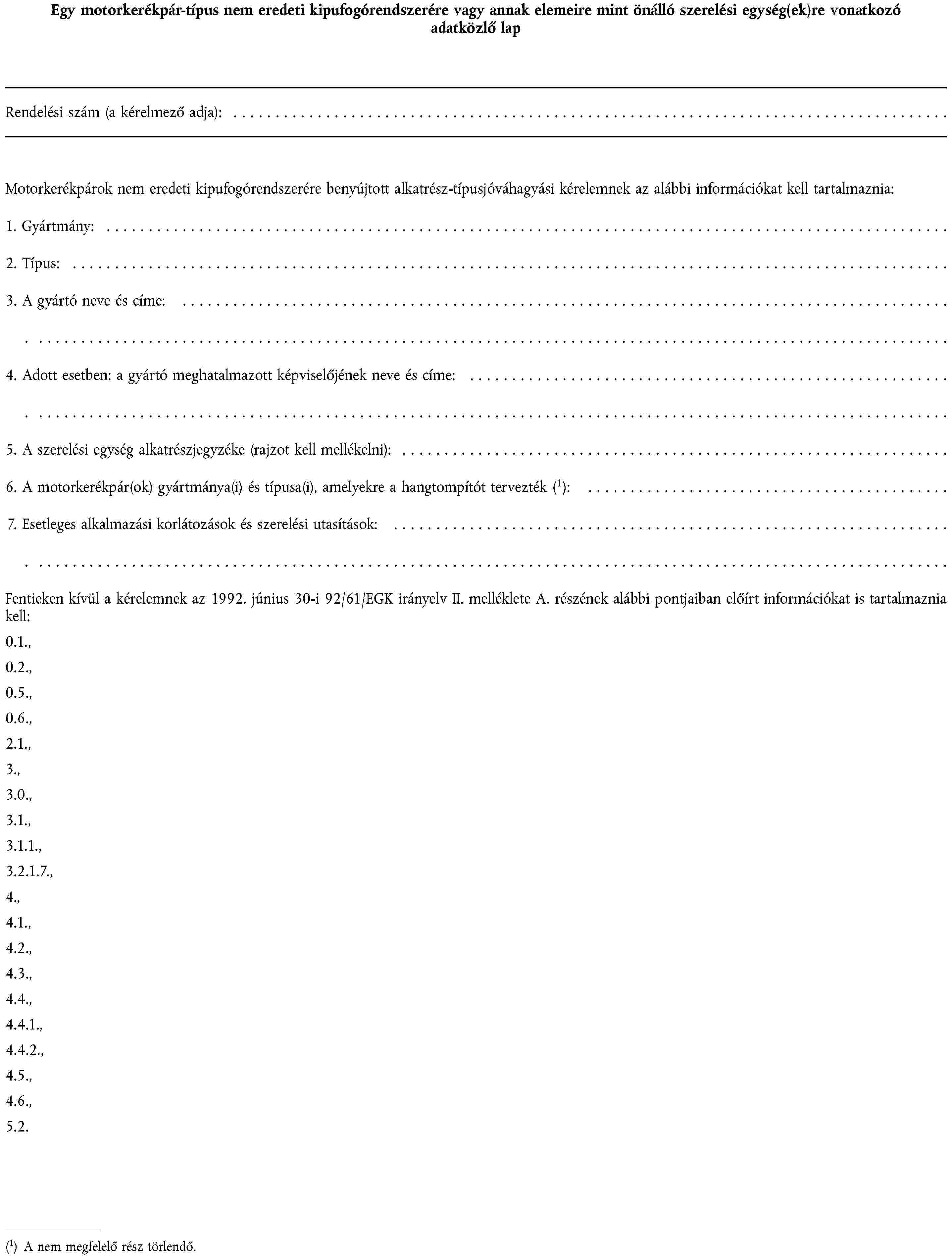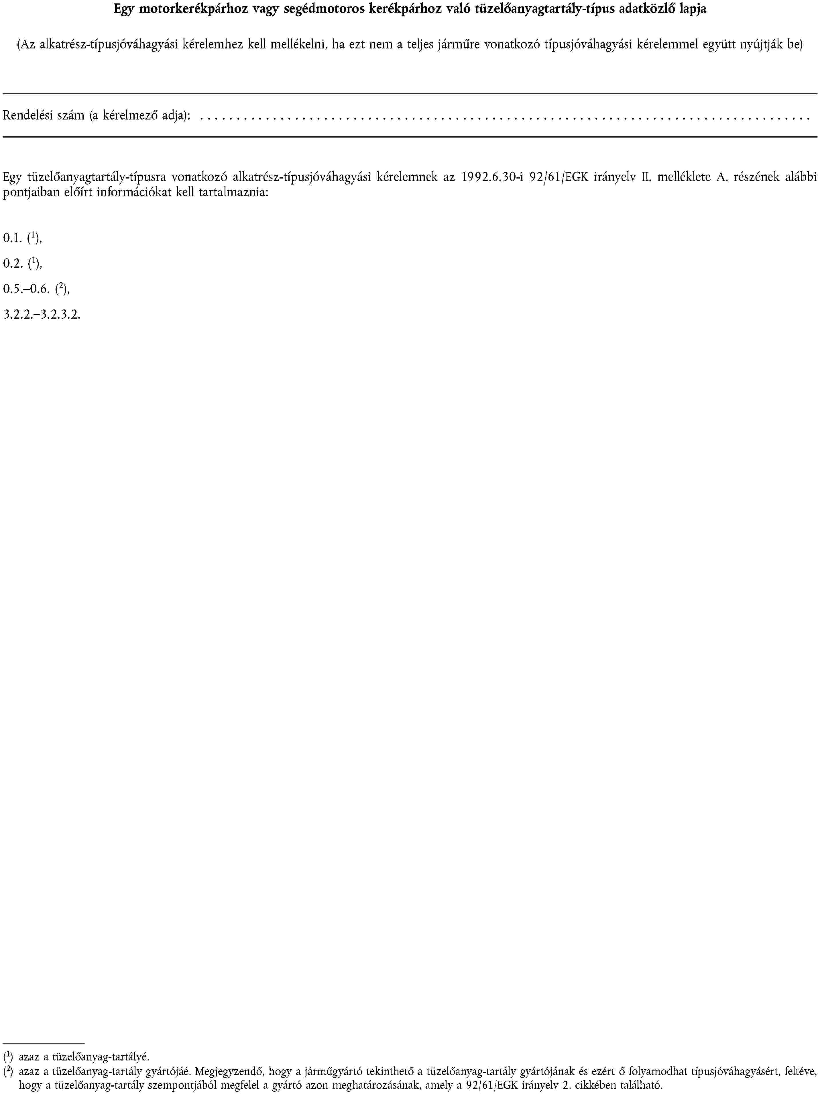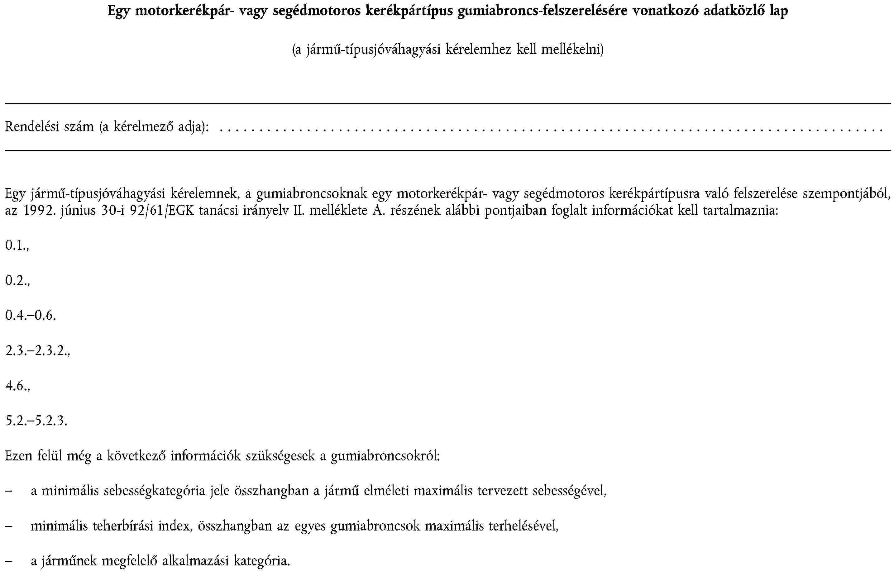 1. függelék | Egy motorkerékpárra vagy segédmotoros kerékpárra szánt gumiabroncs-típus felszerelésére vonatkozó adatközlő lap |