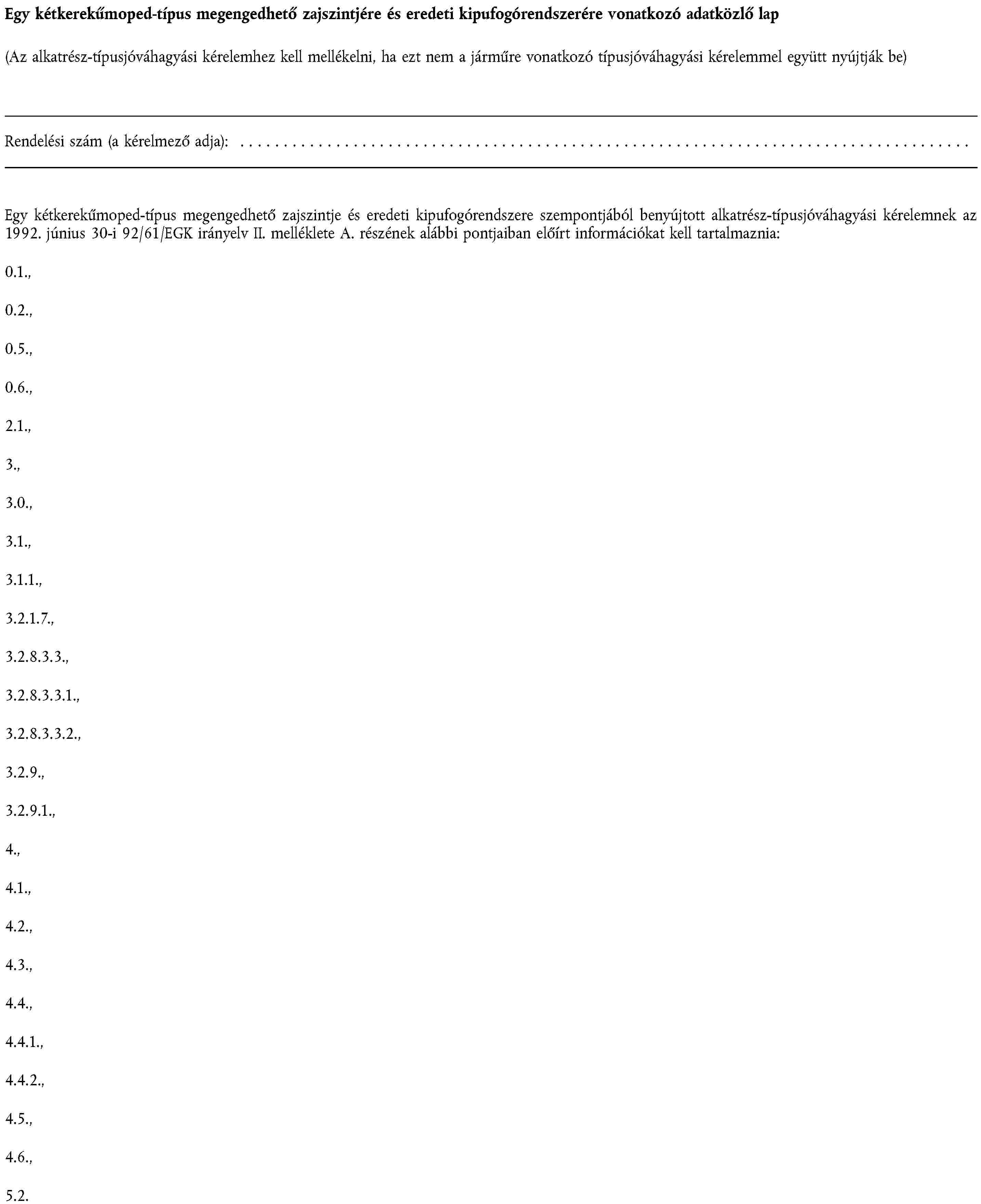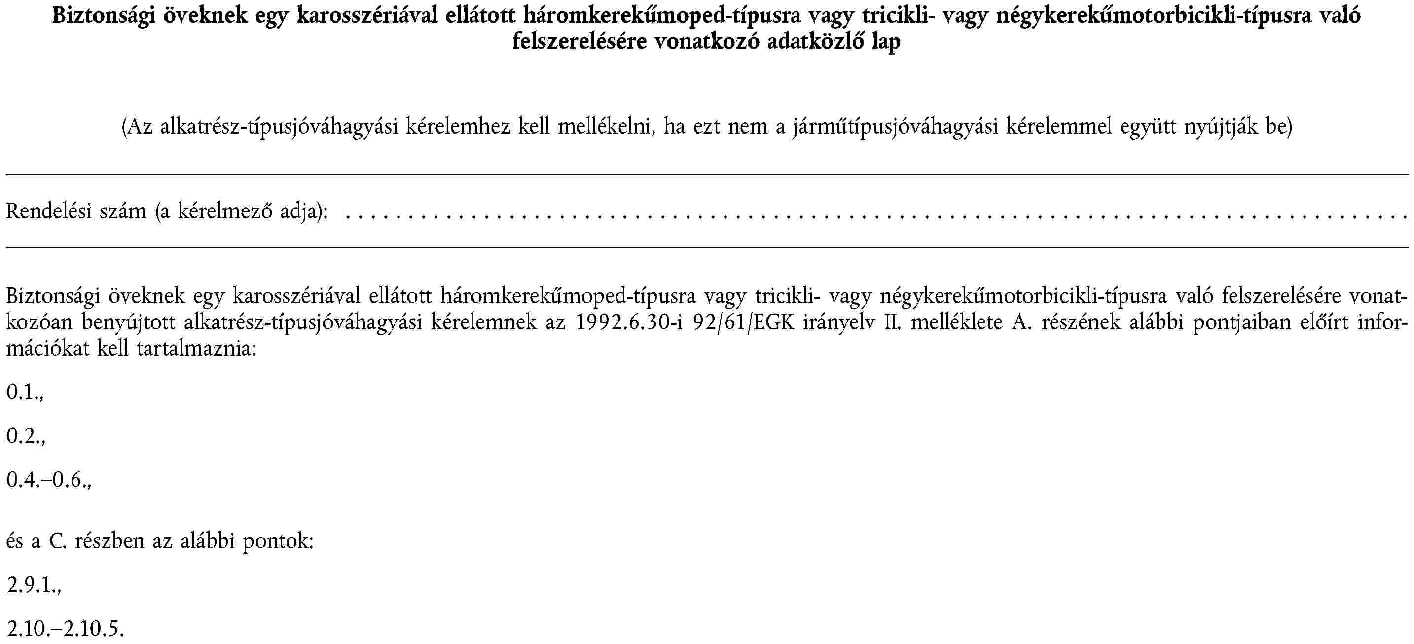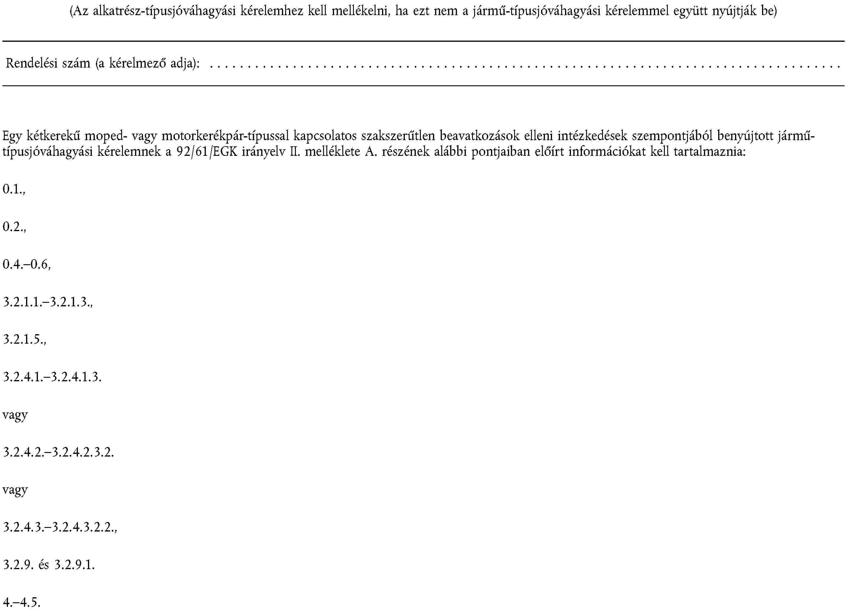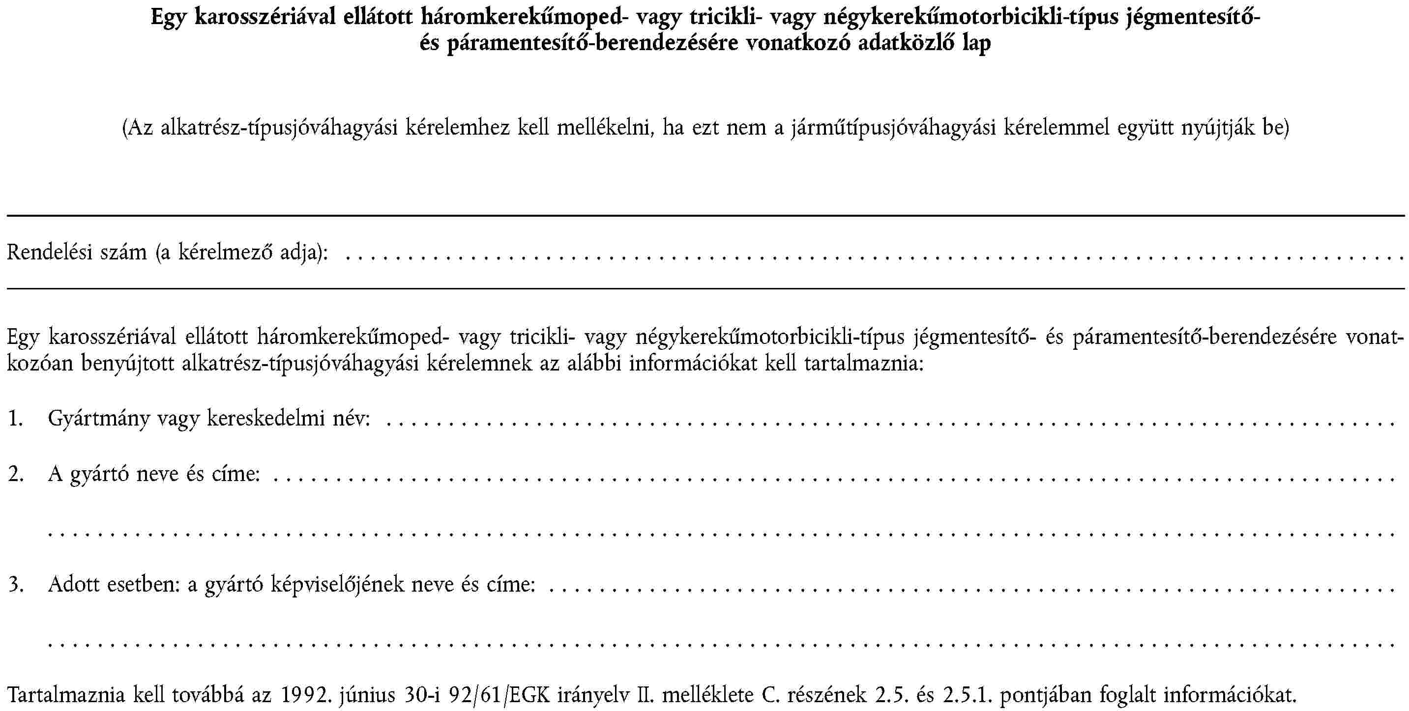 (2) A kinyúló részekre, a légszennyezés elleni intézkedésekre, a beavatkozások elleni intézkedésekre, az elektromágneses összeférhetőségre, a megengedett zajszintre, a pótkocsicsatoló berendezésekre és oldalkocsi-felerősítésekre, a biztonságiöv-rögzítésekre, az ablaktörlő- és mosóberendezésekre, valamint a jég- és páramentesítő berendezésekre mint egy motorkerékpár vagy segédmotoros kerékpár alkatrészére vonatkozó alkatrész-típusjóváhagyás megadásának eljárására, továbbá az ilyen járművek szabad mozgásának feltételeire nézve a 92/61/EGK irányelv II., illetve III. fejezetében foglaltak érvényesek.