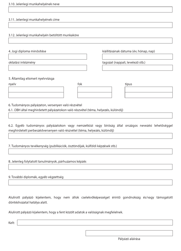 A pályázathoz csatolni kell: - a kitöltött jelentkezési lapot; - motivációs levelet; - az önéletrajzot; - a jogi diploma vagy abszolutórium vagy az államvizsgát megelőző utolsó félév eredményes befejezését tanúsító egyetemi igazolás egyszerű másolatát. A jogi diploma egyszerű másolata a pályázati kiírásban meghatározott módon az első központi versenyvizsga esetében legkésőbb február 28. napjáig, a második központi versenyvizsga esetében legkésőbb július 31. napjáig kell benyújtani. |