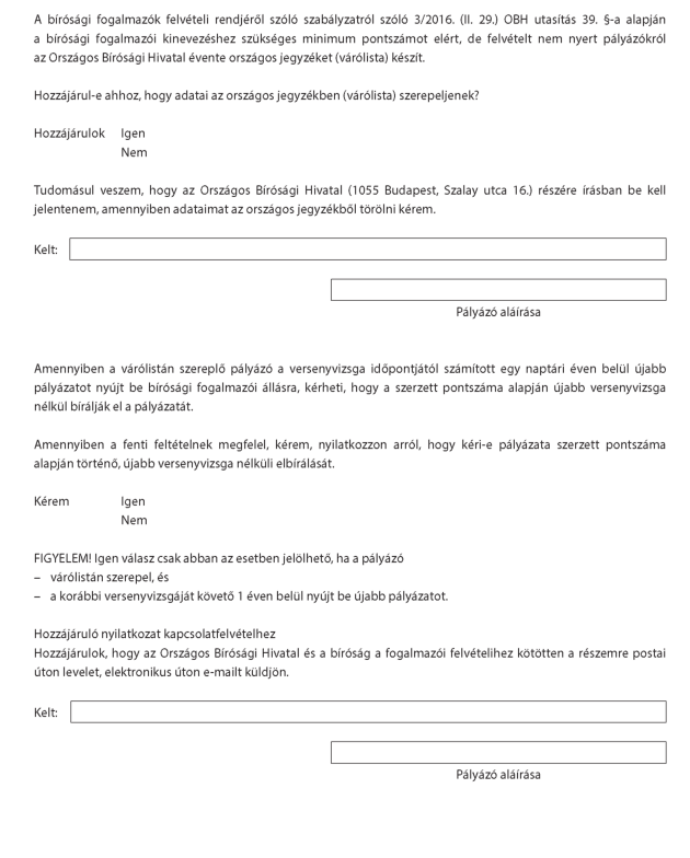 (8) Amennyiben a várólistán szereplő pályázó a versenyvizsga - a részvizsgák eltérő időpontokban való megtartása esetén az utolsó részvizsga - időpontjától számított egy naptári éven belül újabb pályázatot nyújt be bírósági fogalmazói állásra, akkor kérheti, hogy a korábbi versenyvizsga eredménye alapján újabb versenyvizsga nélkül bírálják el a pályázatát. E kérelmét a jelentkezési lapon kell előterjesztenie. A jelentkezési laphoz ez esetben is csatolni kell a (2) bekezdés szerinti mellékleteket.