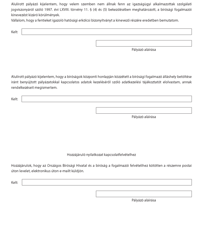 Kérem, szíveskedjék megjelölni, hogy a pályázathoz mely dokumentumokat csatolta: □ Jelentkezési lap, □ Önéletrajz, □ Motivációs levél, □ Jogi diploma egyszerű másolata, □ Az abszolutóriumot vagy az államvizsgát megelőző utolsó félév eredményes befejezését tanúsító egyetemi igazolás egyszerű másolata, □ Pótlap, □ Az egyetemi szabályzatban kötelezően előírt szakmai gyakorlat bíróságon történő eltöltéséről, a bíróság elnöke által aláírt és lepecsételt igazolás egyszerű másolatát, □ A bíróságon eltöltött egyéb szakmai gyakorlatról az adott bíróság elnöke által aláírt és lepecsételt igazolás egyszerű másolatát, □ A munkáltatói jogkör gyakorlója által aláírt és lepecsételt igazolás egyszerű másolatát bírósági ügyintézőként igazságügyi szolgálati jogviszonyban töltött idejéről, □ A diploma mellékletének egyszerű másolata, amennyiben a diploma "summa cum laude" ("praeclare") vagy "cum laude" minősítése abban szerepel, |