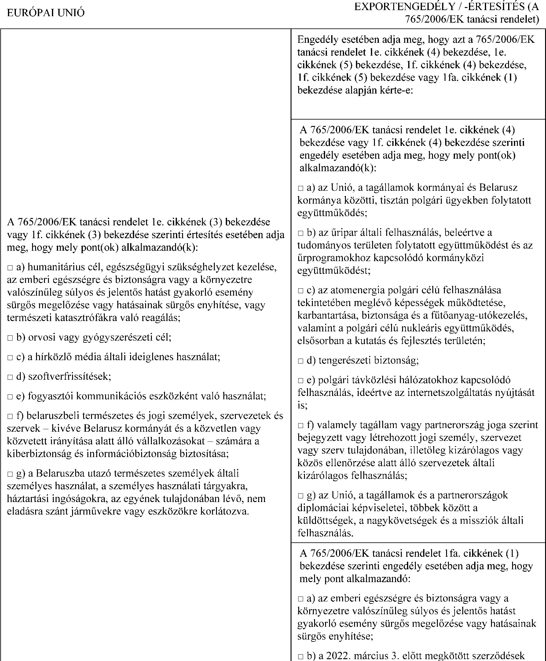 (1) Az e rendelet 1a. cikkének sérelme nélkül, tilos a 258/2012/EU európai parlamenti és tanácsi rendelet ( 5 ) I. mellékletében felsorolt tűzfegyverek, tűzfegyverdarabok, alapvető alkotóelemeik és lőszereik, valamint az e rendelet XVI. mellékletében felsorolt tűzfegyverek és egyéb fegyverek - függetlenül attól, hogy azok az Unióból származnak-e - közvetlenül vagy közvetve történő eladása, szolgáltatása, átadása vagy exportja bármely belaruszbeli természetes vagy jogi személy, szervezet vagy szerv részére, vagy Belaruszban történő felhasználásra.