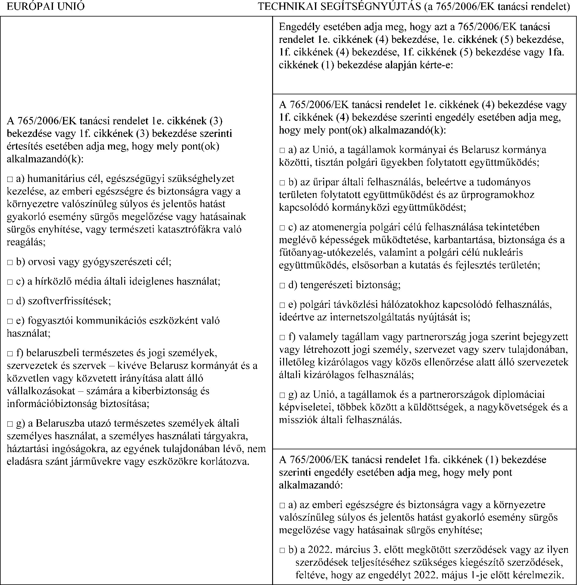 a) a közös katonai listán felsorolt termékekhez és technológiákhoz, vagy az említett listán felsorolt termékek és technológiák rendelkezésre bocsátásához, előállításához, karbantartásához és használatához kapcsolódó technikai segítségnyújtás, brókertevékenység vagy egyéb szolgáltatás biztosítása közvetlenül vagy közvetve bármilyen belaruszbeli természetes vagy jogi személy, szervezet vagy szerv részére, vagy Belaruszban történő felhasználásra;
