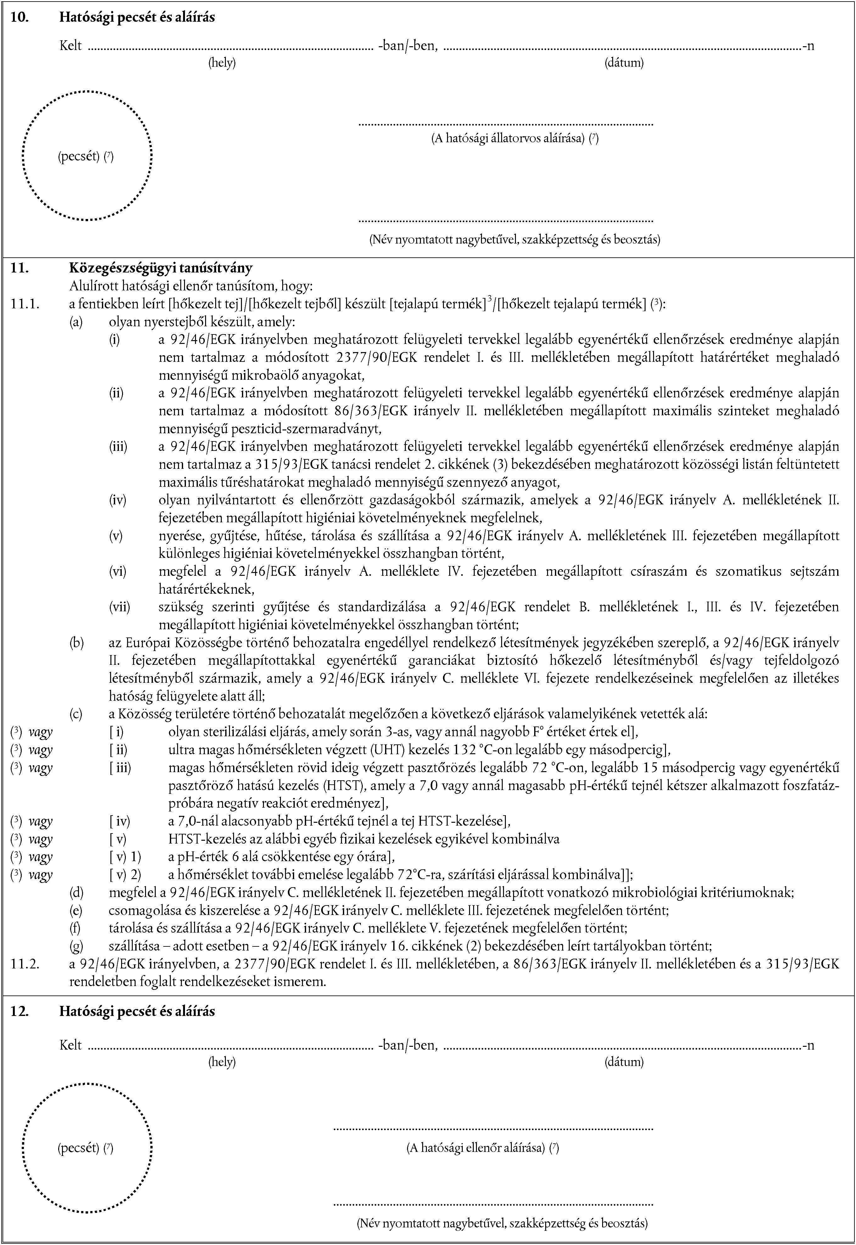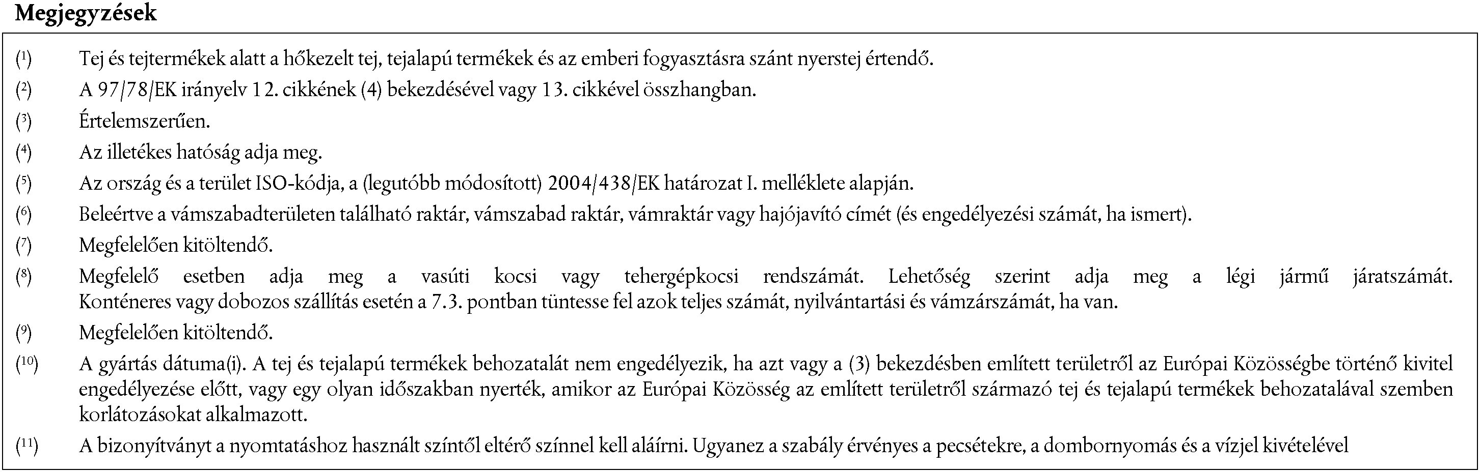 a) Az egészségügyi bizonyítványokat az exportáló ország e II. mellékletben szereplő minták alapján, az érintett tejnek és tejalapú termékeknek megfelelő mintával összhangban állítja ki. A bizonyítványnak a mintán megadott számozott rendben tartalmaznia kell az összes harmadik ország esetében előírt igazolásokat, valamint adott esetben az exportáló harmadik ország vagy országrész esetében megkövetelt további garanciákat. b) Minden bizonyítvány eredeti példánya egyetlen, mindkét oldalán nyomtatott lapból áll, illetve hosszabb szöveg esetén az összes szükséges lap egy összefüggő, szétválaszthatatlan egészet alkot. c) A bizonyítványt az ellenőrzést végző határállomás szerinti EU-tagállam legalább egy hivatalos nyelvén, valamint a rendeltetési EU-tagállam legalább egy hivatalos nyelvén kell kitölteni. Ezek a tagállamok azonban szükség esetén más nyelveket is engedélyezhetnek, amely esetben hivatalos fordítást kell mellékelni. d) Ha a szállítmány tételeinek azonosítása érdekében (a bizonyítványminta 8. pontjában szereplő jegyzék) a bizonyítványhoz pótlapokat csatolnak, a kiállító tisztviselő aláírásával és pecsétjével ellátott valamennyi lapot úgy kell tekinteni, hogy azok a bizonyítvány eredeti példányának részét képezik. | e) Ha a bizonyítvány a d) pontban említett kiegészítő jegyzékekkel együtt több lapból áll, minden oldal alján fel kell tüntetni az oldalszámot – (oldalszám)/(összes oldal száma) – felül pedig a bizonyítvány illetékes hatóság által megadott kódszámát. f) A bizonyítvány eredeti példányát az illetékes hatóság részéről a nyerstej, hőkezelt tej és tejalapú termékek tekintetében a 92/46/EGK irányelv követelményei betartásának ellenőrzéséért és tanúsításáért felelős képviselő tölti ki és írja alá. g) Az exportáló ország illetékes hatóságai biztosítják a 96/93/EK tanácsi irányelvben megállapítottakkal egyenértékű elvek követését a bizonyítványok kiadásában. h) A bizonyítványt a nyomtatáshoz használt színtől eltérő színnel kell aláírni. Ugyanez a szabály érvényes a pecsétekre, a dombornyomás és a vízjel kivételével. |
