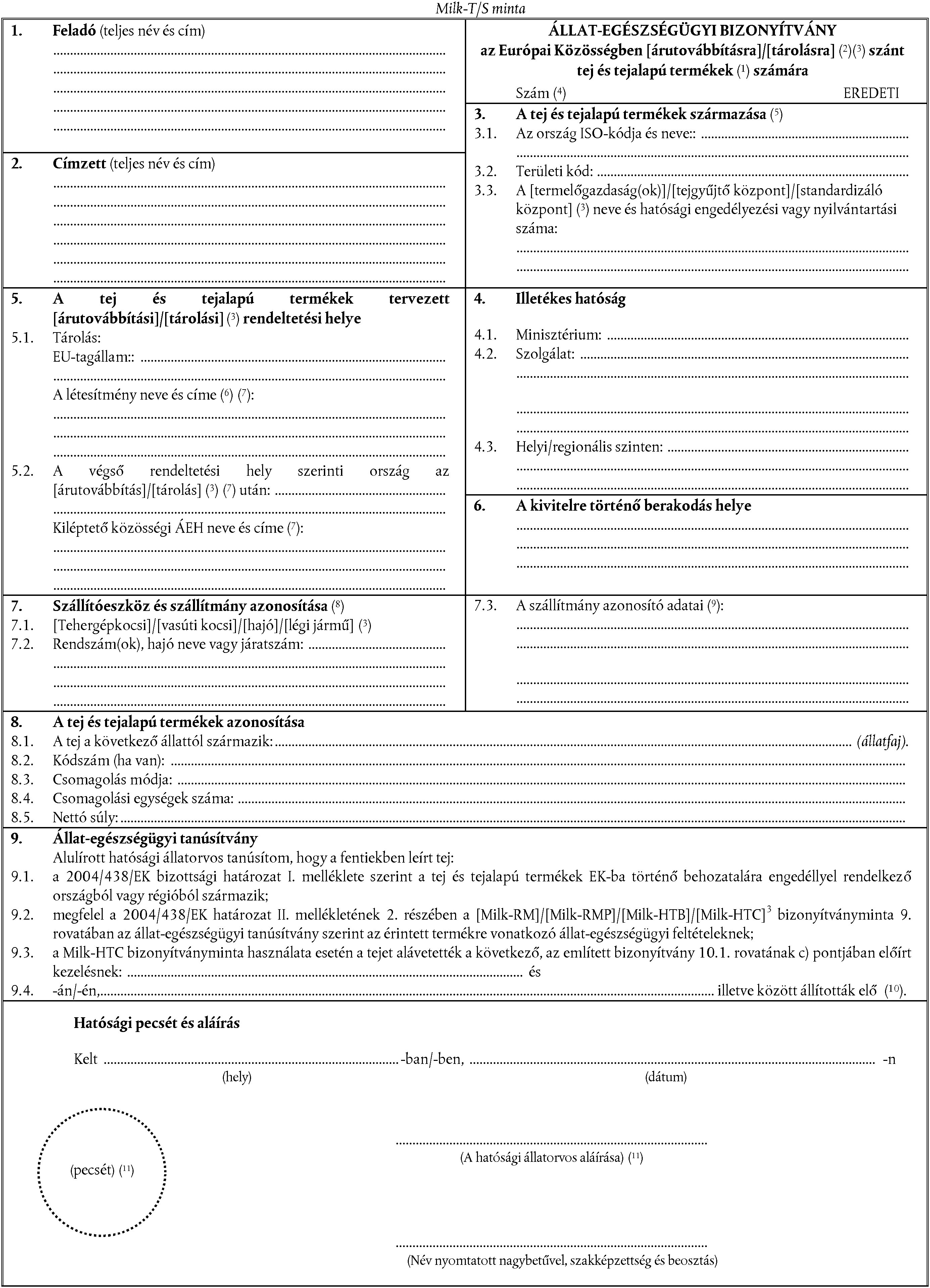 "Milk-T/S" az Európai Közösségen belüli árutovábbításra/tárolásra szánt tej és tejalapú termékekhez.