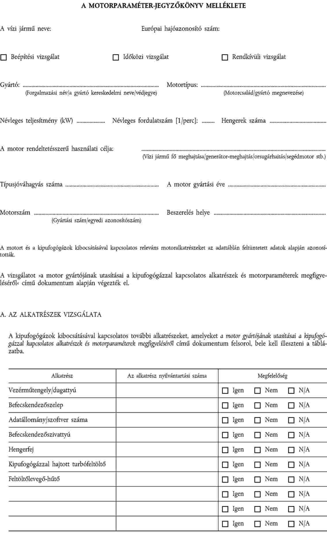 5. rendkívüli vizsgálat: az az eljárás, amellyel az illetékes hatóság meggyőződik arról, hogy a vízi járműre felszerelt motor a gáz- és szilárd halmazállapotú szennyezőanyag-kibocsátás tekintetében végrehajtott minden jelentős módosítás után továbbra is megfelel az e fejezetben foglalt műszaki követelményeknek;