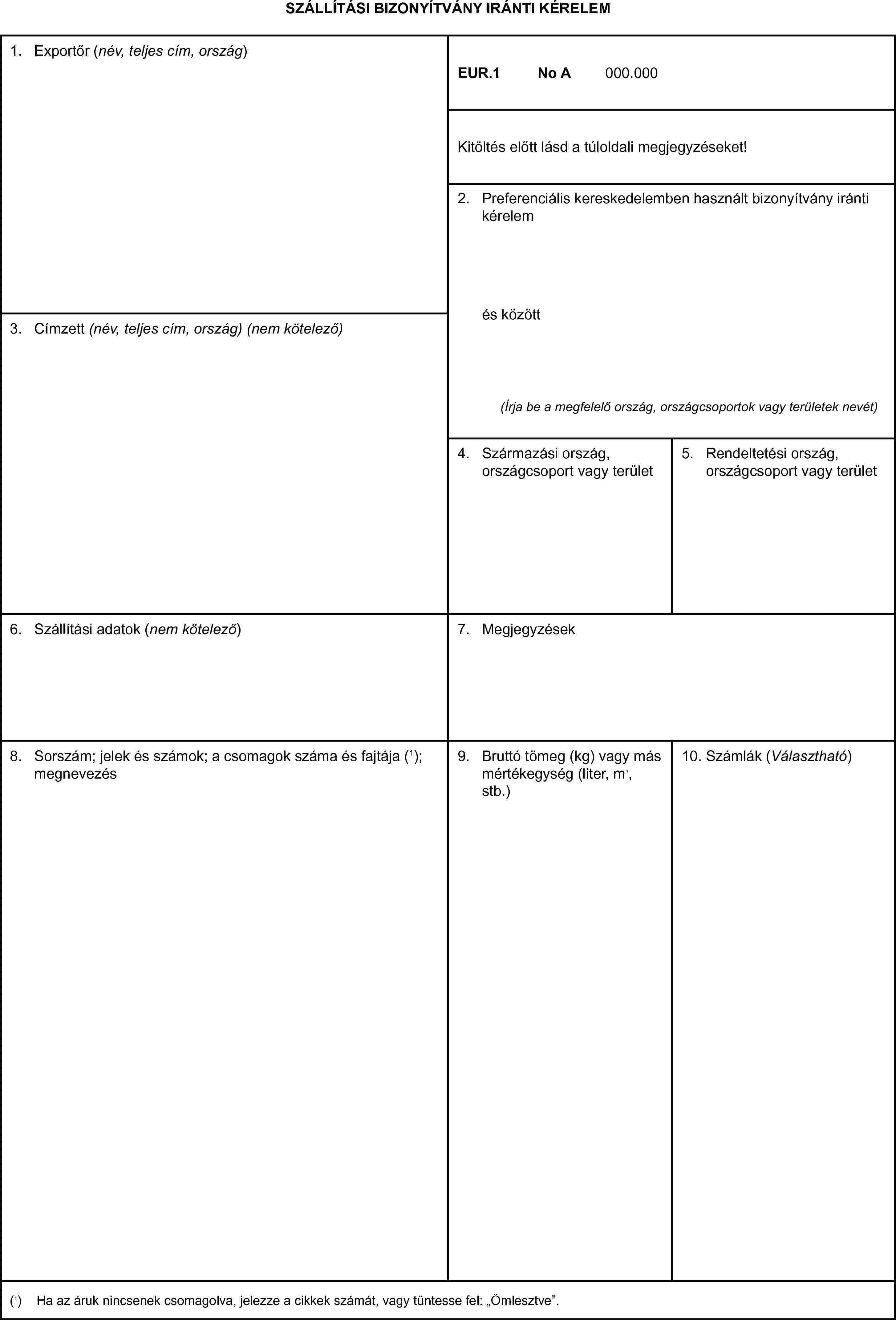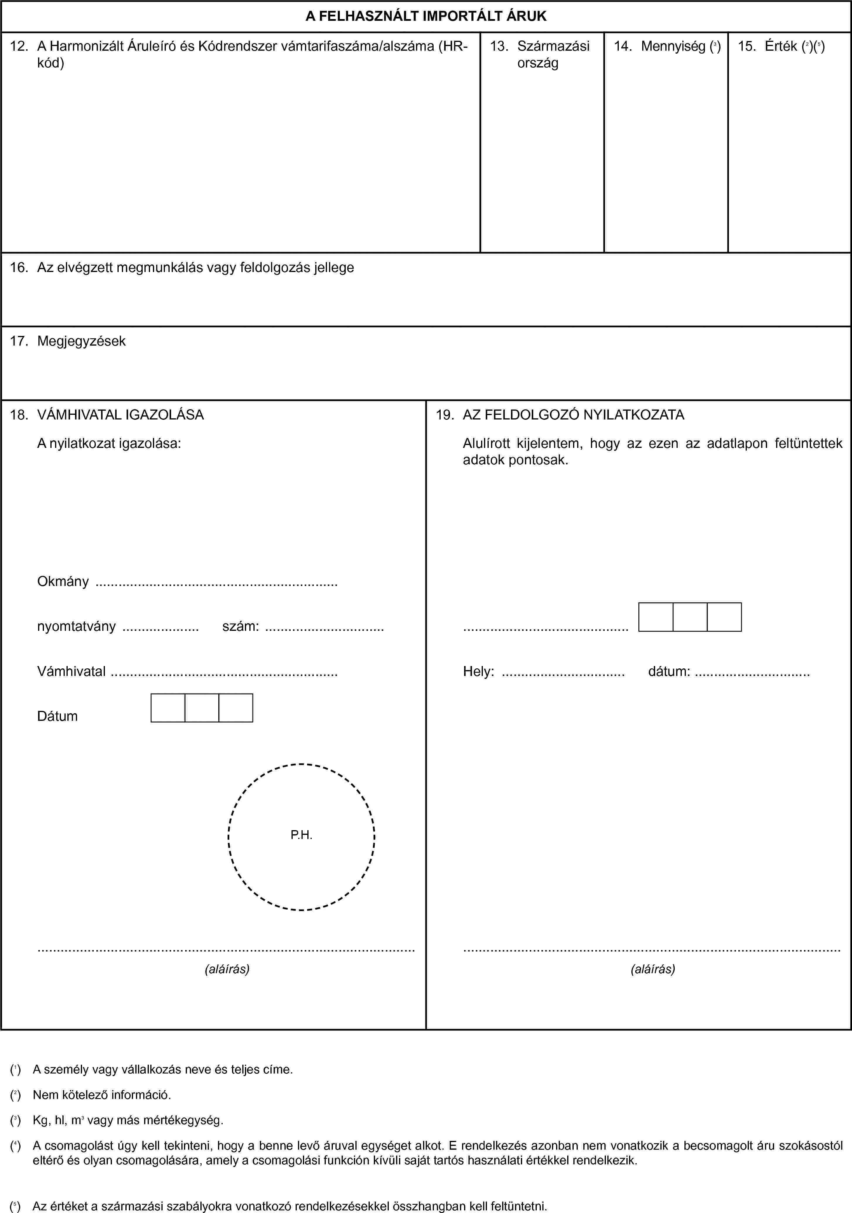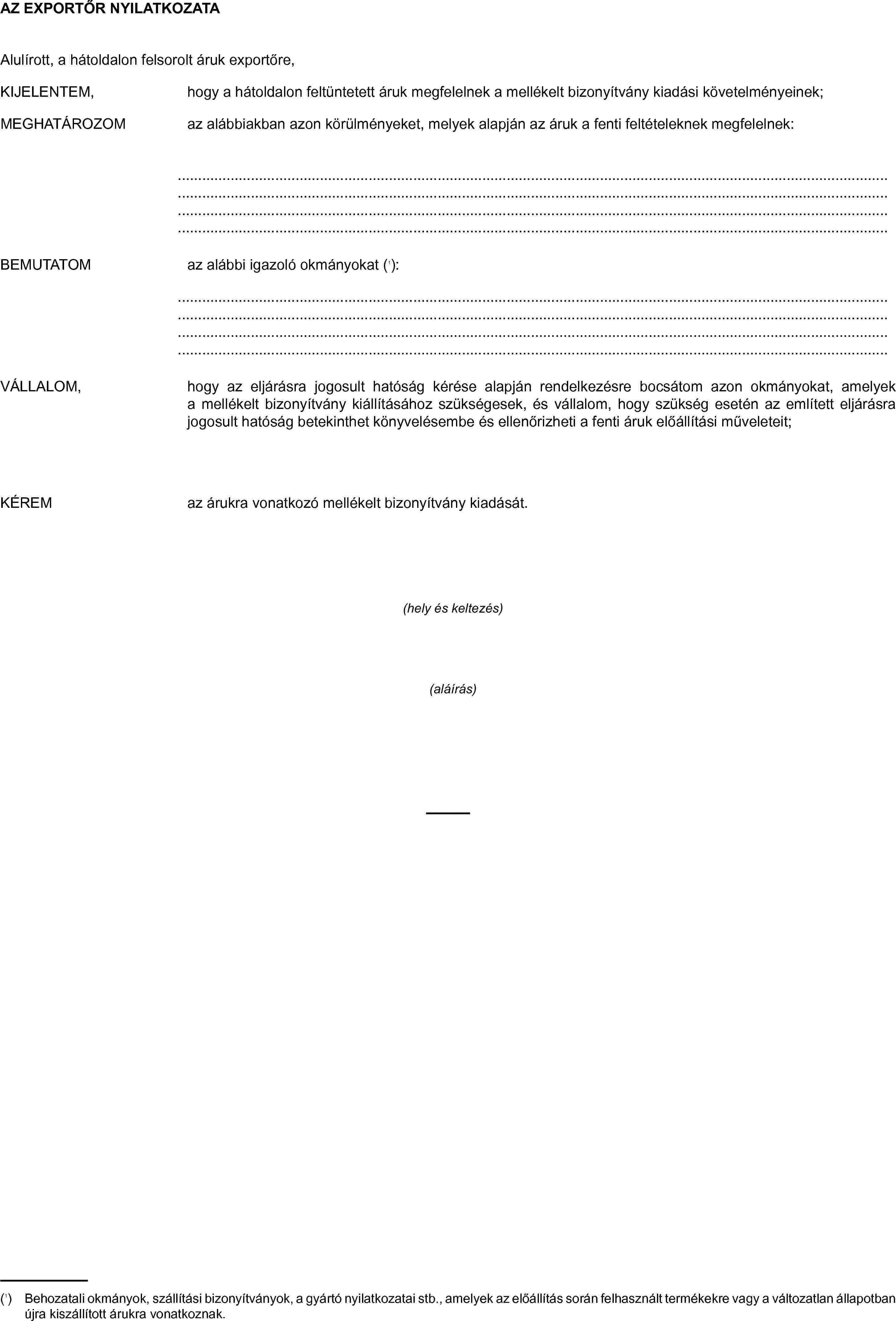 ( 24 ) Lásd e melléklet 19. cikkének (5) bekezdését. Amennyiben az exportőrnek nem kötelessége aláírni, az aláírás alól való mentesség egyúttal az aláíró nevének feltüntetésétől való mentességet is jelenti.