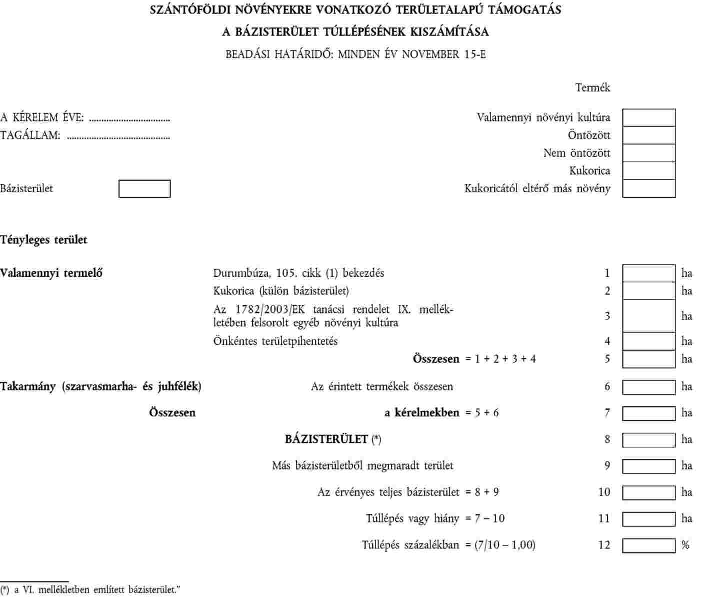 - az 1782/2003/EK rendelet 100. cikkében előírt, szántóföldi növényekre vonatkozó területalapú támogatás az e rendelet IV. mellékletében említett bázisterületenkénti bontásban és az e rendelet IX. mellékletében leírt szabványos formátumban,
