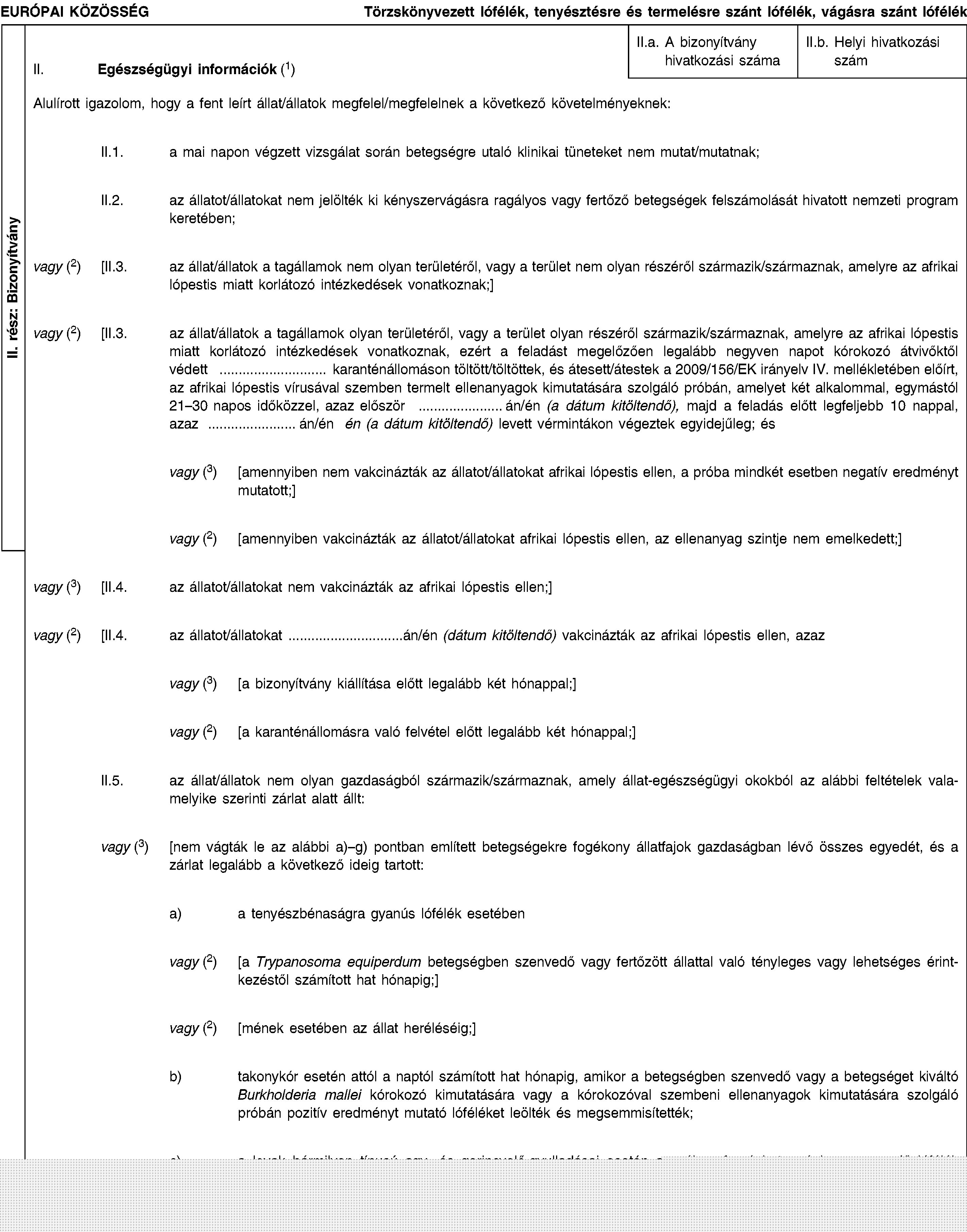 (2) Az egészségügyi bizonyítványt vagy törzskönyvezett lófélék esetében az egészségügyi igazolást a 6. cikk sérelme nélkül a szállításra való berakodást megelőző 48 óra során, vagy pedig legkésőbb az előző munkanapon, a származási és a rendeltetési tagállamok hivatalos nyelveinek legalább egyikén kell kiállítani. Az egészségügyi igazolás vagy az egészségügyi bizonyítvány érvényességi ideje 10 nap. Az egészségügyi igazolás vagy az egészségügyi bizonyítvány egyetlen lapból áll.