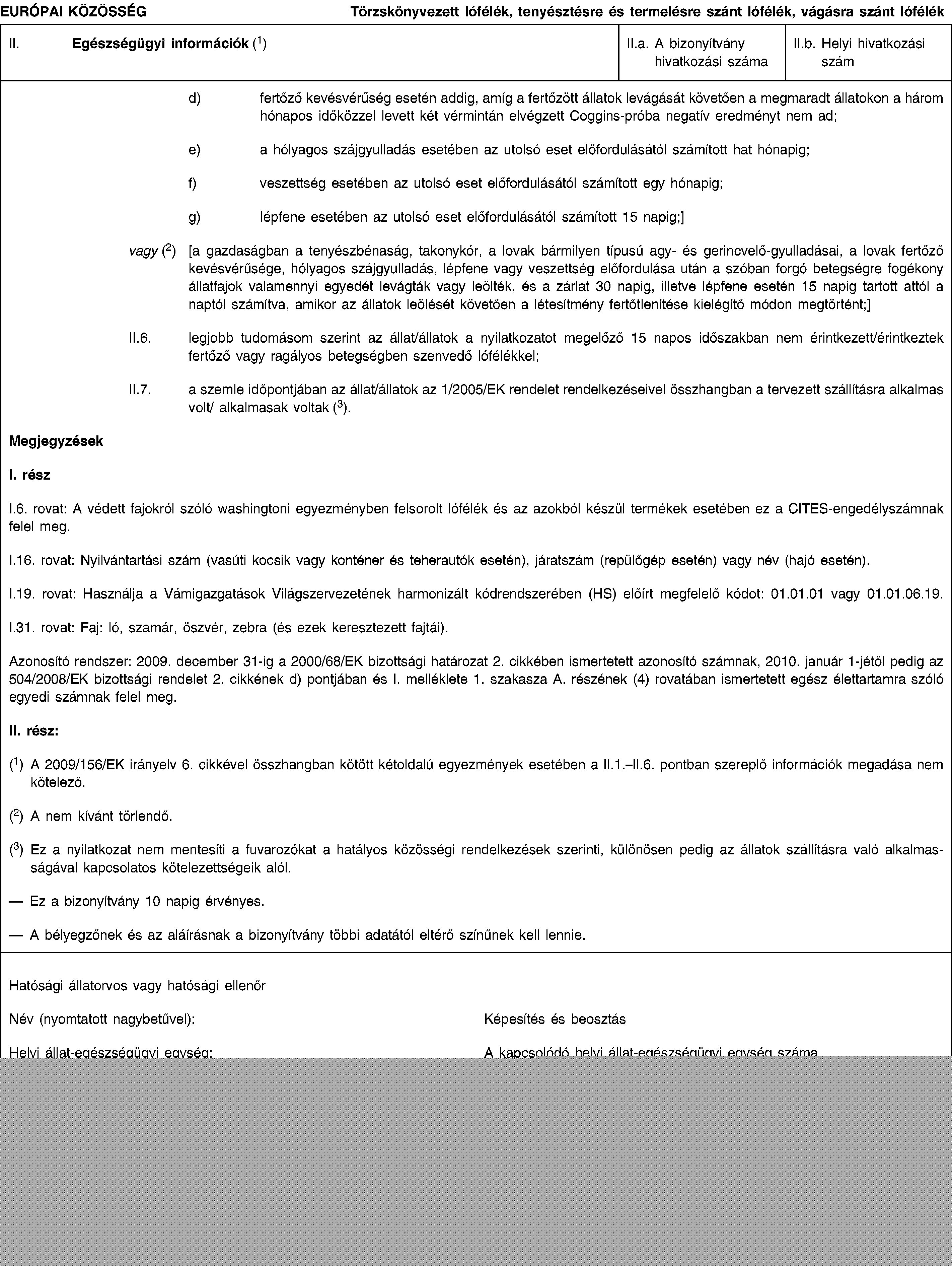 b) a szállítás idején a tenyésztésre, termelésre és vágásra szánt lóféléket a III. mellékletnek megfelelő egészségügyi bizonyítvány kíséri.
