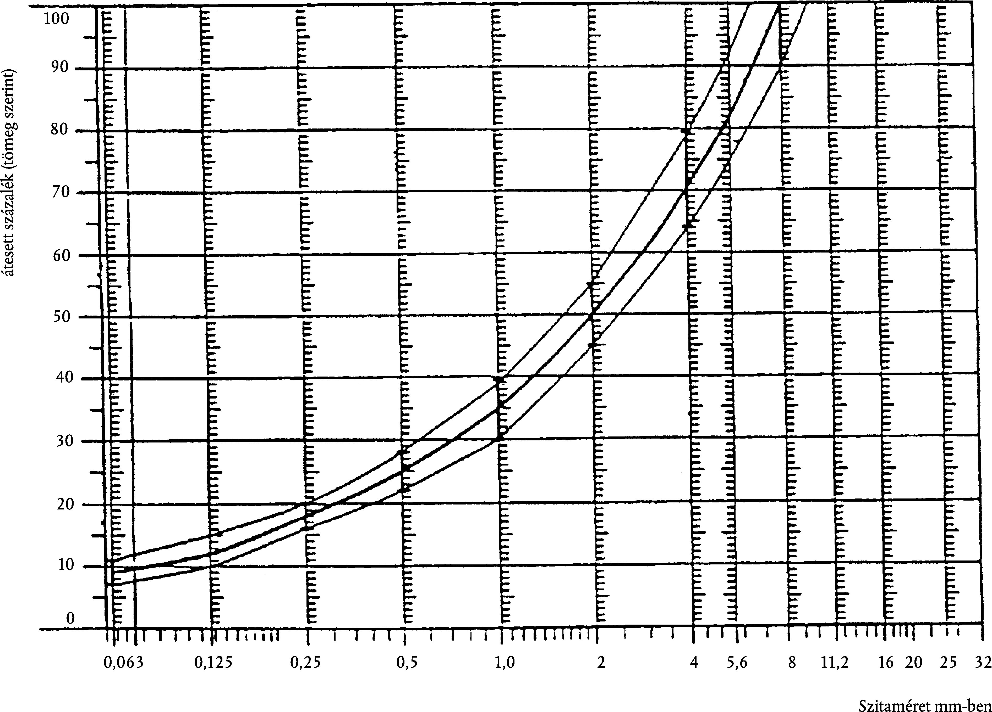 [Kép #7] 2. ábra: Az aszfaltkeverékben levő adalékanyag szemcseméret-eloszlási görbéje, tűréshatárokkal