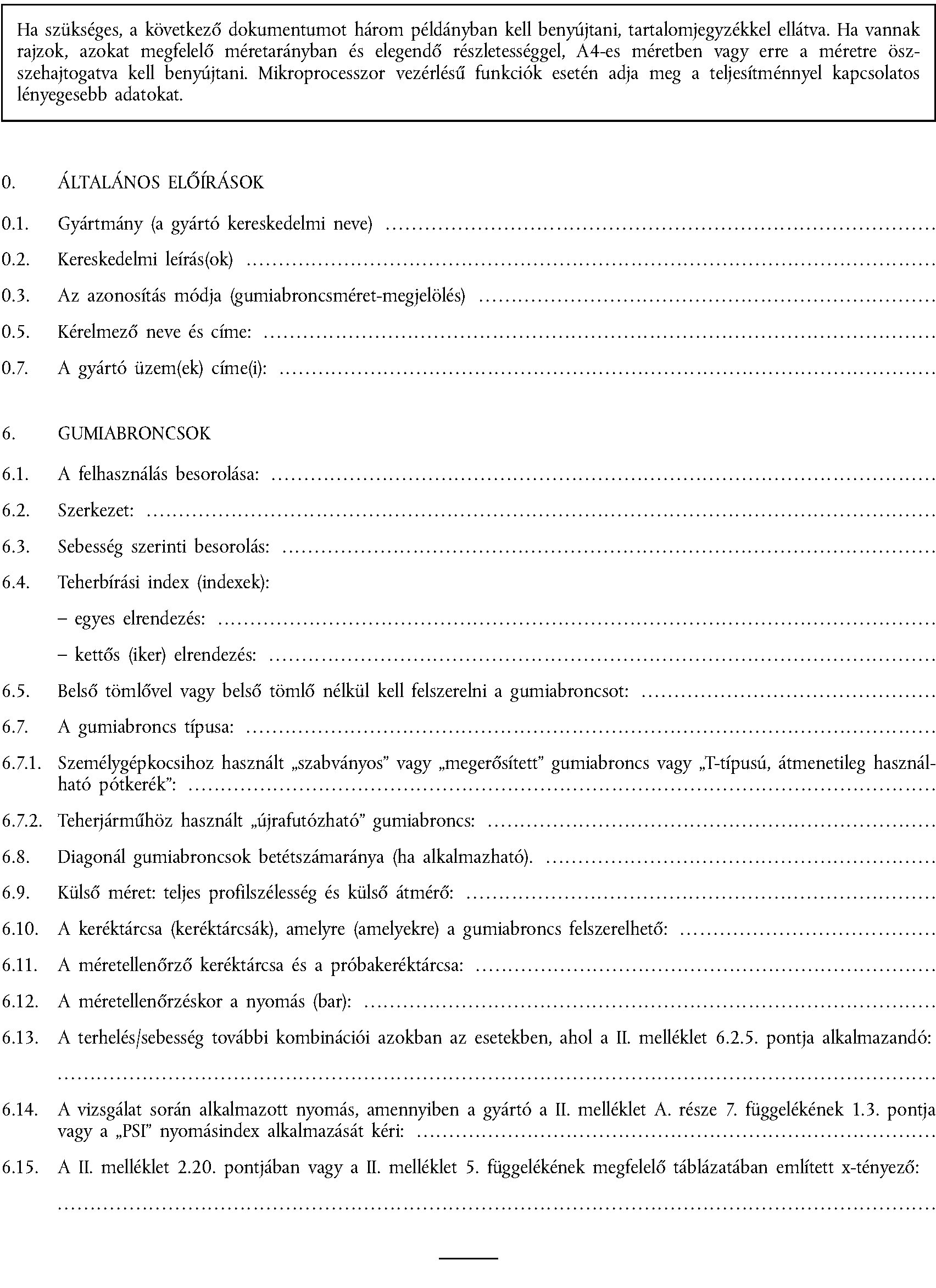1. ADOTT GUMIABRONCSTÍPUSRA VONATKOZÓ EK-TÍPUSJÓVÁHAGYÁSI KÉRELEM