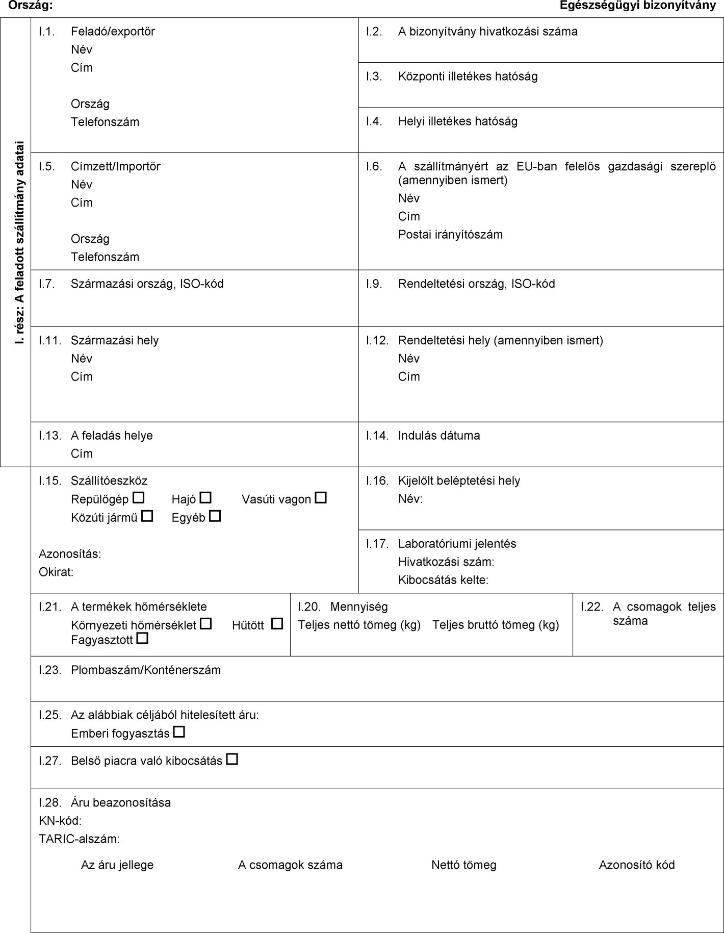 I. 1. Feladó/exportőr
