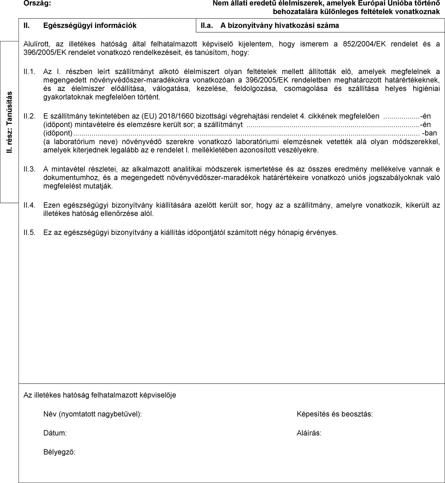 II. 2. E szállítmány tekintetében az (EU) 2018/1660 bizottsági végrehajtási rendelet 4. cikkének megfelelően -én (időpont) mintavételre és elemzésre került sor; a szállítmányt -én (időpont) -ban (a laboratórium neve) növényvédő szerekre vonatkozó laboratóriumi elemzésnek vetették alá olyan módszerekkel, amelyek kiterjednek legalább az e rendelet I. mellékletében azonosított veszélyekre.