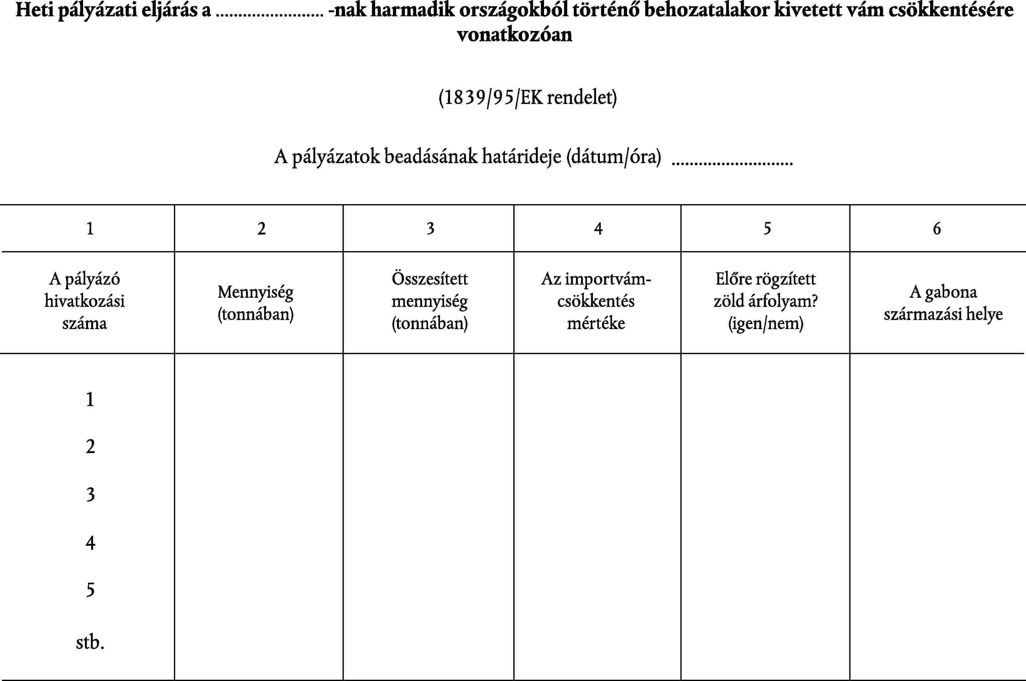 (7) A hatáskörrel rendelkező szerv a pályázatok beadásának a pályázati felhívásban megadott határideje után két órán belül köteles a pályázatokat a Bizottsághoz eljuttatni. Azokat az I. mellékletben feltüntetett formában kell továbbítani.