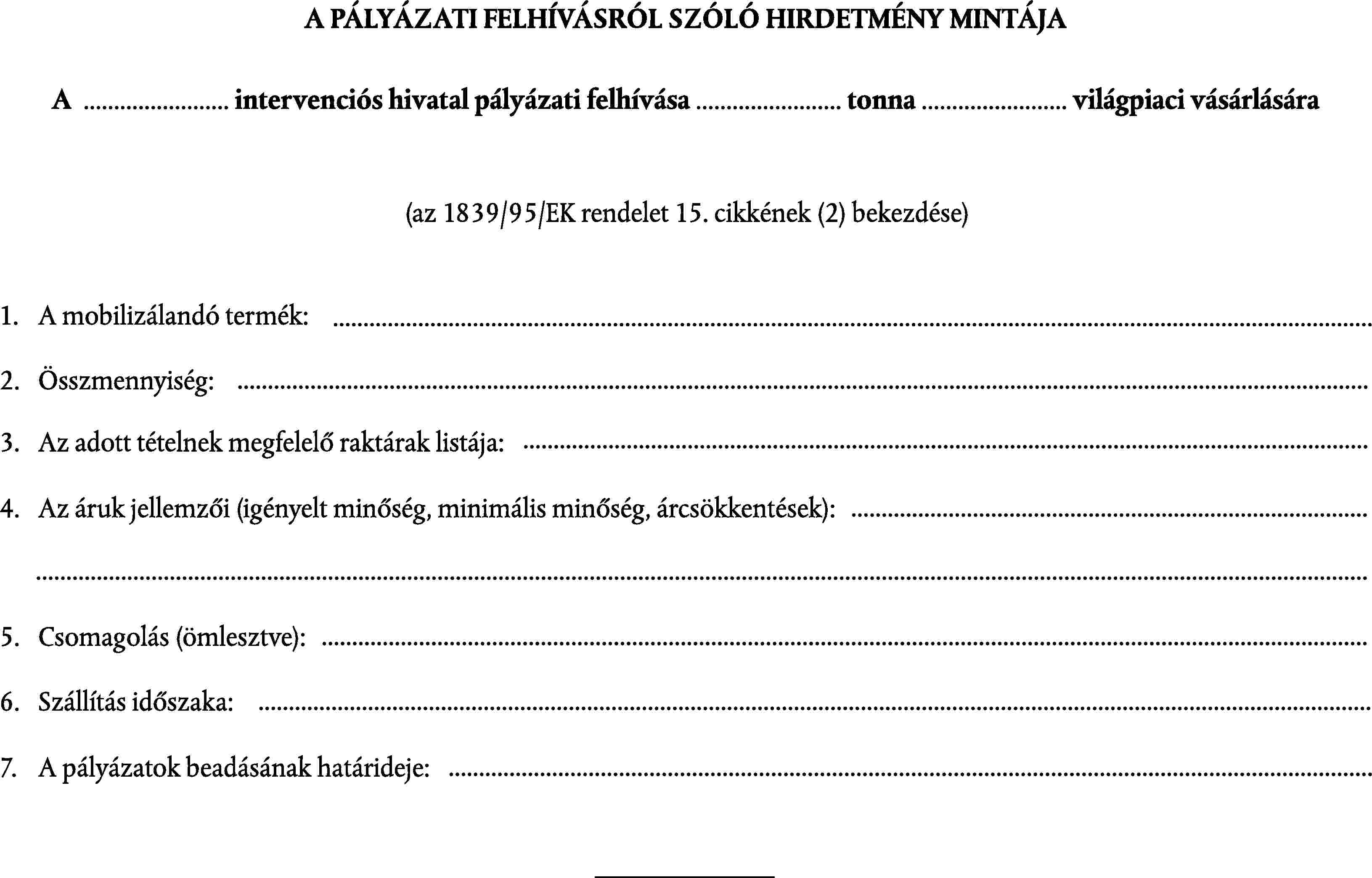 (1) A behozatali vám csökkentésére pályázati eljárás szervezhető. Ezekben az esetekben az érdekelt felek a pályázati felhívásra úgy válaszolnak, hogy az írásos pályázatot a pályázati felhívásban megjelölt illetékes hatósághoz átvételi elismervény ellenében benyújtják, vagy a fenti hatósághoz a pályázatot ajánlott levélben, telexen, faxon vagy táviratban elküldik.