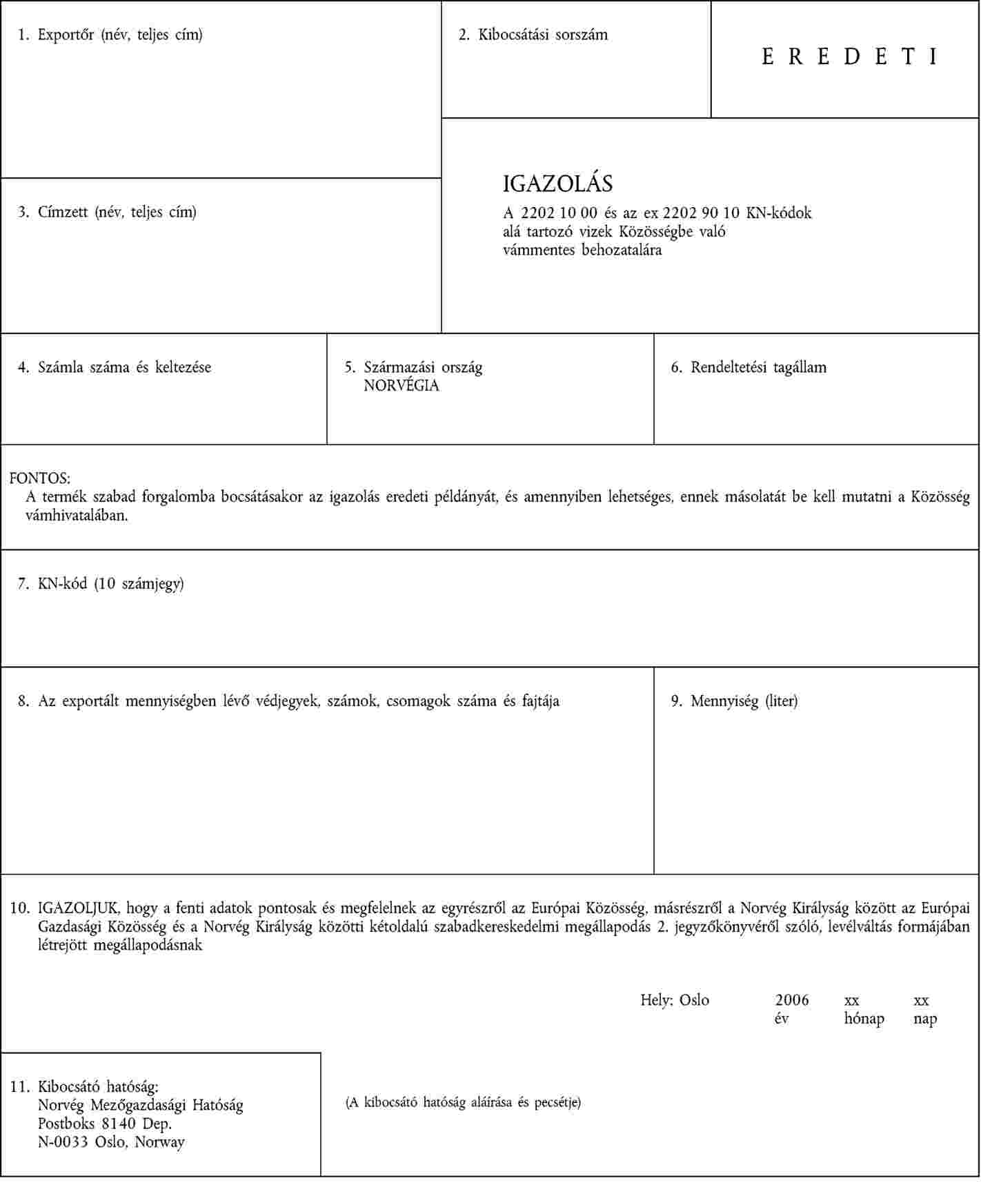 Igazolás a 2202 10 00 és az ex22029010 KN-kód alá tartozó vizek Közösségbe történő vámmentes behozatalához