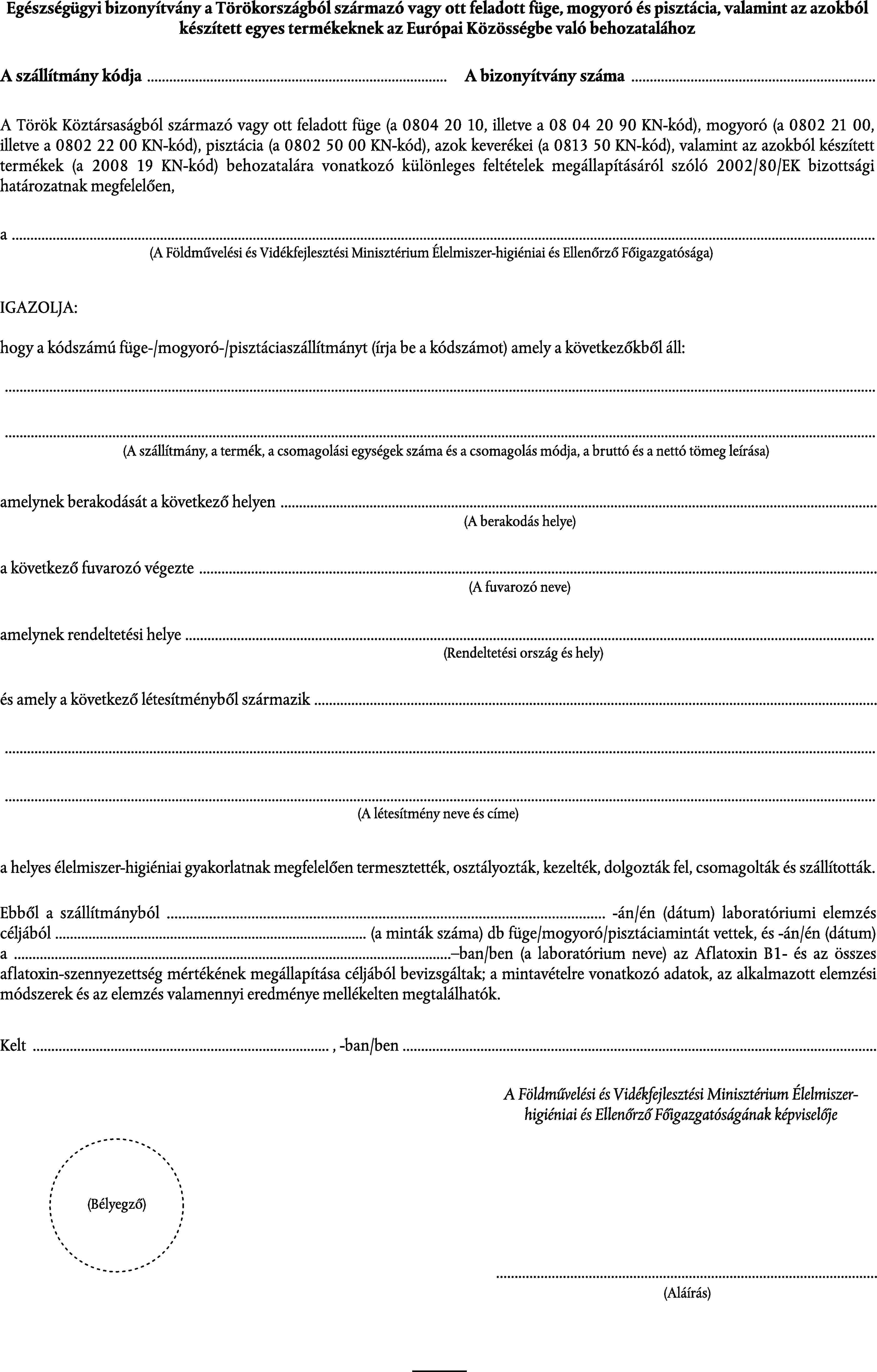 (1) A tagállamok csak abban az esetben engedélyezhetik az alábbi kategóriákba sorolt, Törökországból származó vagy ott feladott, emberi fogyasztásra vagy élelmiszerek összetevőjéül szánt termékek behozatalát, ha minden egyes szállítmányt a hatósági mintavétel és elemzés eredményeit tanúsító bizonylat, valamint a Török Köztársaság Földművelési és Vidékfejlesztési Minisztériuma Élelmiszer-higiéniai és Ellenőrző Főigazgatóságának képviselője által az I. mellékletnek megfelelően kitöltött, aláírt és ellenőrzött egészségügyi bizonyítvány kísér: