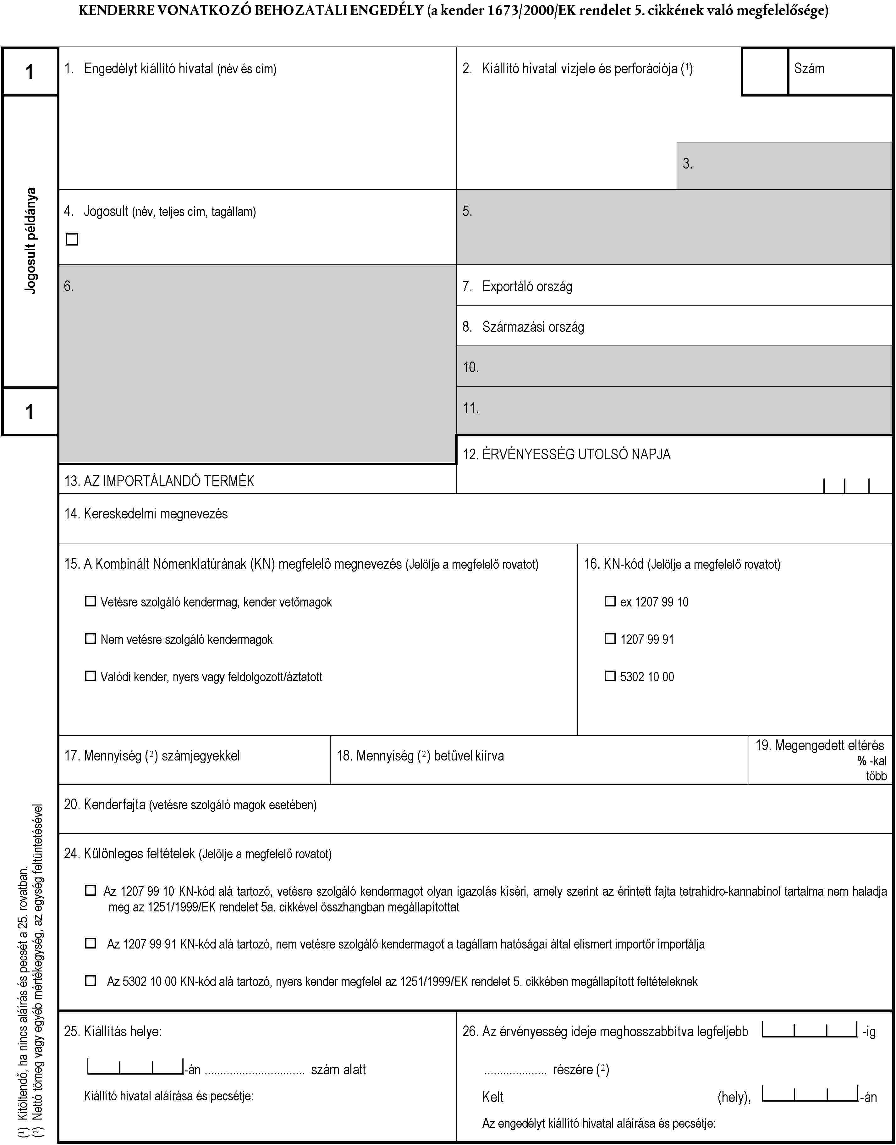(1) Az 1673/2000/EK rendelet 5. cikke (2) bekezdésének első albekezdésében említett engedélyt az e rendelet mellékletében megadott mintának megfelelően kell elkészíteni. Az engedély csak akkor adható ki, ha az importőr tagállam számára meggyőzően igazolták az összes megállapított feltétel teljesülését.