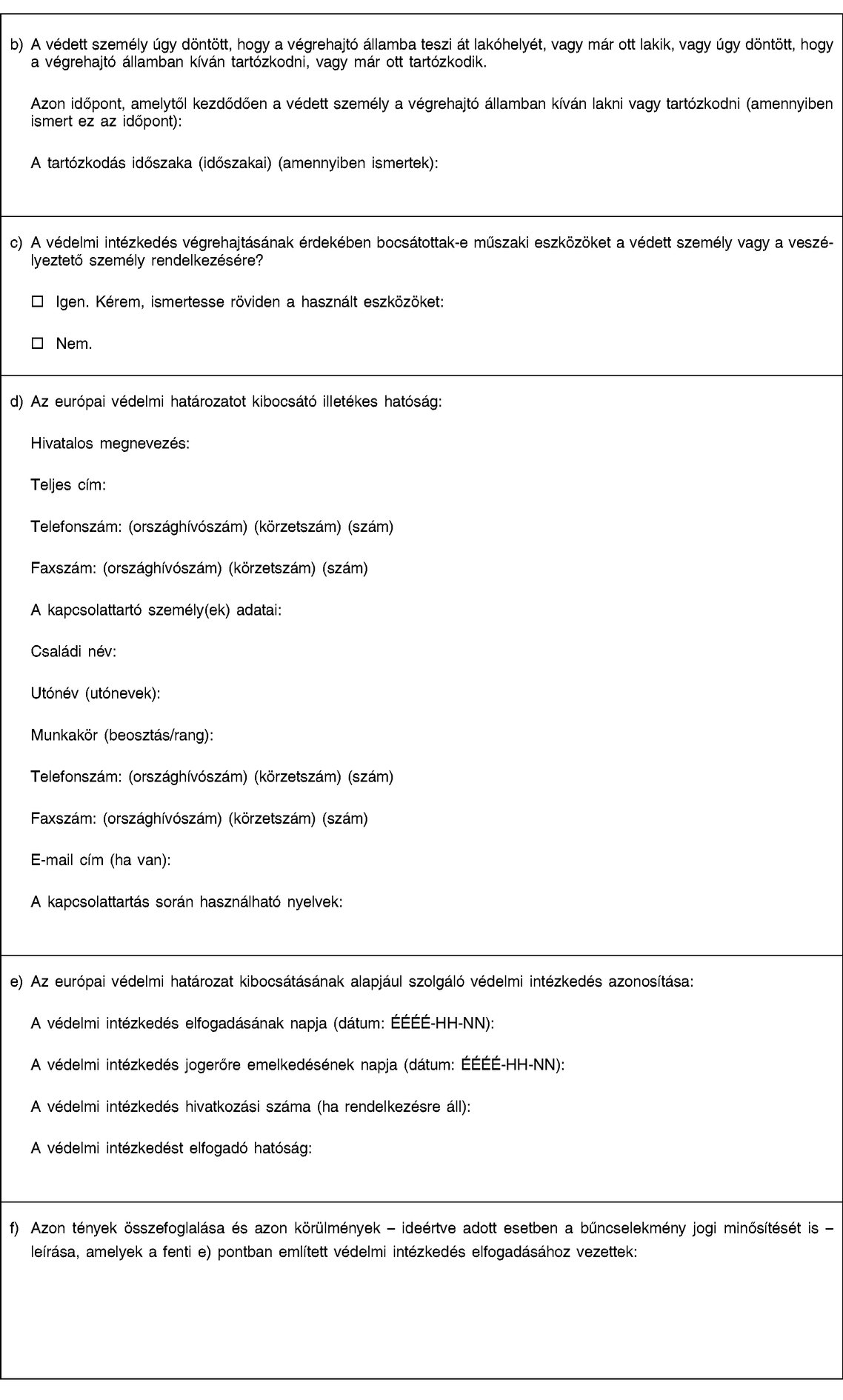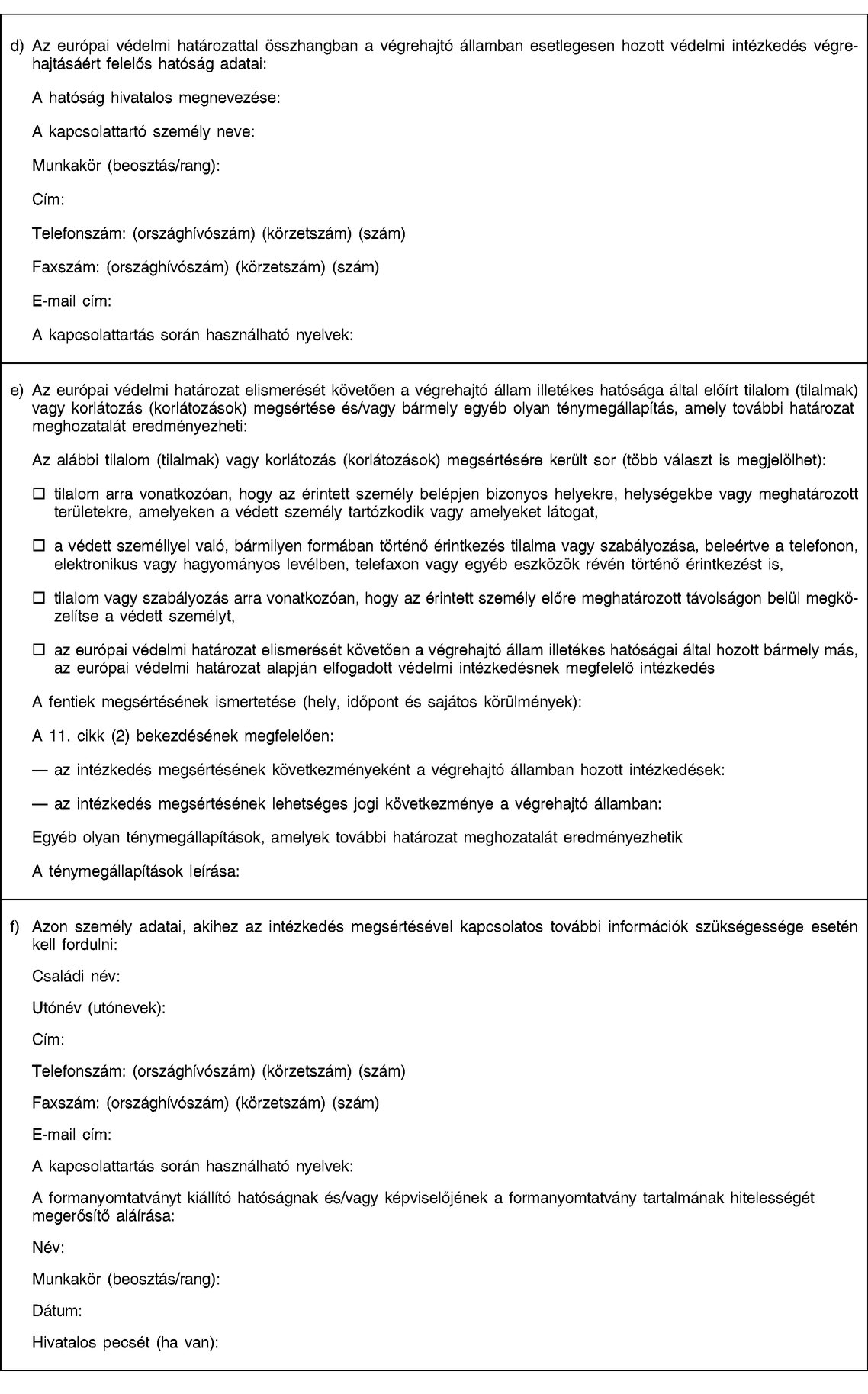 d) Az európai védelmi határozattal összhangban a végrehajtó államban esetlegesen hozott védelmi intézkedés végrehajtásáért felelős hatóság adatai: