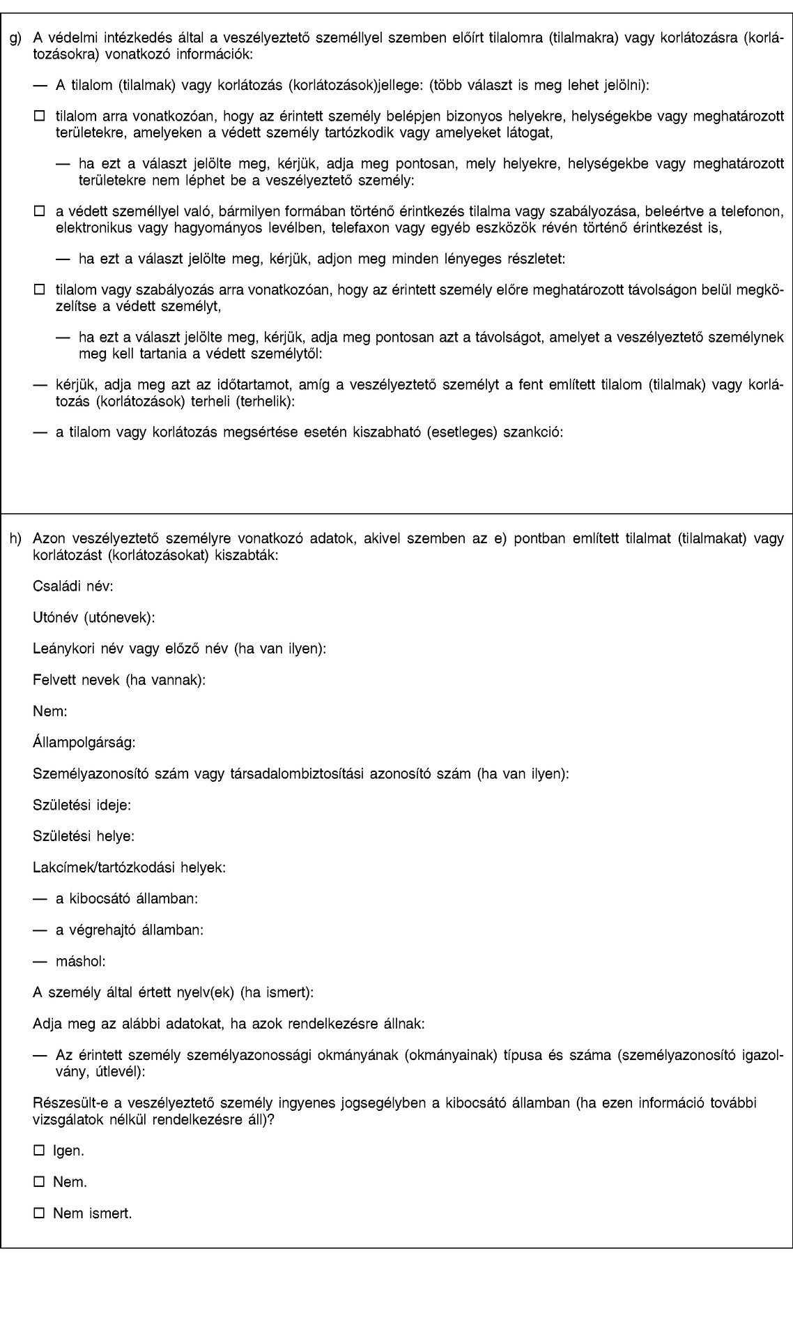 h) Azon veszélyeztető személyre vonatkozó adatok, akivel szemben az e) pontban említett tilalmat (tilalmakat) vagy korlátozást (korlátozásokat) kiszabták:
