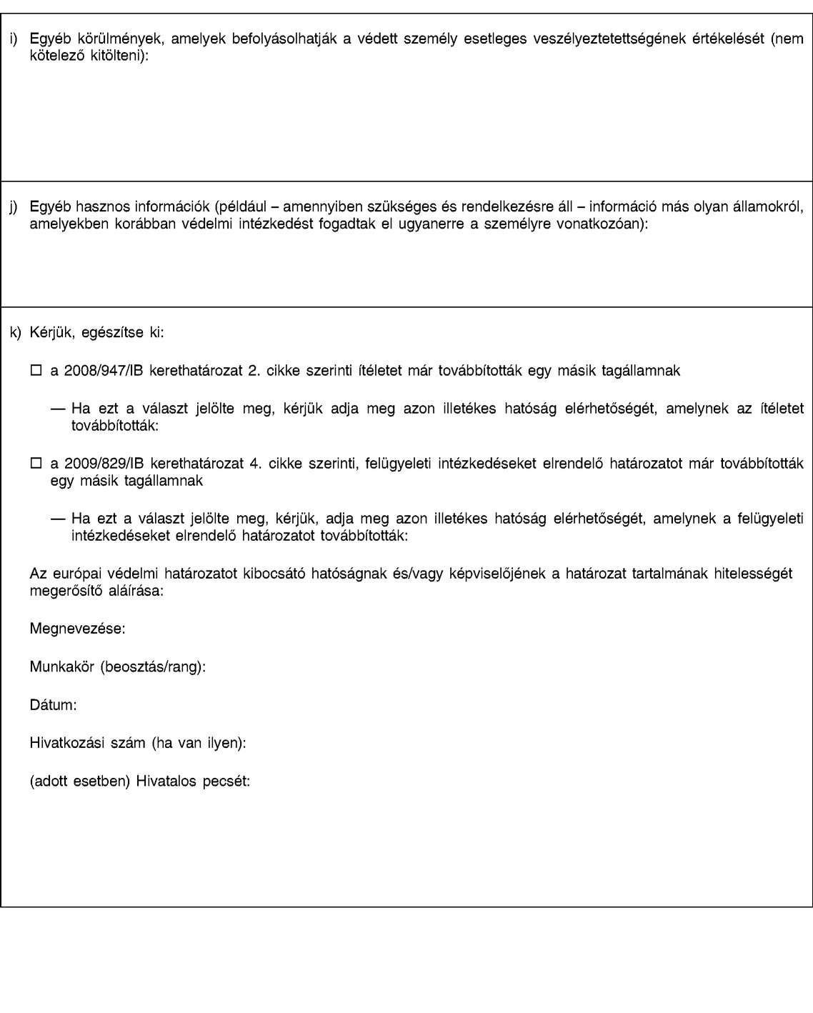 j) Egyéb hasznos információk (például - amennyiben szükséges és rendelkezésre áll - információ más olyan államokról, amelyekben korábban védelmi intézkedést fogadtak el ugyanerre a személyre vonatkozóan):