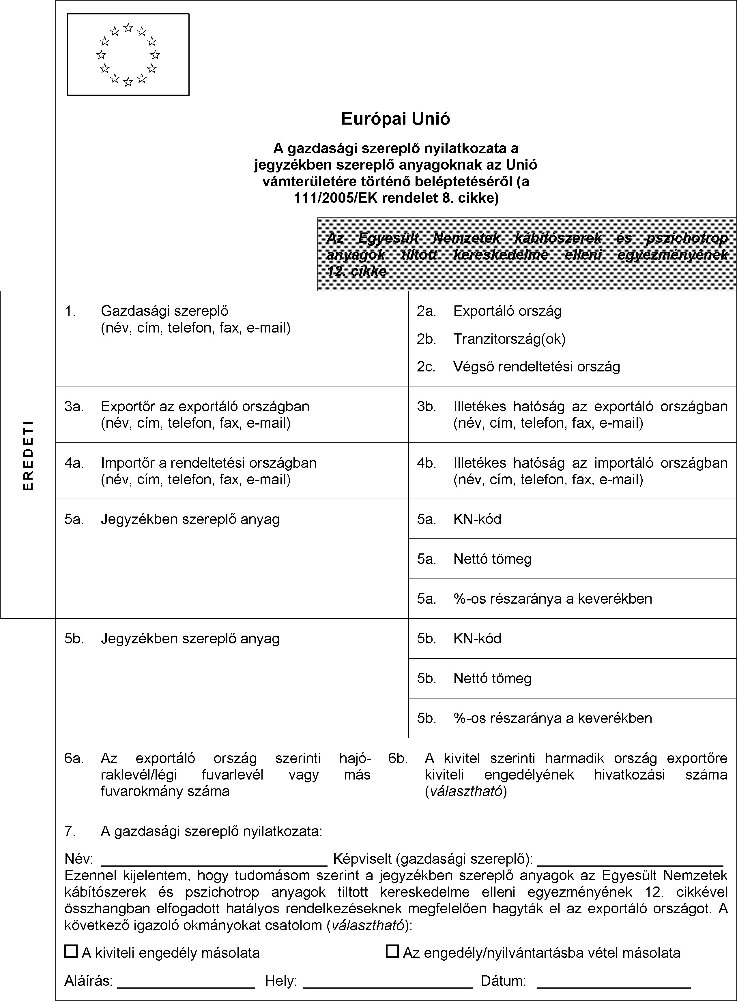 (2) E célból a gazdasági szereplőnek az e rendelet II. mellékletében meghatározott mintát kell használnia, vagy a 111/2005/EK rendelet 20. cikkében említett behozatali engedélyt vagy a 273/2004/EK rendelet 4. cikkében említett vevői nyilatkozatot kell benyújtania.