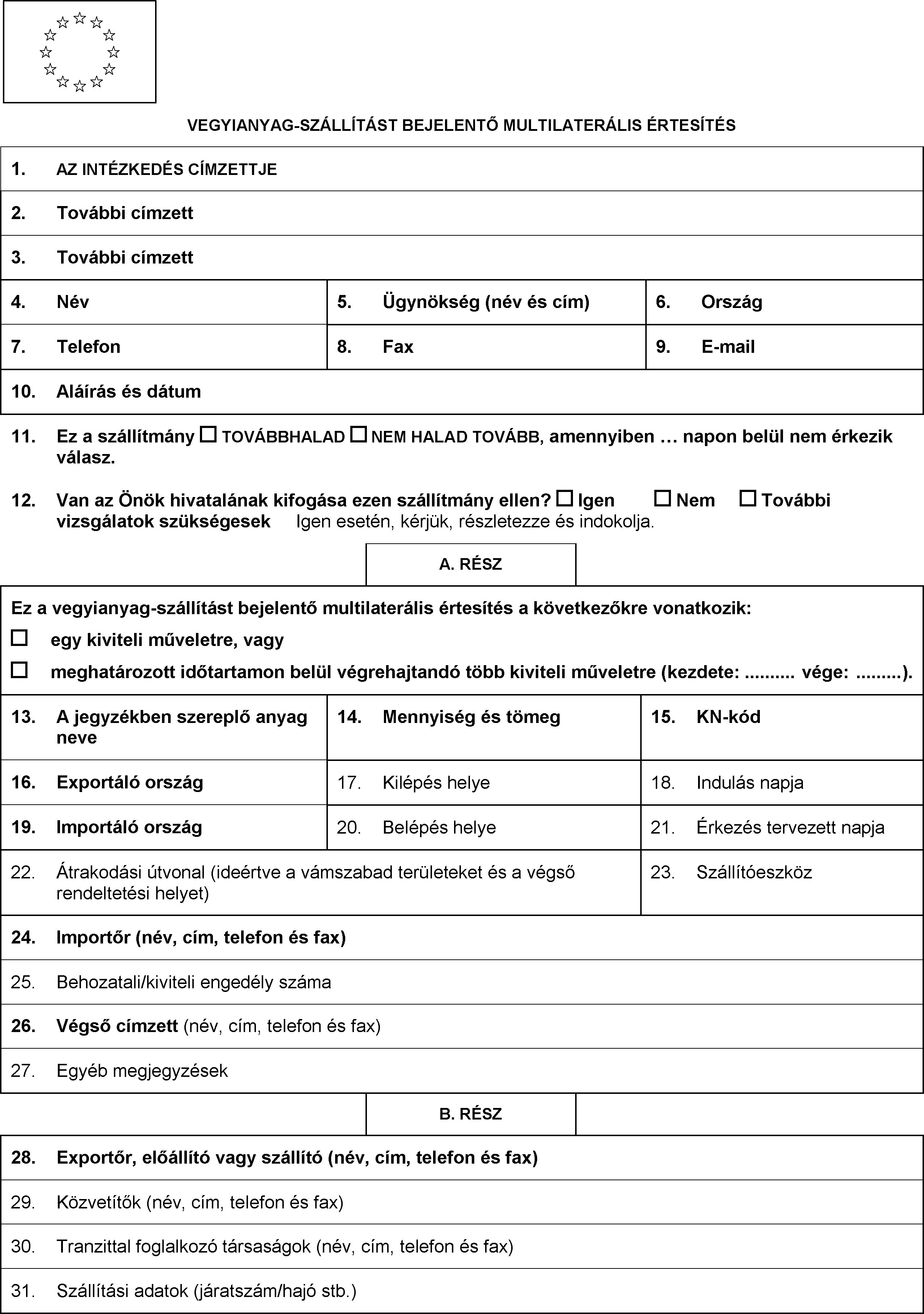 18. pont (indulás napja): A több kiviteli műveletre vonatkozó vegyianyag-szállítást bejelentő multilaterális értesítés esetén ebben a rovatban fel kell tüntetni a tervezett legvégső indulási napot.