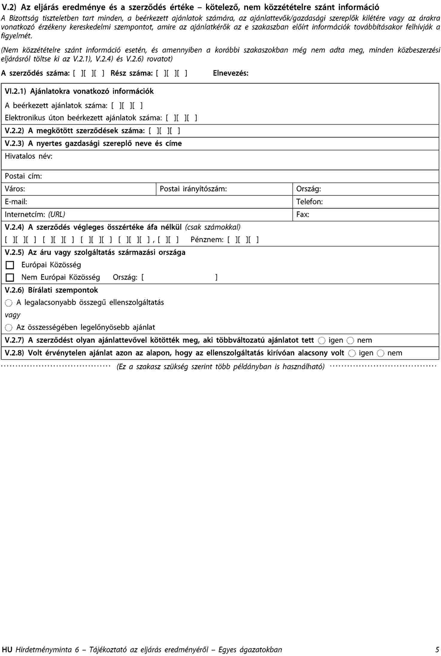 VI. melléklet: : 6. hirdetményminta : "Tájékoztató az eljárás eredményéről - Egyes ágazatokban"