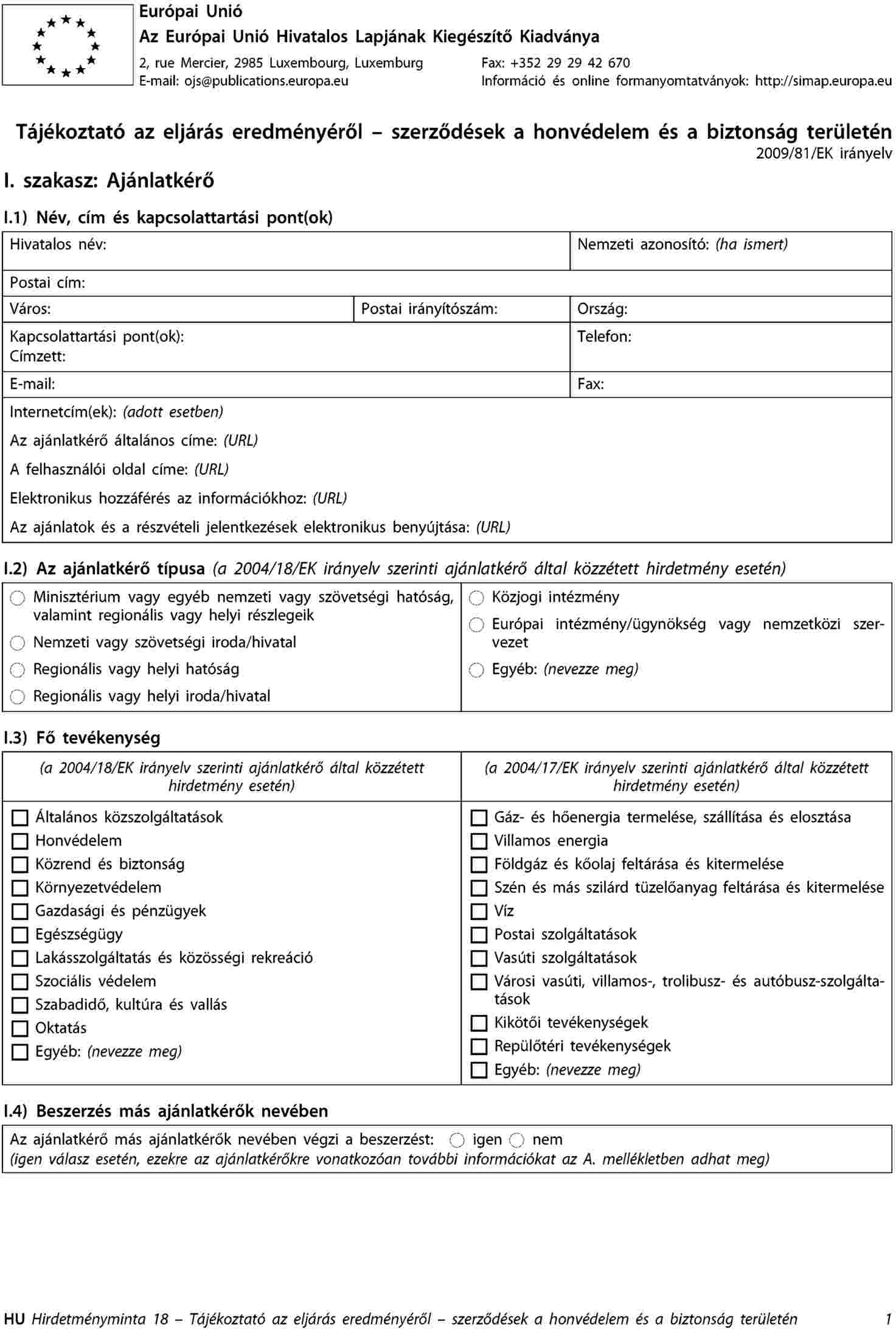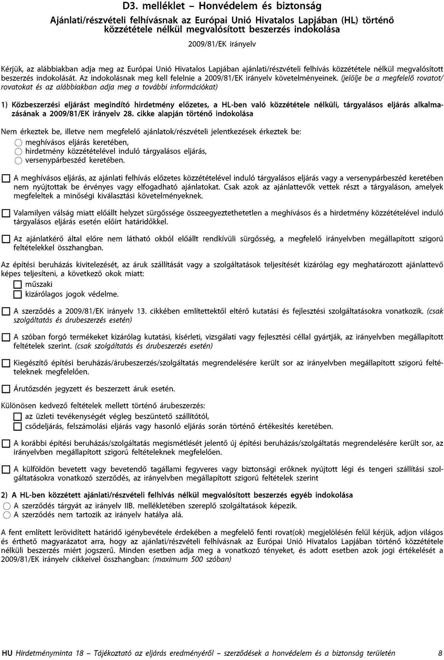 (3) A 2009/81/EK irányelv előírja, hogy a honvédelem és biztonság területén egyes építési beruházásra, árubeszerzésre és szolgáltatásnyújtásra irányuló szerződések eljárásait közzé kell tenni az Európai Unió Hivatalos Lapjában. A közzétételhez használt hirdetményekben meg kell adni az említett irányelv által előírt információkat.