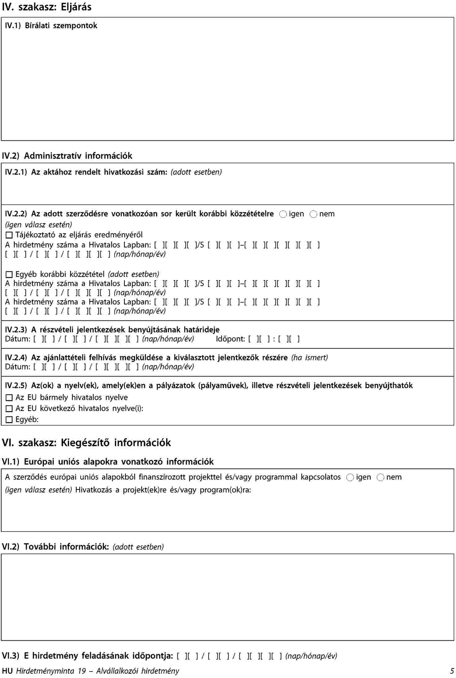 V. melléklet: : 5. hirdetményminta : "Ajánlati/részvételi felhívás - Egyes ágazatokban"
