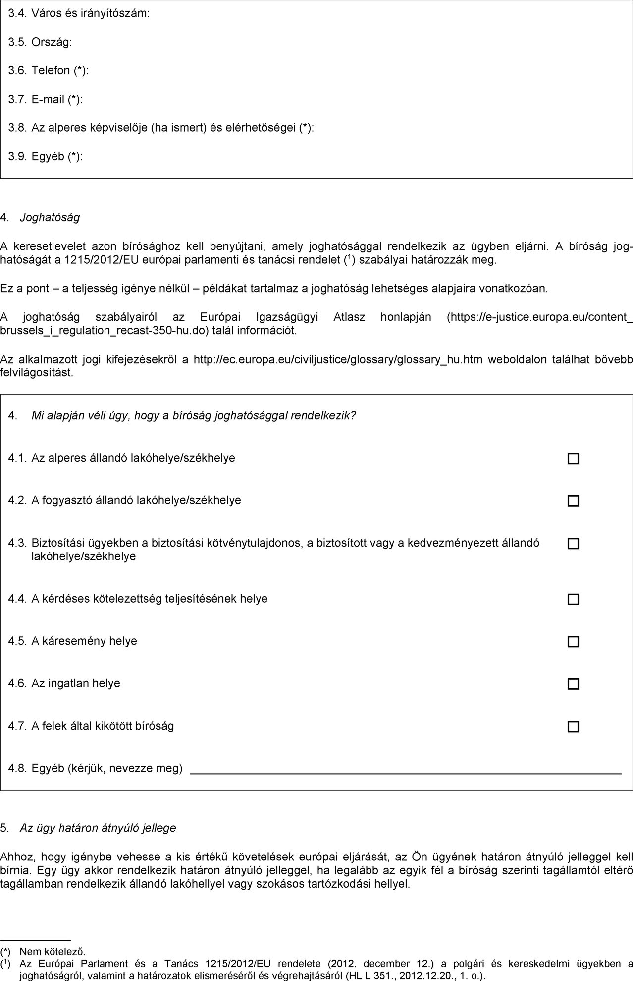Ebben a mezőben kérjük, nevezze meg azt a bíróságot, amelyhez a keresetet címezi. A bíróság megválasztásakor figyelembe kell vennie a bíróság joghatóságának alapjául szolgáló tényezőket. A 4. pontban található jegyzék -- a teljesség igénye nélkül - példákat tartalmaz a joghatóság lehetséges alapjaira vonatkozóan. A joghatósággal rendelkező bíróság elérhetőségeinek (cím, telefonszám stb.) felkutatásához igénybe veheti az európai igazságügyi portálon elérhető célzott keresőeszközt: