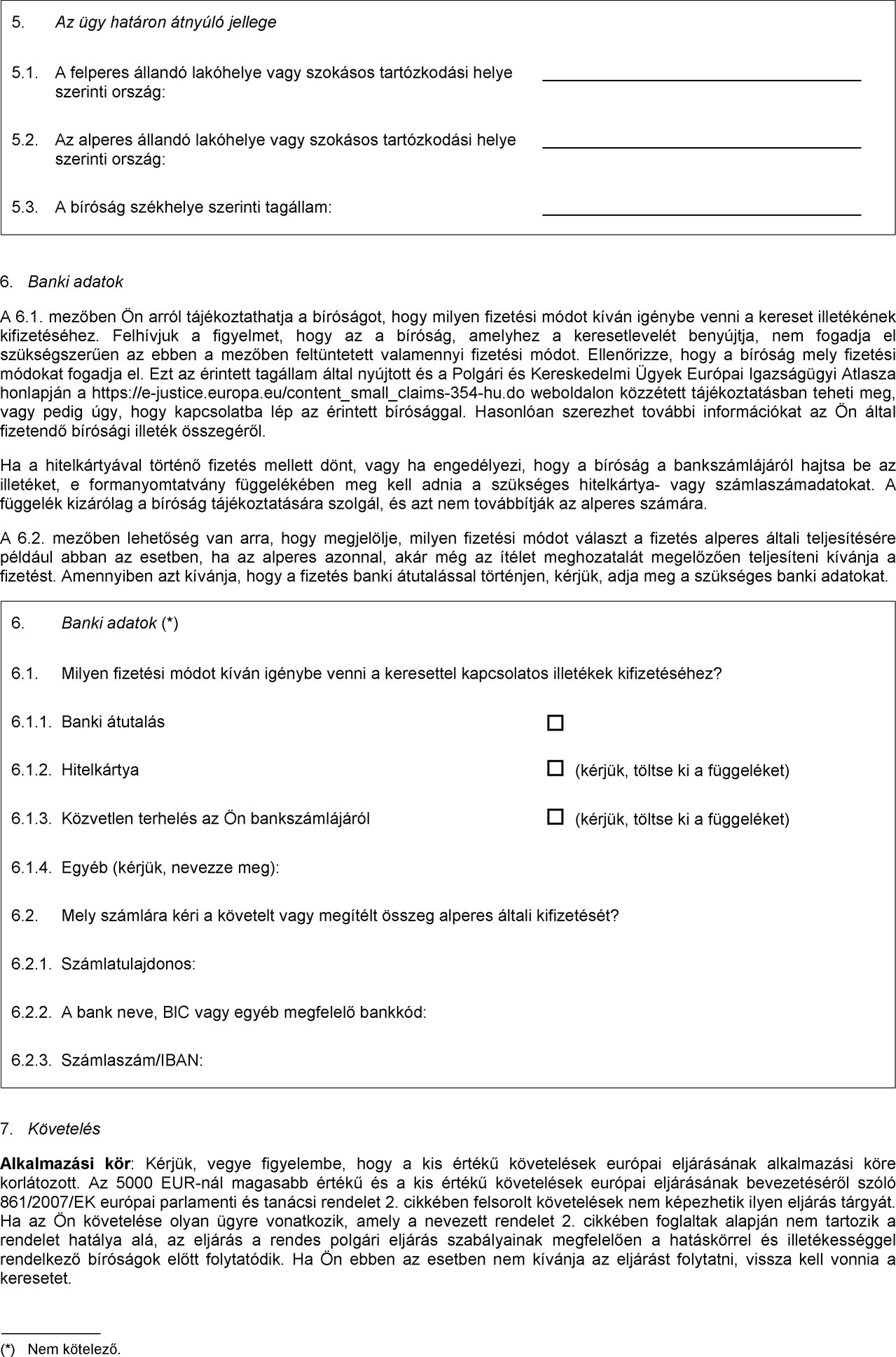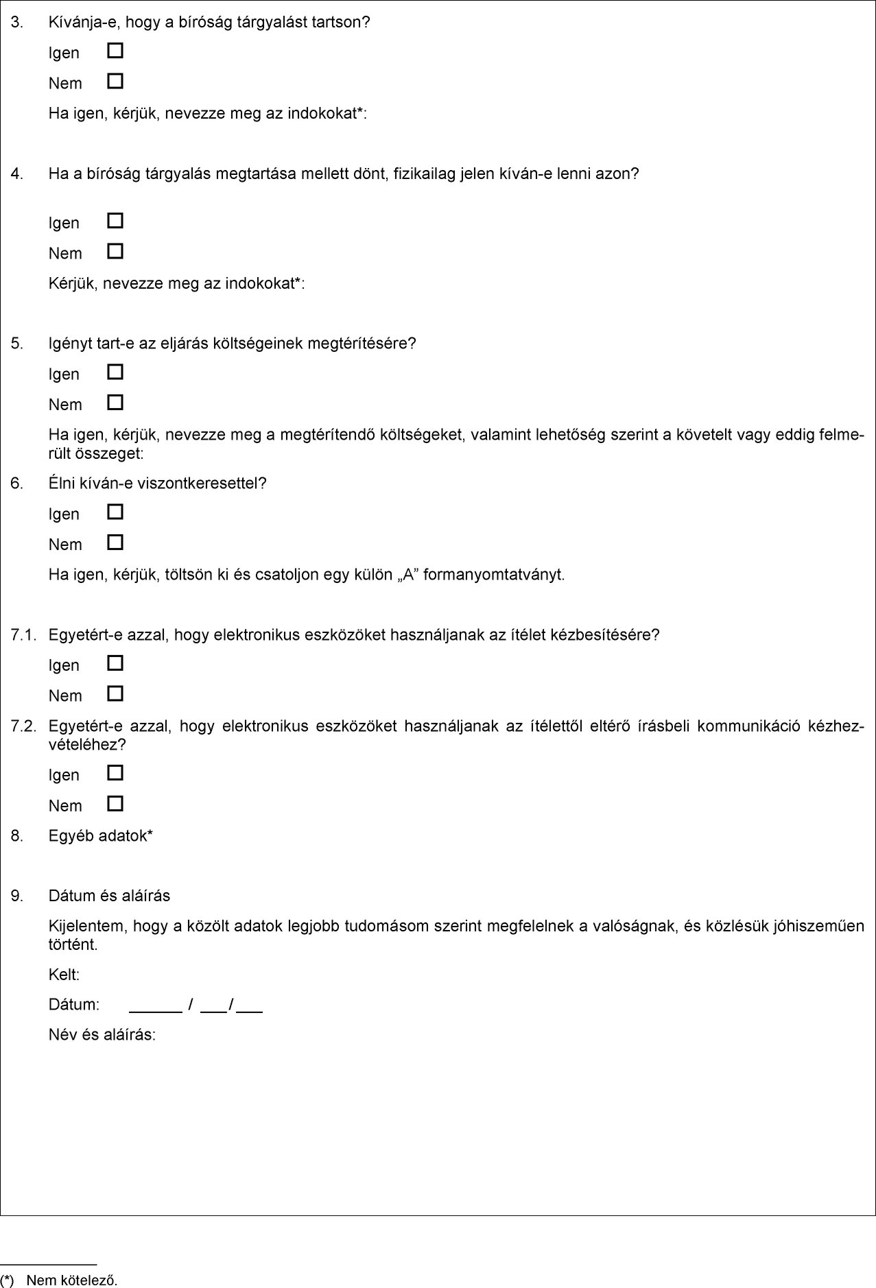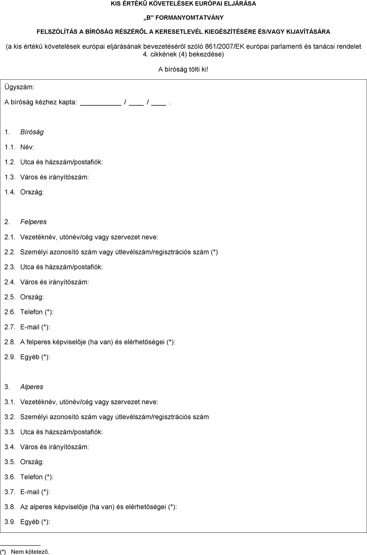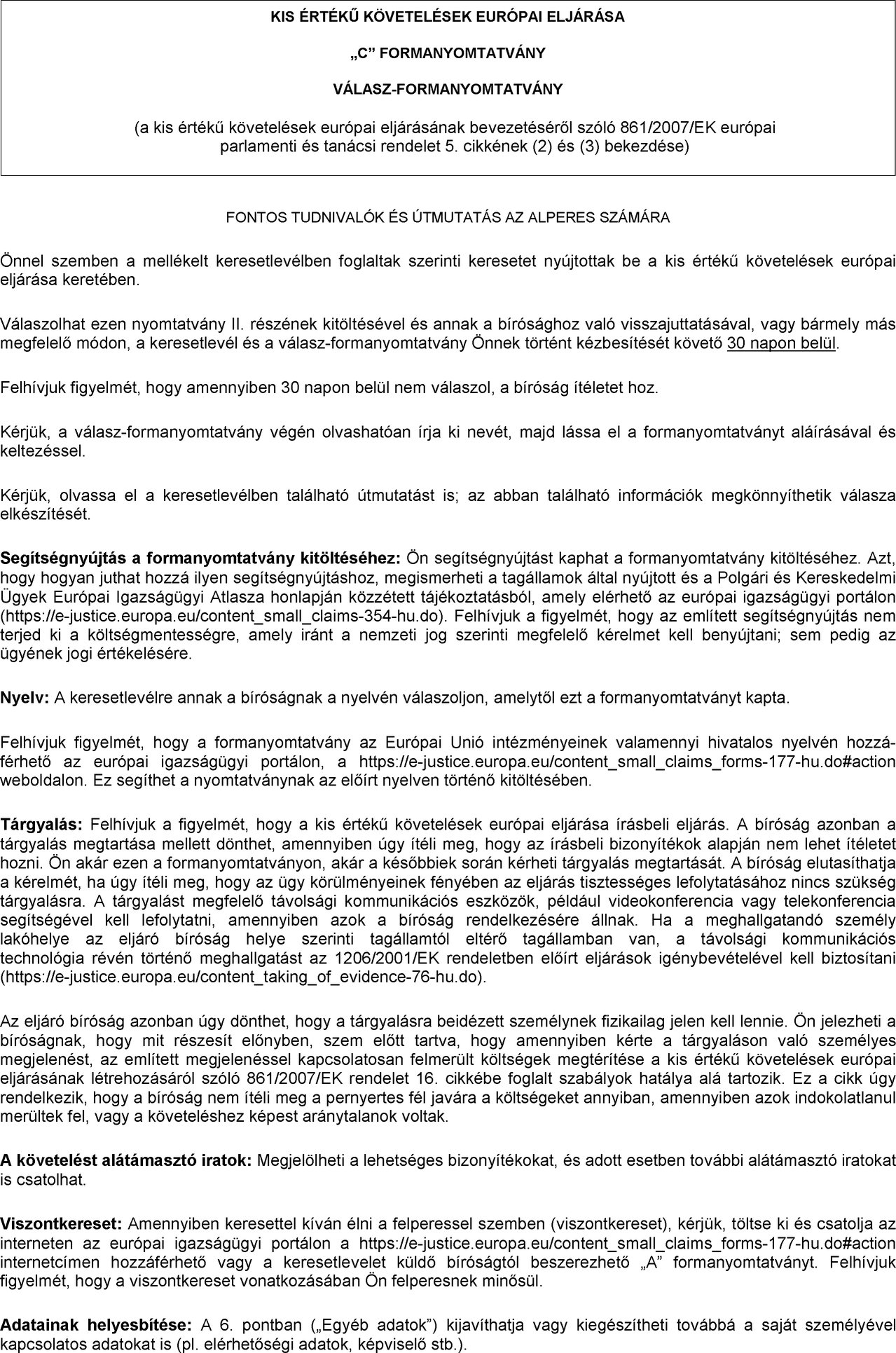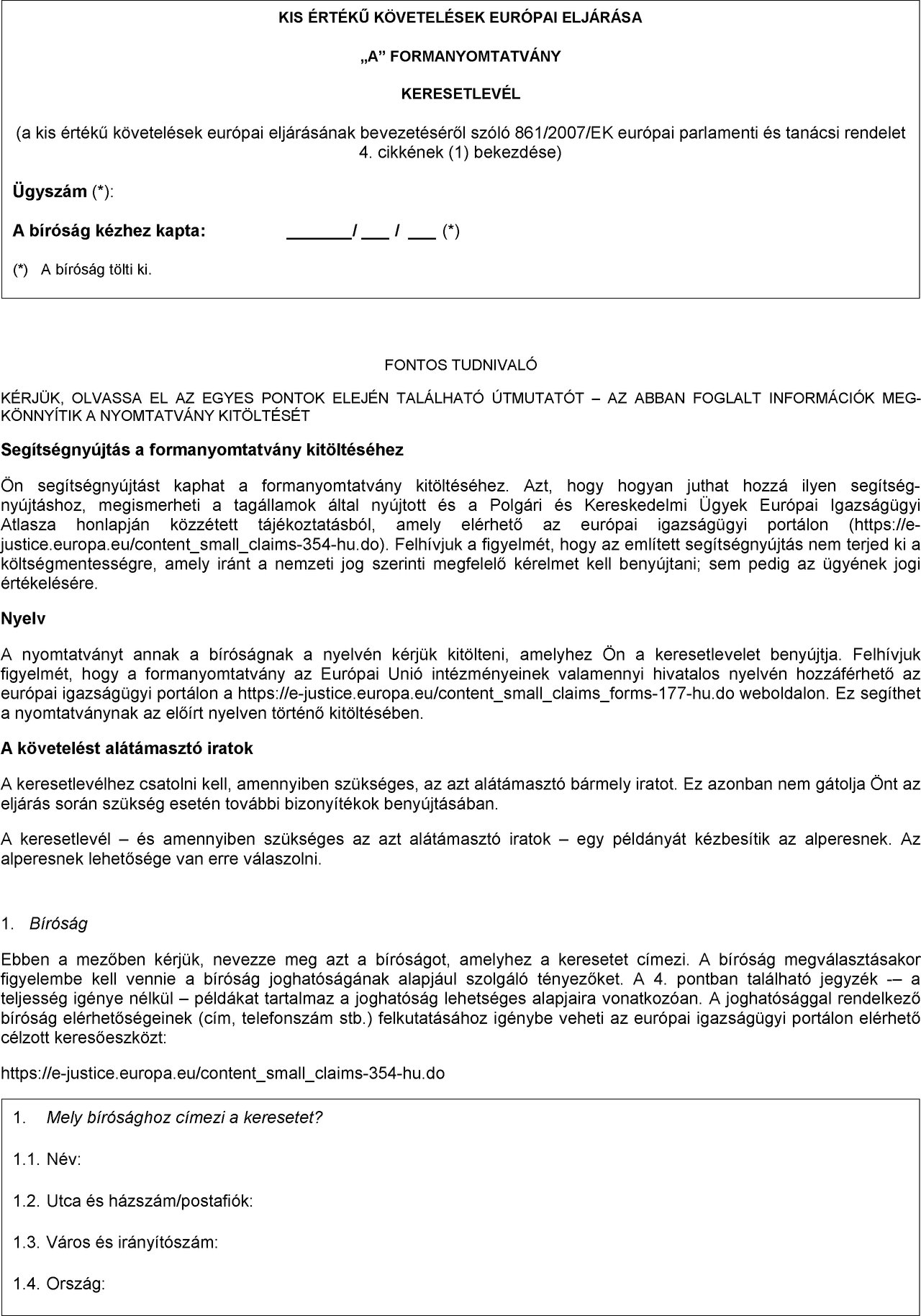 Segítségnyújtás a formanyomtatvány kitöltéséhez: Ön segítségnyújtást kaphat a formanyomtatvány kitöltéséhez. Azt, hogy hogyan juthat hozzá ilyen segítségnyújtáshoz, megismerheti a tagállamok által nyújtott és a Polgári és Kereskedelmi Ügyek Európai Igazságügyi Atlasza honlapján közzétett tájékoztatásból, amely elérhető az európai igazságügyi portálon (https://e-justice.europa.eu/content_small_claims-354-hu.do). Felhívjuk a figyelmét, hogy az említett segítségnyújtás nem terjed ki a költségmentességre, amely iránt a nemzeti jog szerinti megfelelő kérelmet kell benyújtani; sem pedig az ügyének jogi értékelésére.