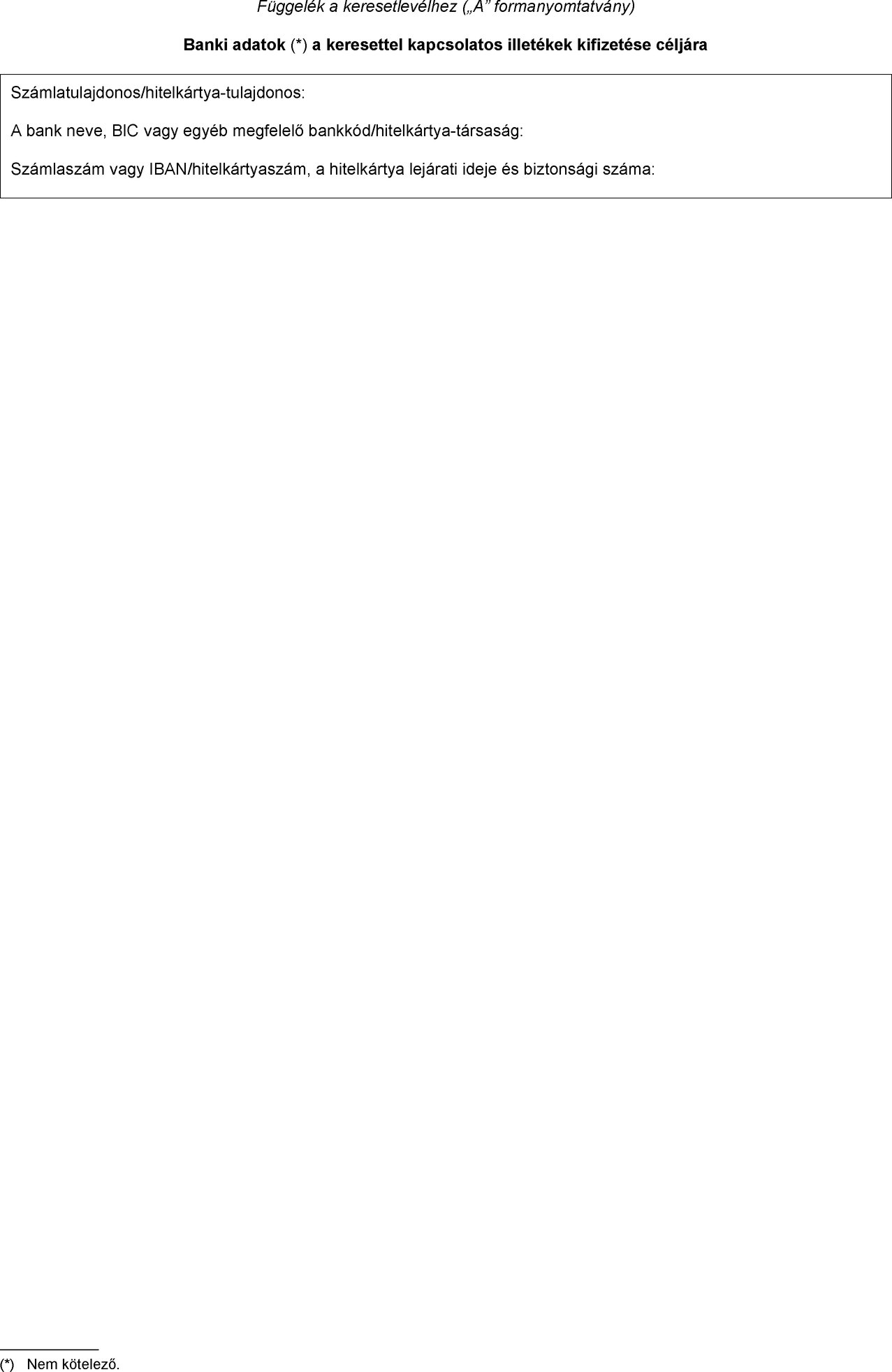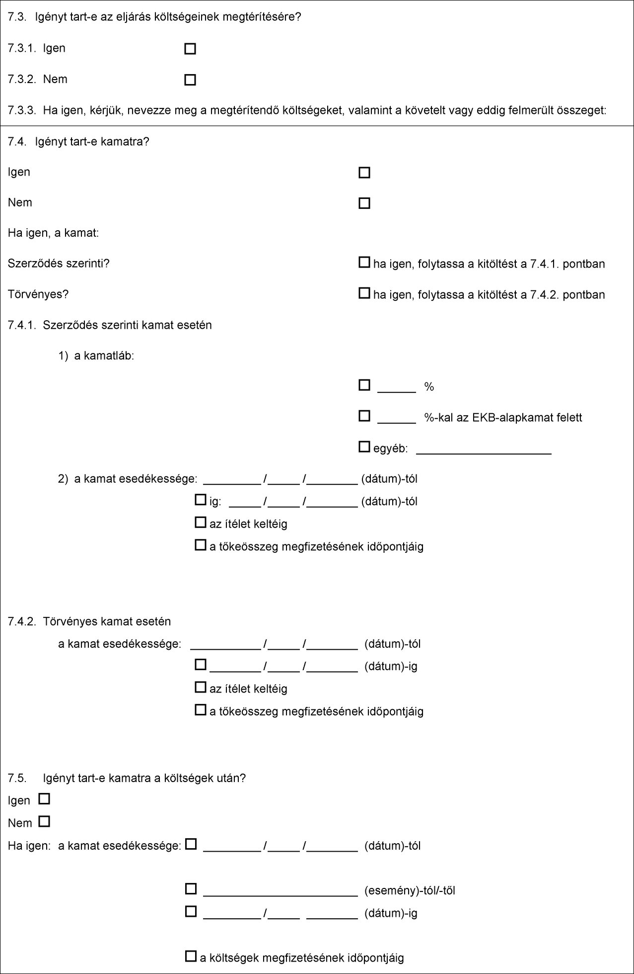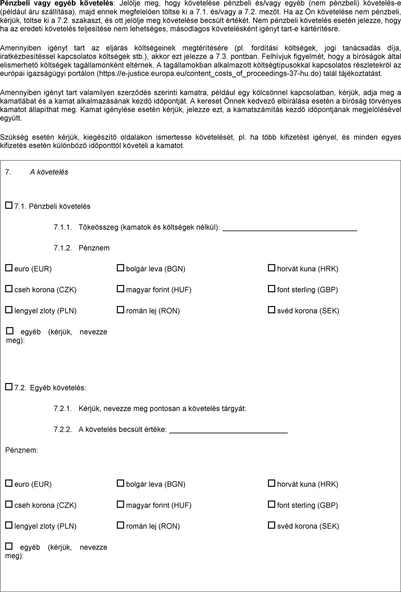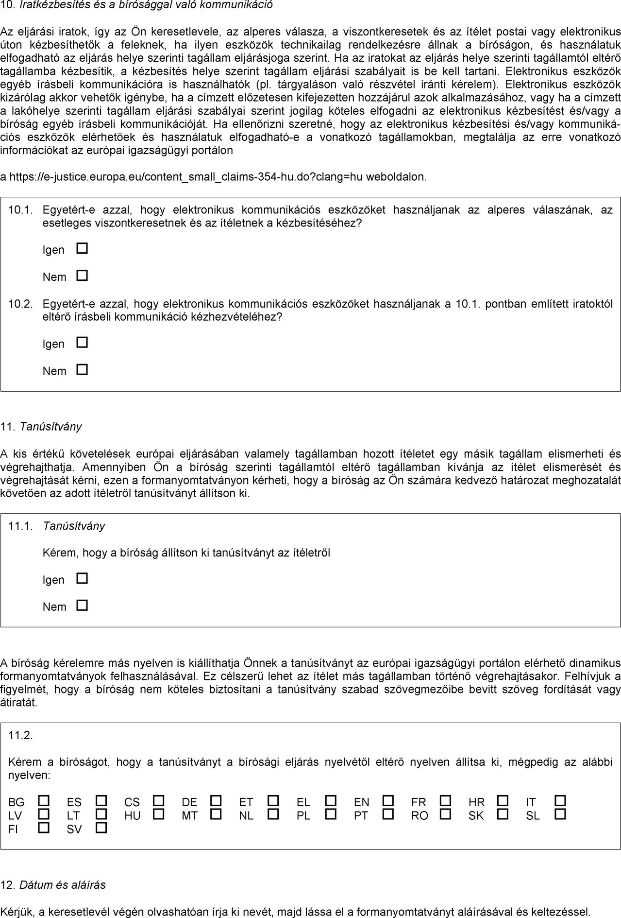 Felhívjuk figyelmét, hogy a formanyomtatvány az Európai Unió intézményeinek valamennyi hivatalos nyelvén hozzá-férhető az európai igazságügyi portálon, a https://e-justice.europa.eu/content_small_claims_forms-177-hu.do#action weboldalon. Ez segíthet a nyomtatványnak az előírt nyelven történő kitöltésében.