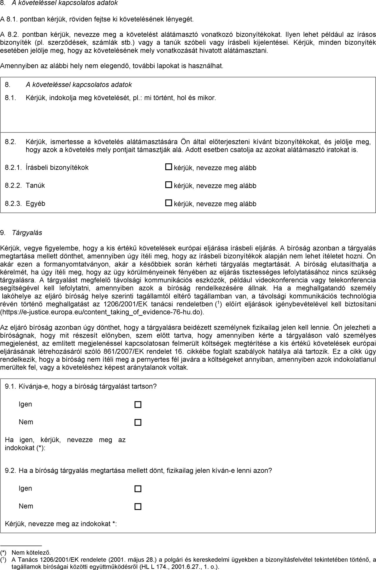 Tárgyalás: Felhívjuk a figyelmét, hogy a kis értékű követelések európai eljárása írásbeli eljárás. A bíróság azonban a tárgyalás megtartása mellett dönthet, amennyiben úgy ítéli meg, hogy az írásbeli bizonyítékok alapján nem lehet ítéletet hozni. Ön akár ezen a formanyomtatványon, akár a későbbiek során kérheti tárgyalás megtartását. A bíróság elutasíthatja a kérelmét, ha úgy ítéli meg, hogy az ügy körülményeinek fényében az eljárás tisztességes lefolytatásához nincs szükség tárgyalásra. A tárgyalást megfelelő távolsági kommunikációs eszközök, például videokonferencia vagy telekonferencia segítségével kell lefolytatni, amennyiben azok a bíróság rendelkezésére állnak. Ha a meghallgatandó személy lakóhelye az eljáró bíróság helye szerinti tagállamtól eltérő tagállamban van, a távolsági kommunikációs technológia révén történő meghallgatást az 1206/2001/EK rendeletben előírt eljárások igénybevételével kell biztosítani (https://e-justice.europa.eu/content_taking_of_evidence-76-hu.do).