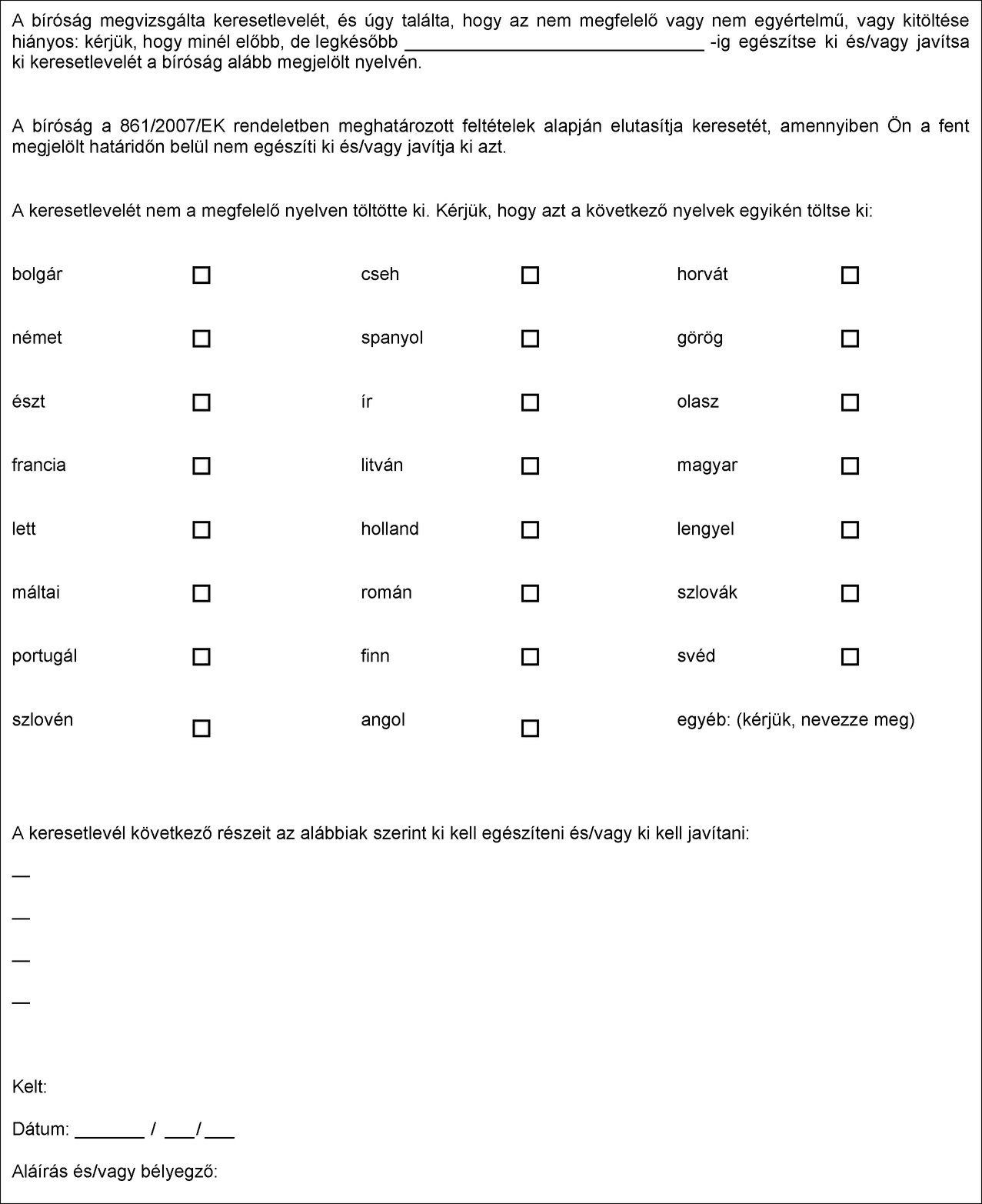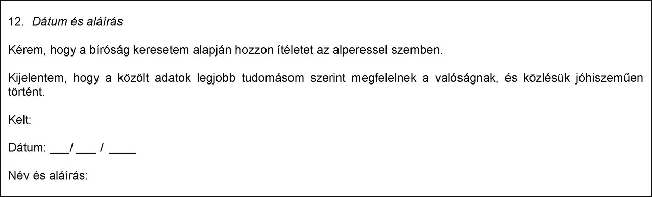 A nyomtatványt annak a bíróságnak a nyelvén kérjük kitölteni, amelyhez Ön a keresetlevelet benyújtja. Felhívjuk figyelmét, hogy a formanyomtatvány az Európai Unió intézményeinek valamennyi hivatalos nyelvén hozzáférhető az európai igazságügyi portálon a https://e-justice.europa.eu/content_small_claims_forms-177-hu.do weboldalon. Ez segíthet a nyomtatványnak az előírt nyelven történő kitöltésében.
