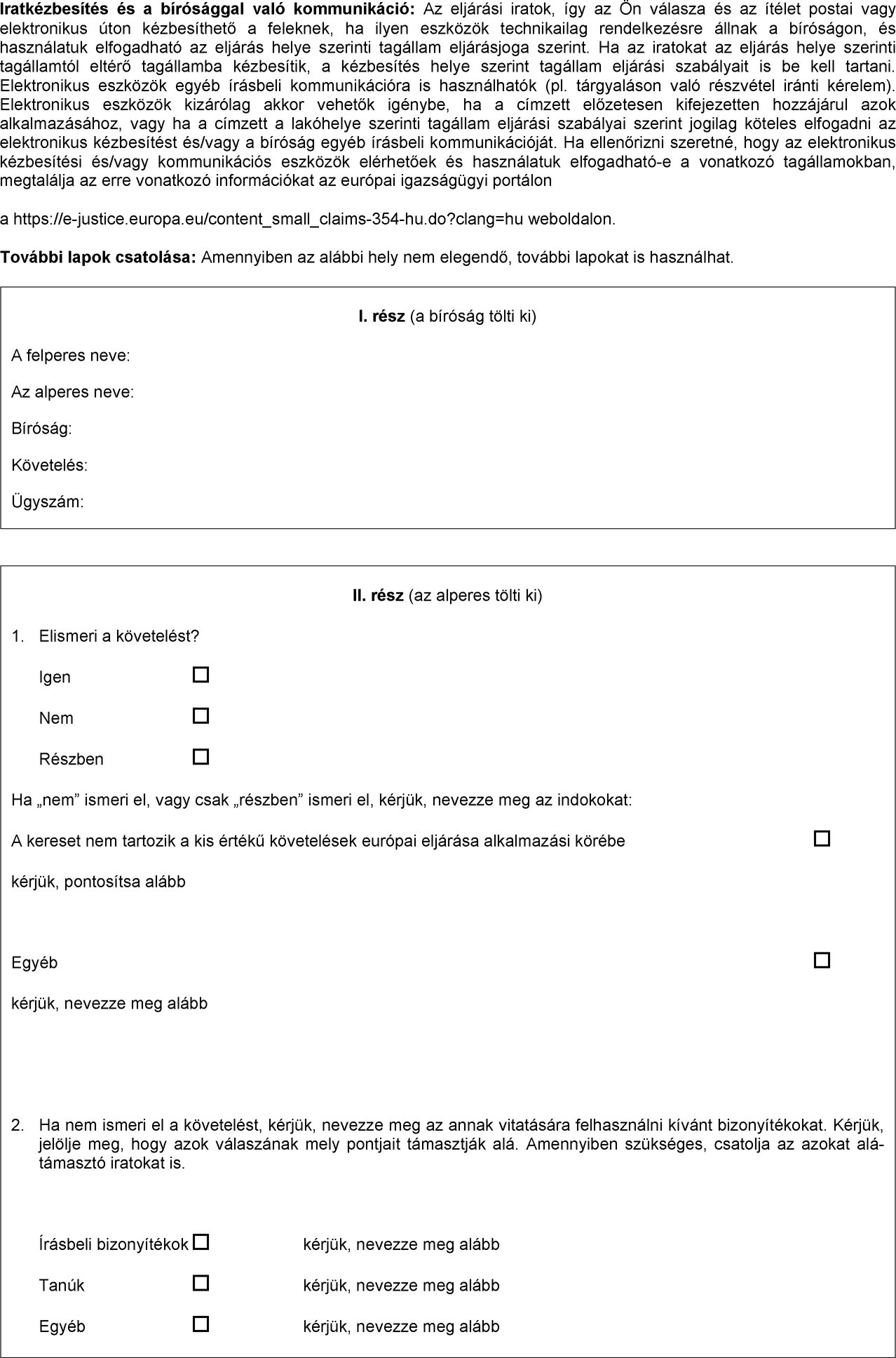 Iratkézbesítés és a bírósággal való kommunikáció: Az eljárási iratok, így az Ön válasza és az ítélet postai vagy elektronikus úton kézbesíthető a feleknek, ha ilyen eszközök technikailag rendelkezésre állnak a bíróságon, és használatuk elfogadható az eljárás helye szerinti tagállam eljárásjoga szerint. Ha az iratokat az eljárás helye szerinti tagállamtól eltérő tagállamba kézbesítik, a kézbesítés helye szerint tagállam eljárási szabályait is be kell tartani. Elektronikus eszközök egyéb írásbeli kommunikációra is használhatók (pl. tárgyaláson való részvétel iránti kérelem). Elektronikus eszközök kizárólag akkor vehetők igénybe, ha a címzett előzetesen kifejezetten hozzájárul azok alkalmazásához, vagy ha a címzett a lakóhelye szerinti tagállam eljárási szabályai szerint jogilag köteles elfogadni az elektronikus kézbesítést és/vagy a bíróság egyéb írásbeli kommunikációját. Ha ellenőrizni szeretné, hogy az elektronikus kézbesítési és/vagy kommunikációs eszközök elérhetőek és használatuk elfogadható-e a vonatkozó tagállamokban, megtalálja az erre vonatkozó információkat az európai igazságügyi portálon